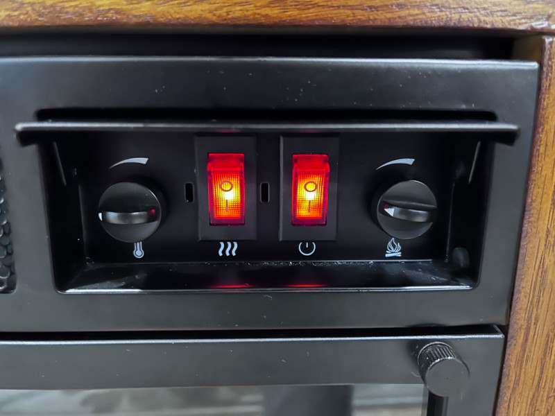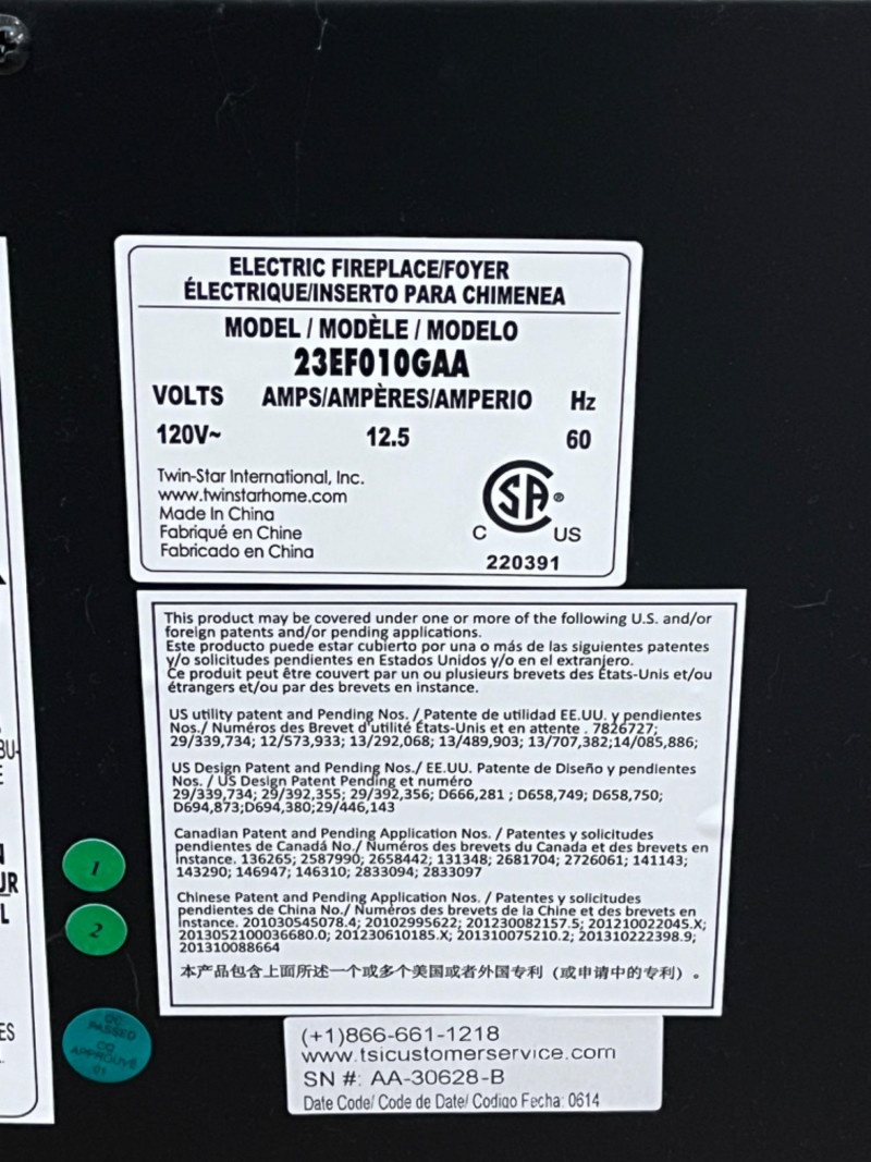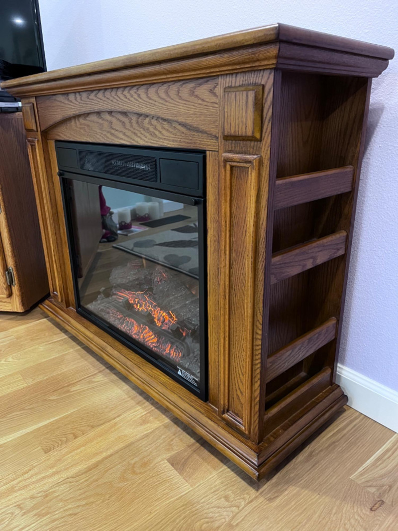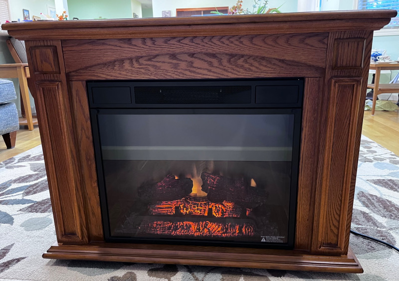 Features a realistic flame effect with glowing logs and an ember bed, and it functions as an electric forced-air heater with a built-in thermostat.