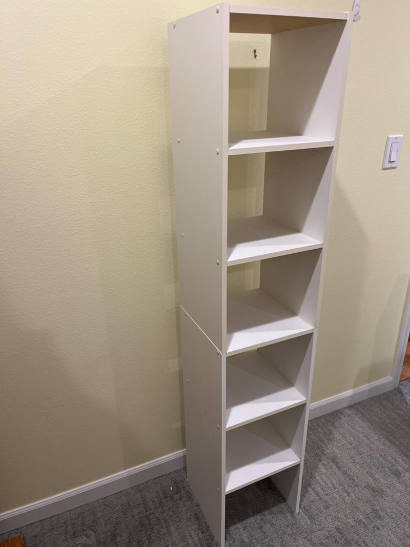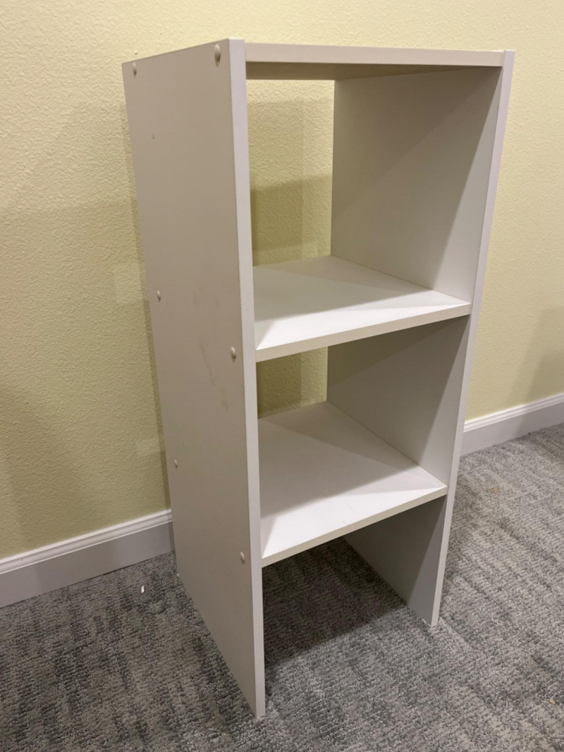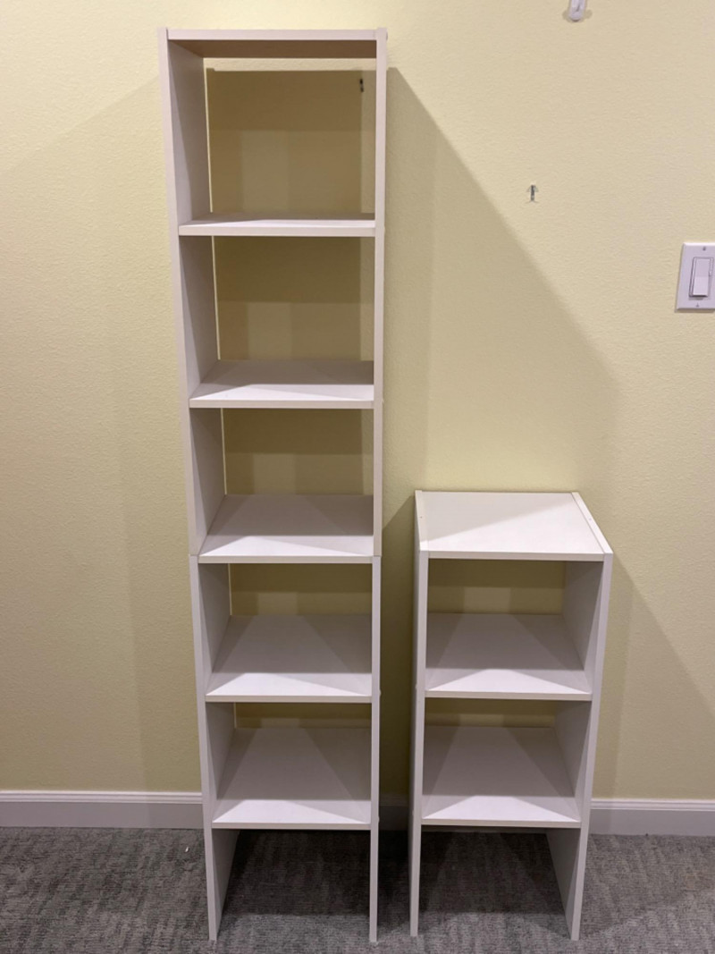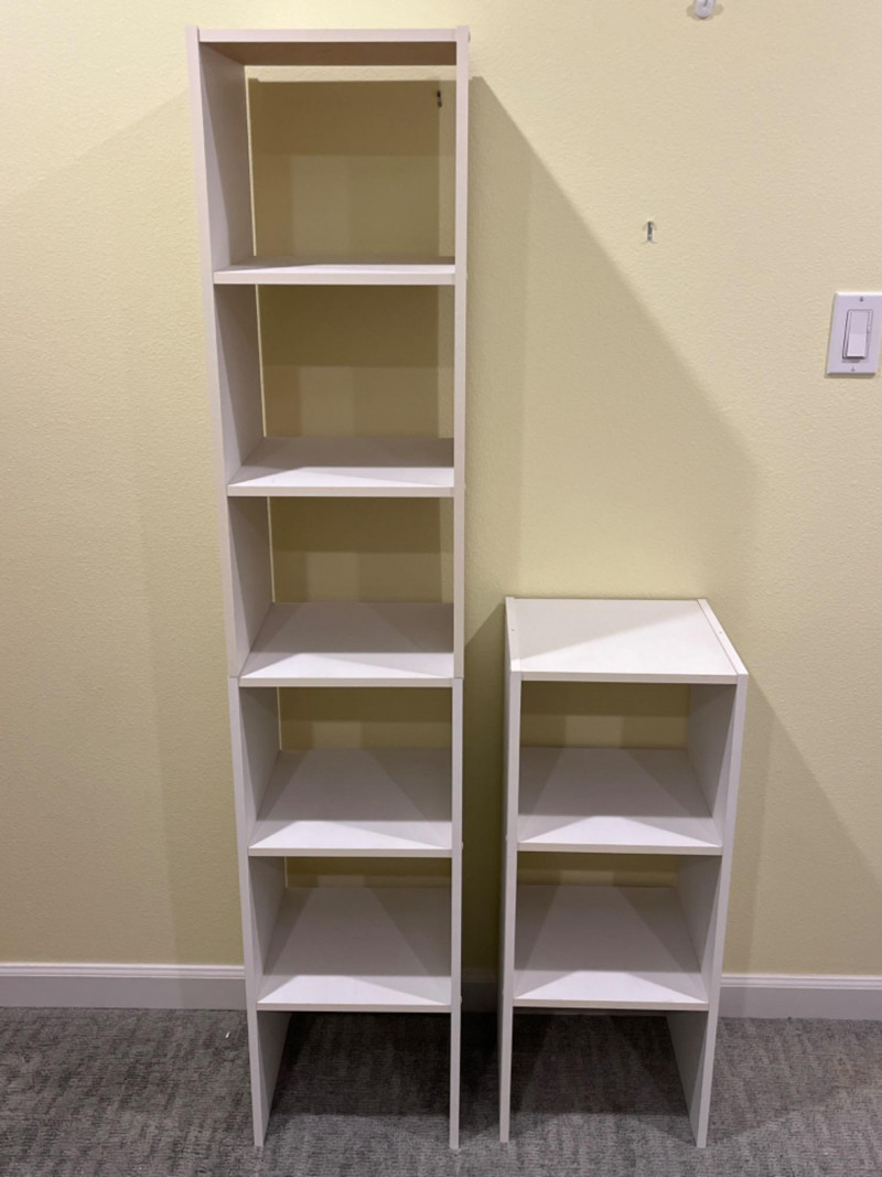 (3) Same size white ClosetMaid stackable organizers Open back, and photos show 2 stacked units. 12”x11.5”x30”