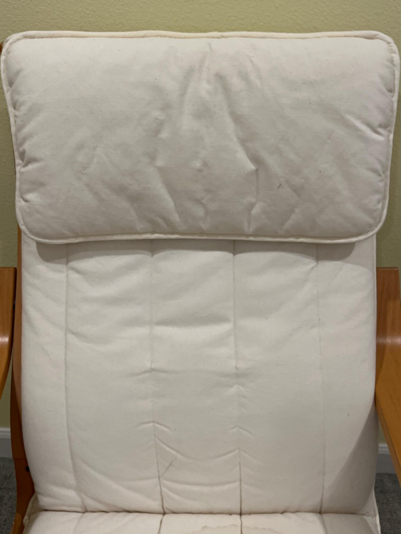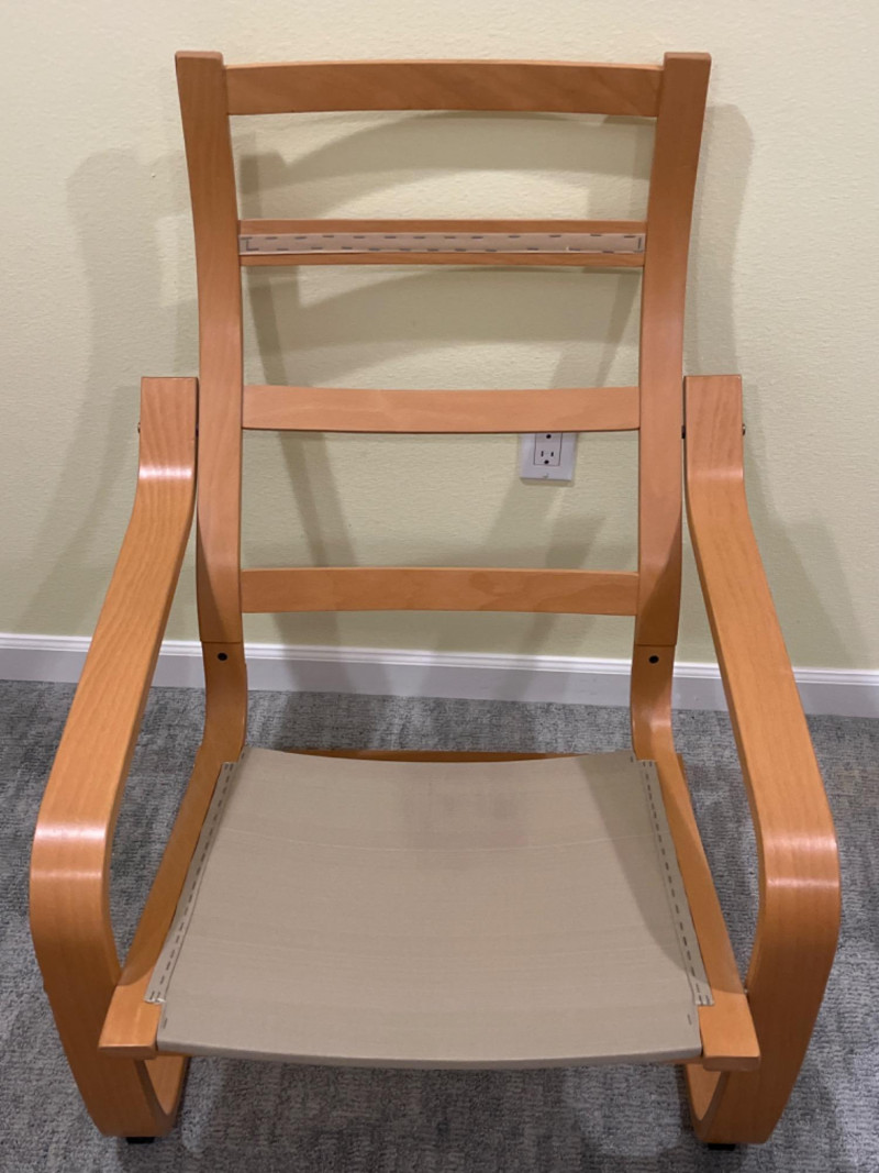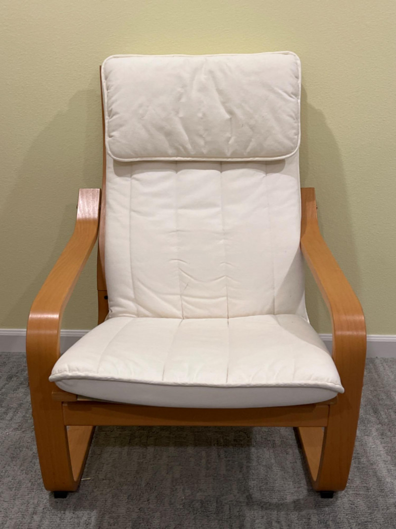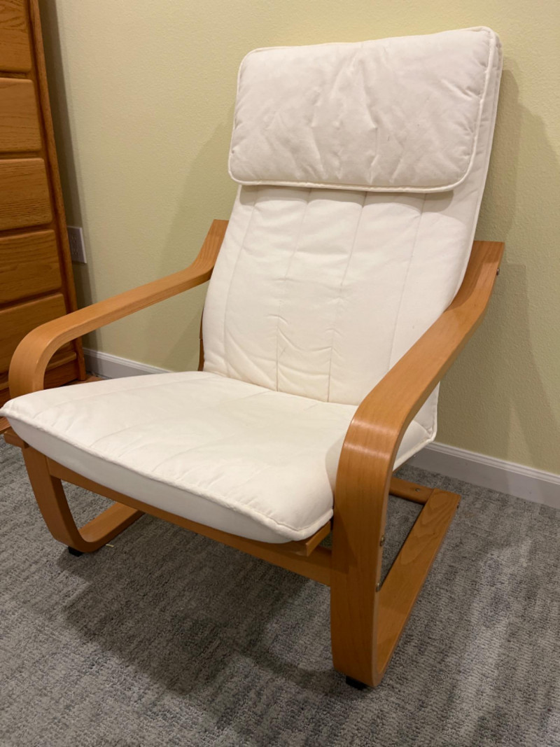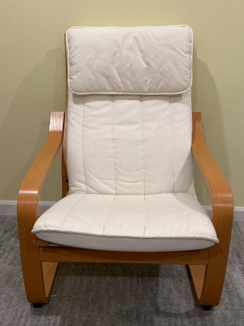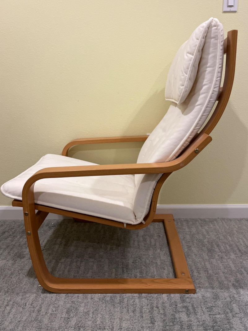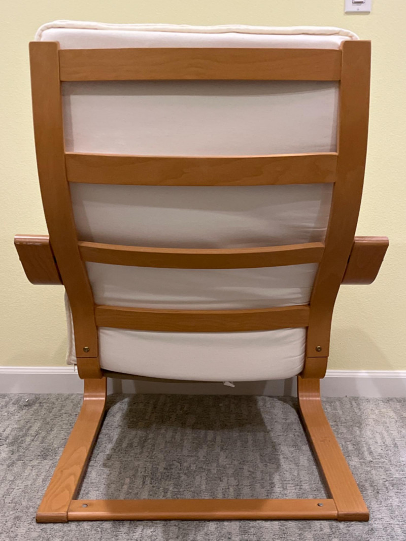 IKEA POÄNG Wood Armchair with White Cushion 27”x30”x36.5” Seat height is 15.5”.