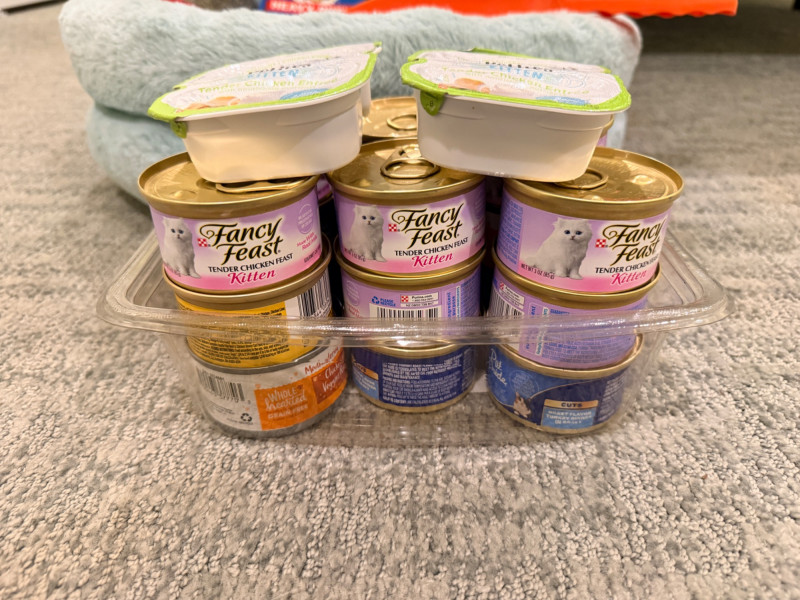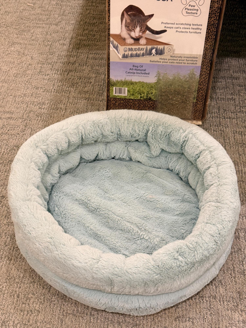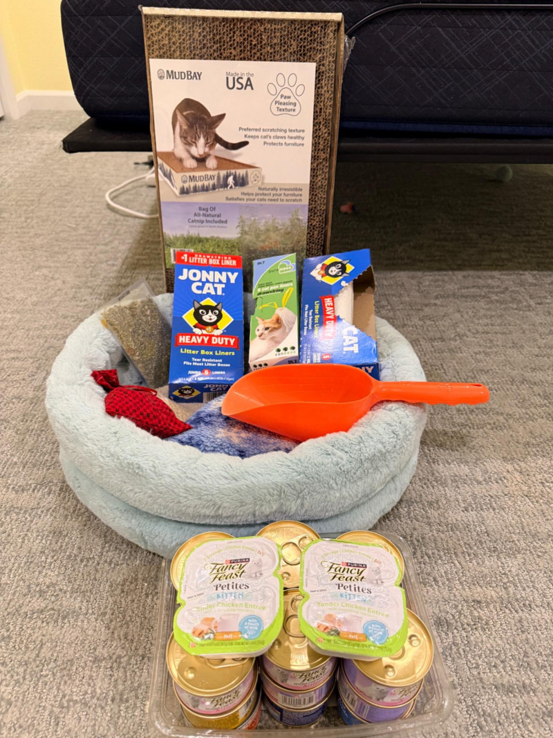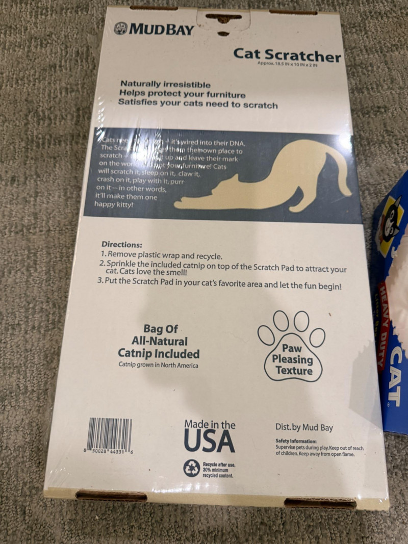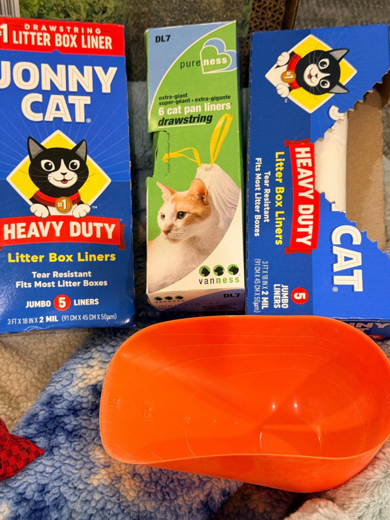 Cat Collection #2 20 cans of Fancy Feast 1.5 boxes of Jumbo litter liners partial box of drawstring cat pan liners Large litter scoop 2 small fleece blankets NIP Mud Bay corrugated cat scratching box Extra catnip