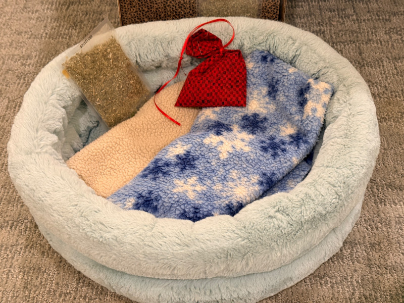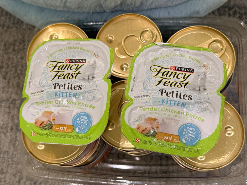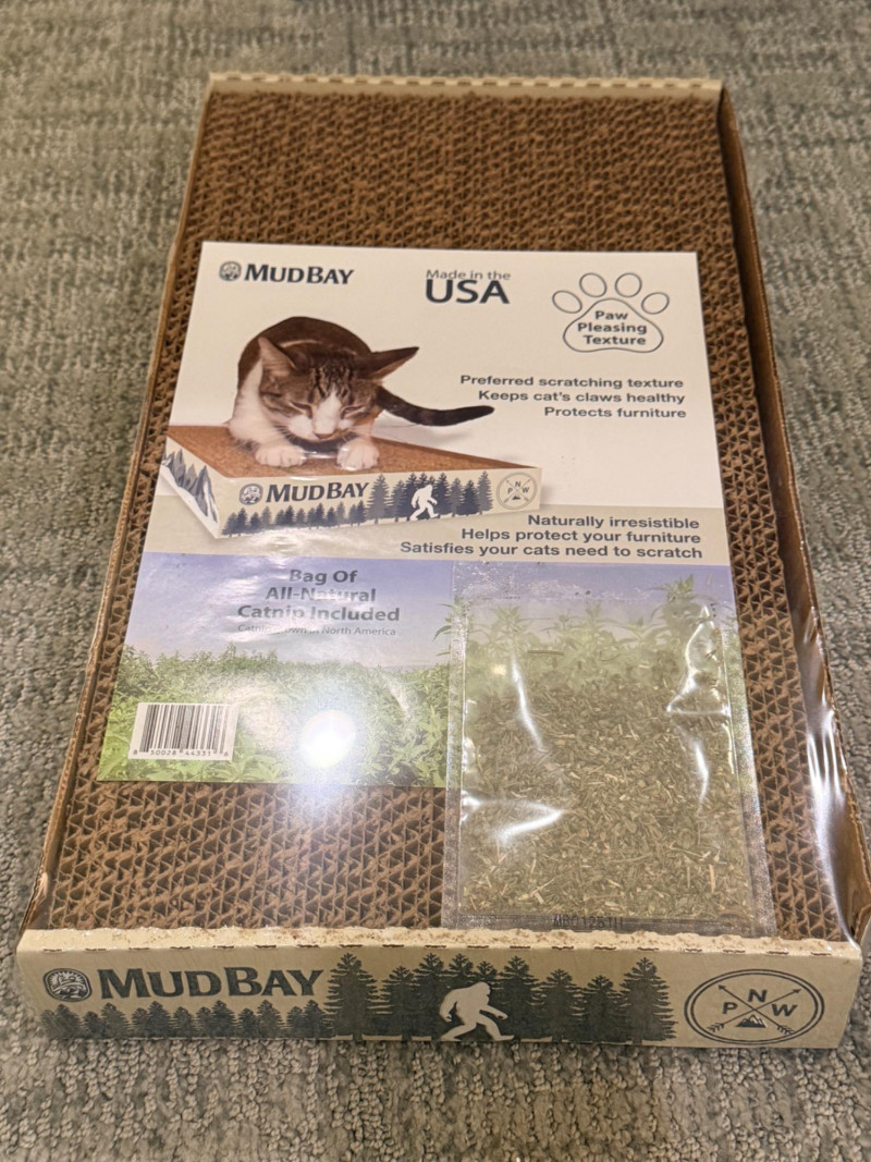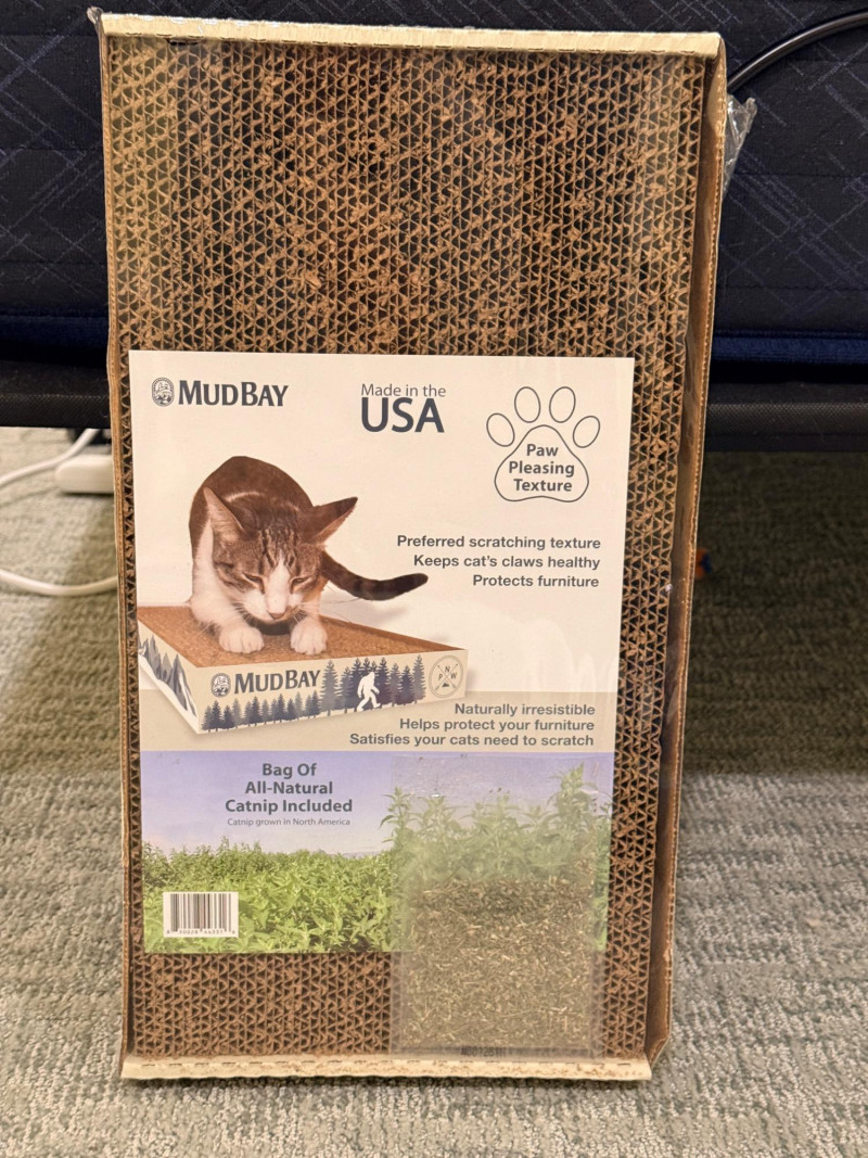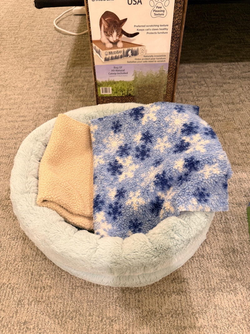 Cat Collection #2 20 cans of Fancy Feast 1.5 boxes of Jumbo litter liners partial box of drawstring cat pan liners Large litter scoop 2 small fleece blankets NIP Mud Bay corrugated cat scratching box Extra catnip