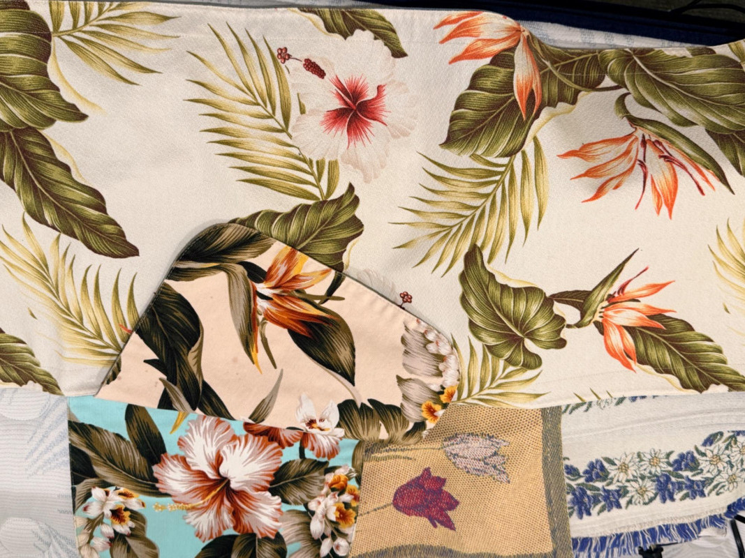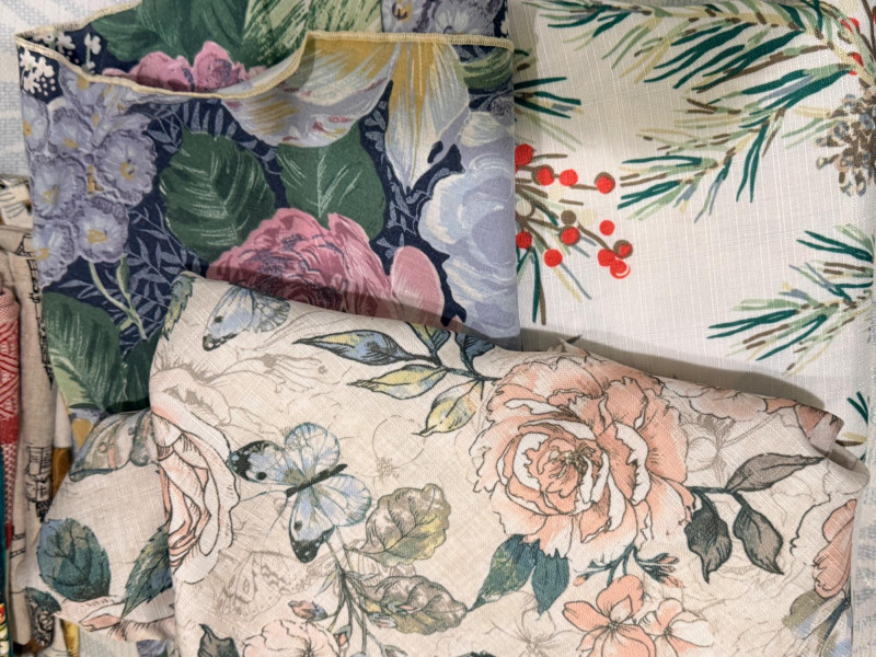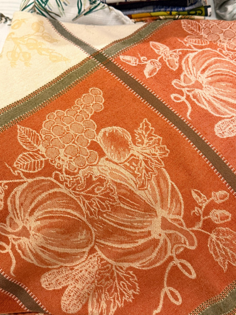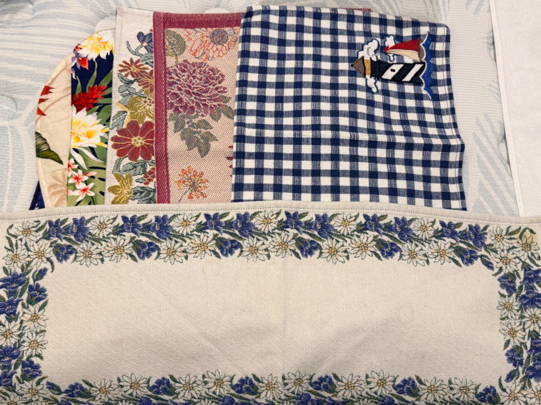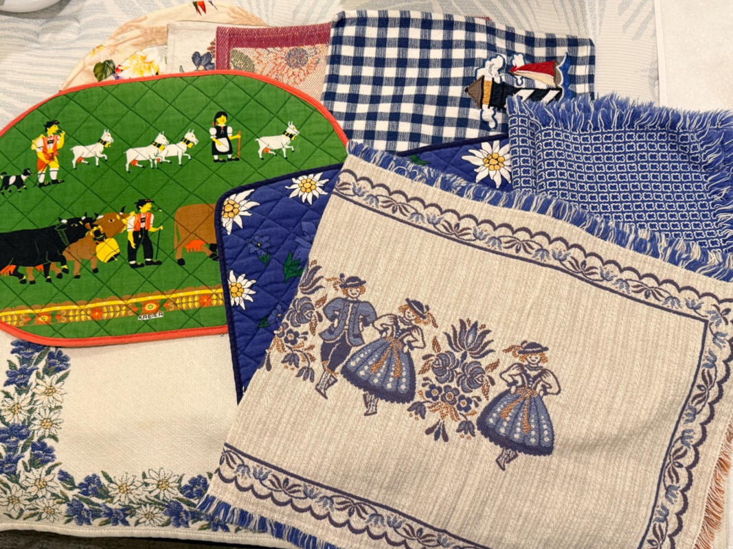 8 Seasonal round table linens with numerous placemats and runners.