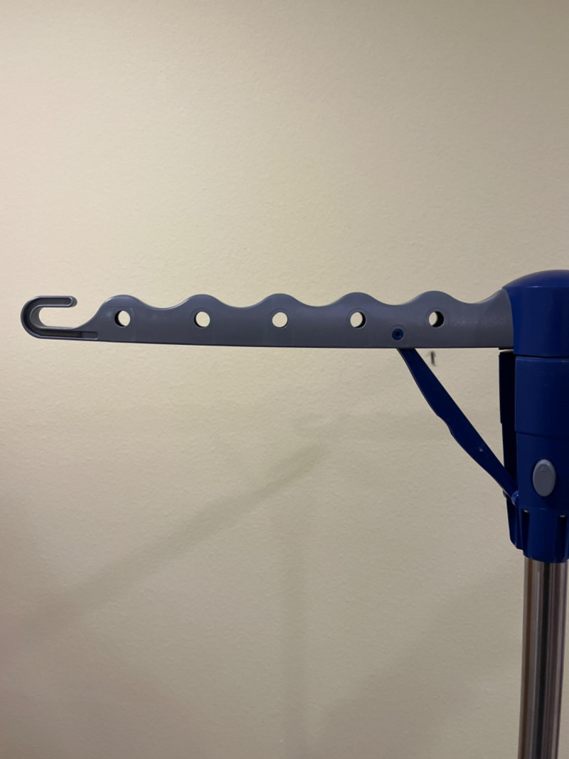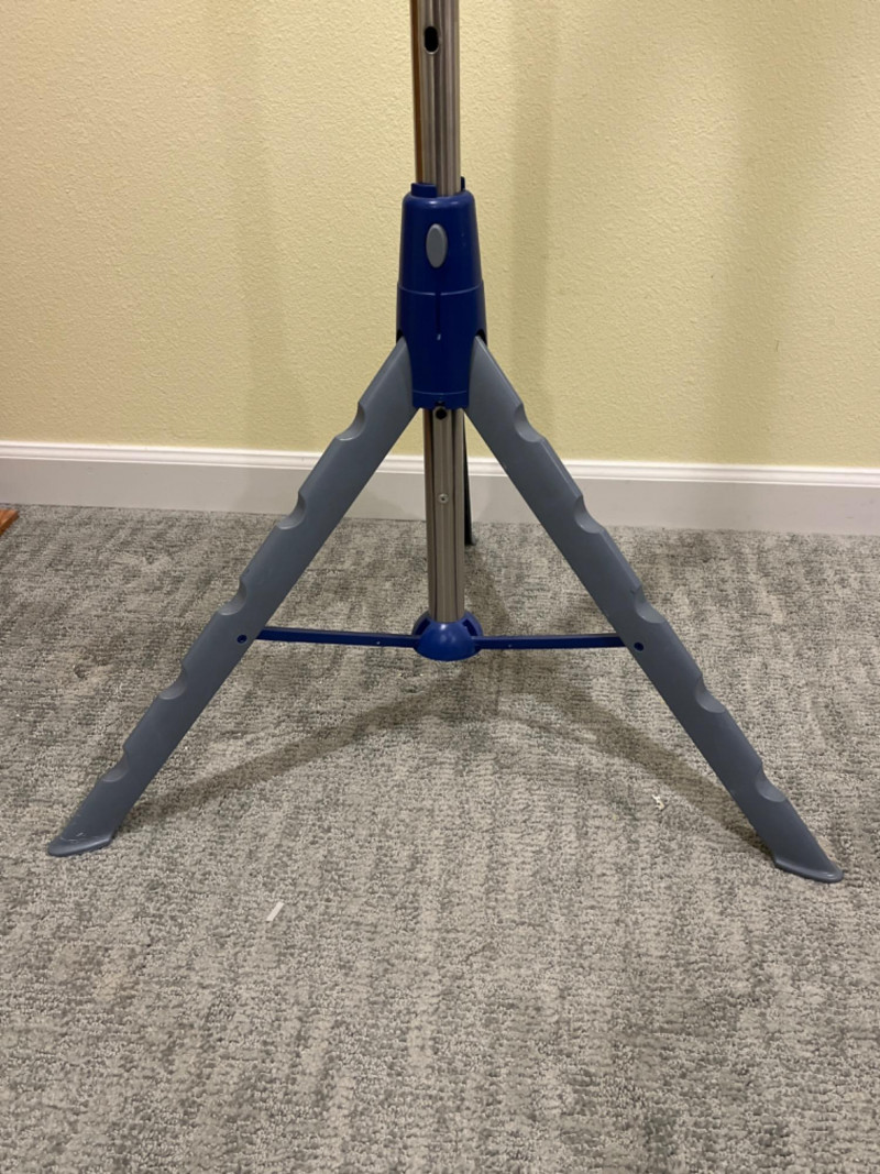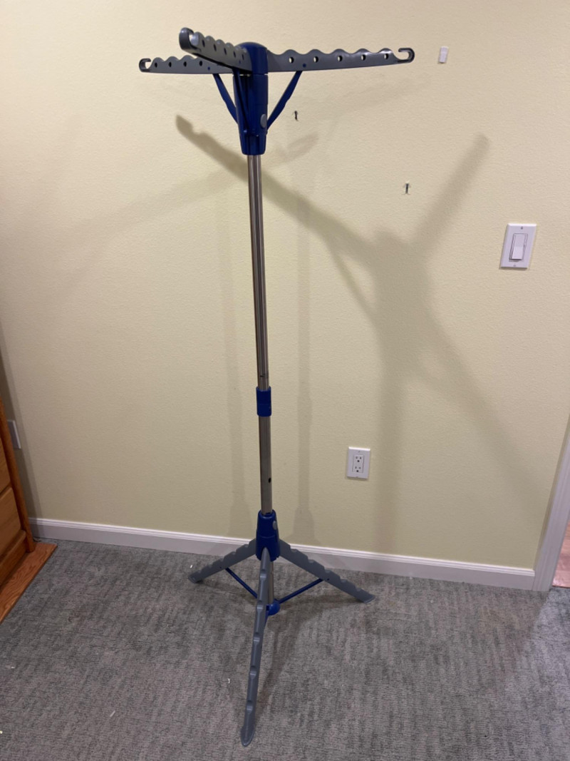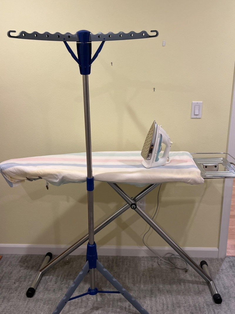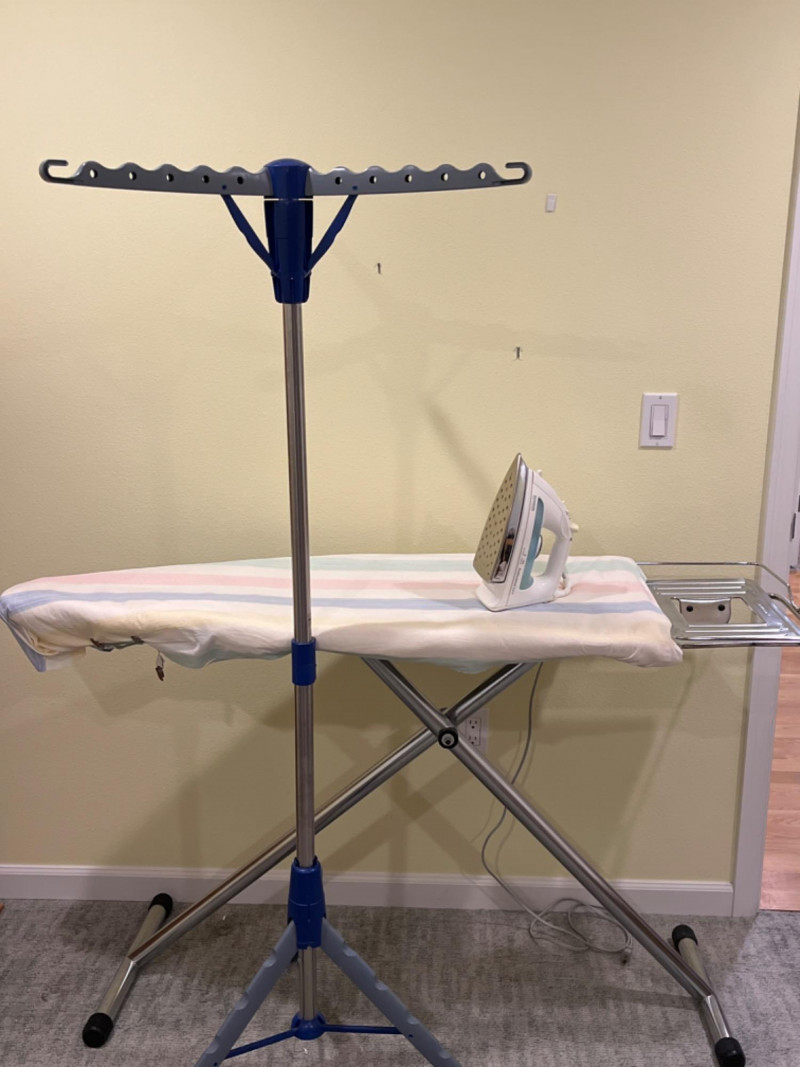 Ironing Table - 2-Tier Tripod Clothes Drying Rack - Clothes Iron The board features a compact design with a large ironing surface and is designed for stability. 59”x19” Tallest height is 40”. A portable and space-saving solution for air- drying laundry indoors. It features multiple arms with notches and holes for hanging up to 30–72 garments on hangers. The rack is designed to be collapsible; it folds down compactly, with a push-button mechanism, for easy storage in small spaces like closets or behind washing machines. Built with a sturdy tripod base, it provides stability for holding heavier items like wet jeans or towels. 24”x63.5” Allows you to remove wrinkles from hanging garments, curtains, and drapes without using an ironing board. Tested: works.
