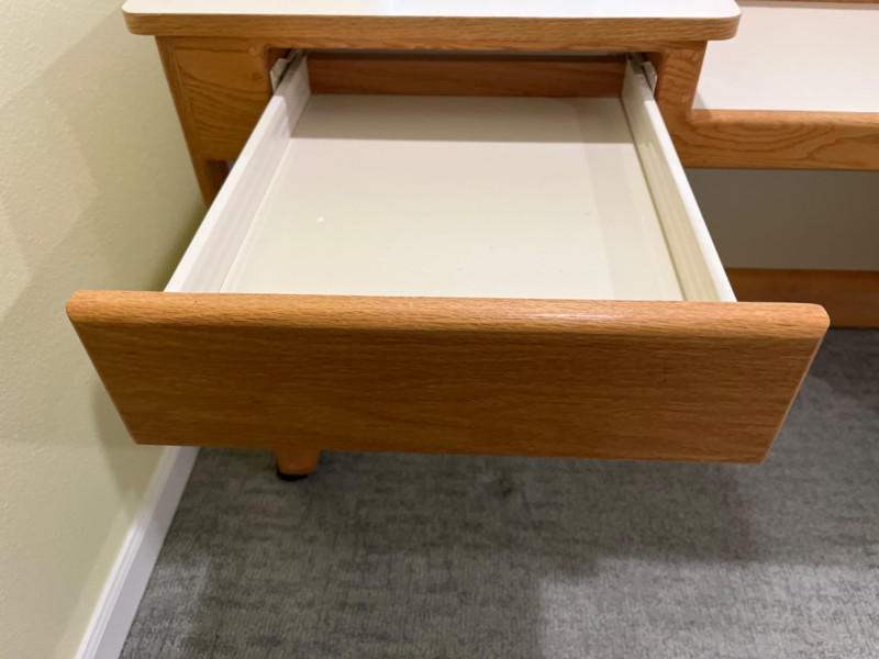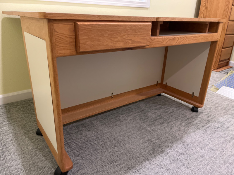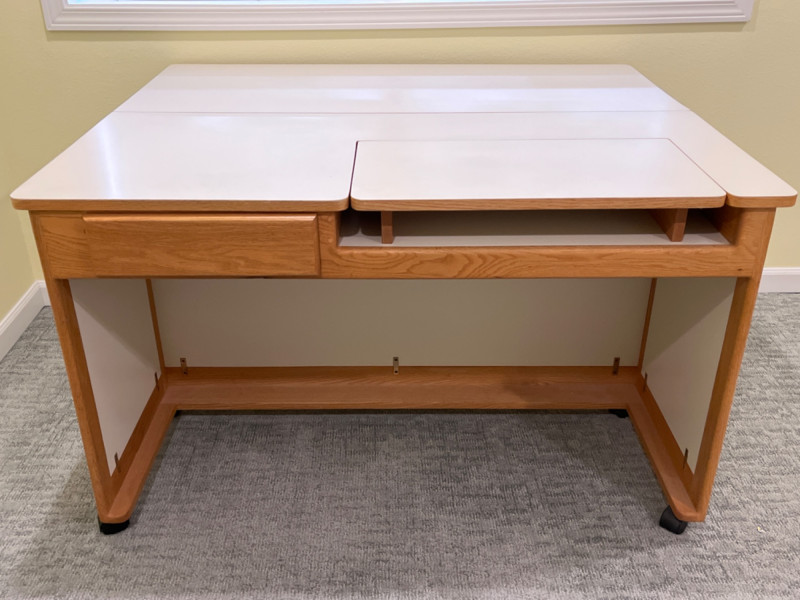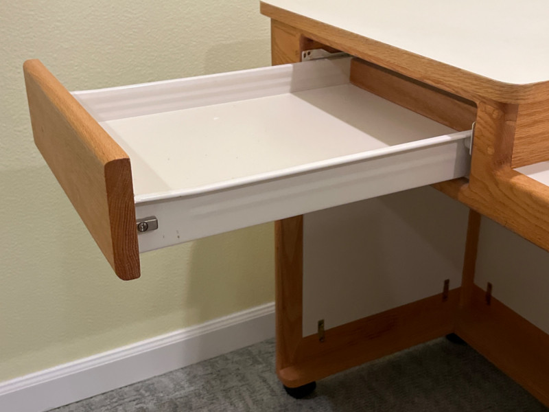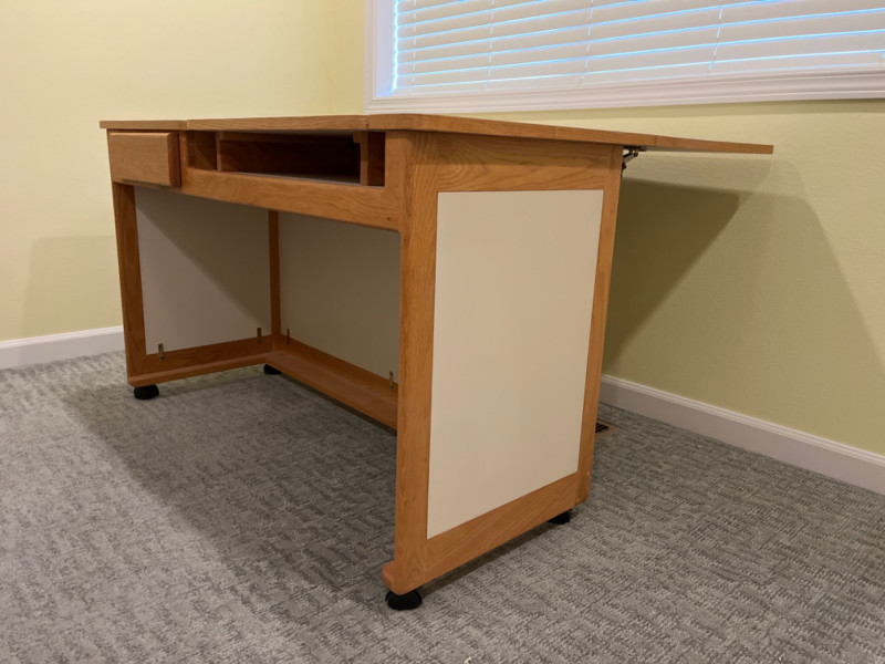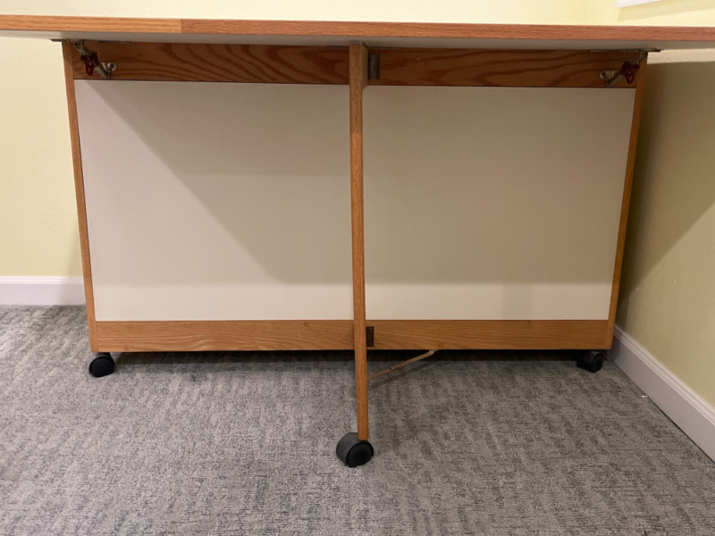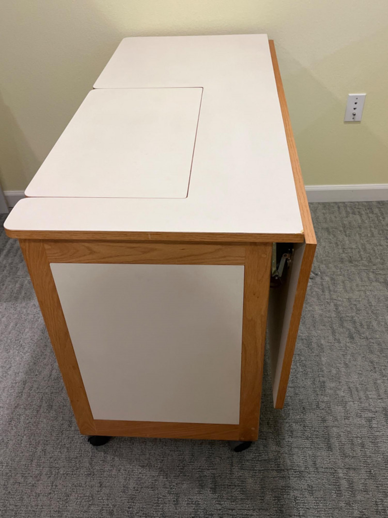 Very Large Rolling Expandable Sewing Table The table features a foldable panel (leaf) that allows it to be used in two different ways, fully extended or completely collapsed to save space. Equipped with casters, making it easy to move between rooms. Removable desk area. Metal drawer with wood front. Full table size is 41.5”x50”x29.5”.