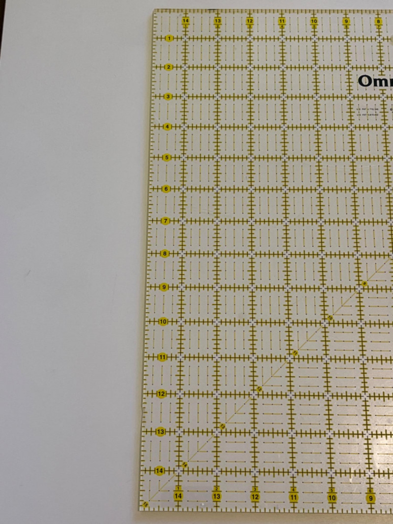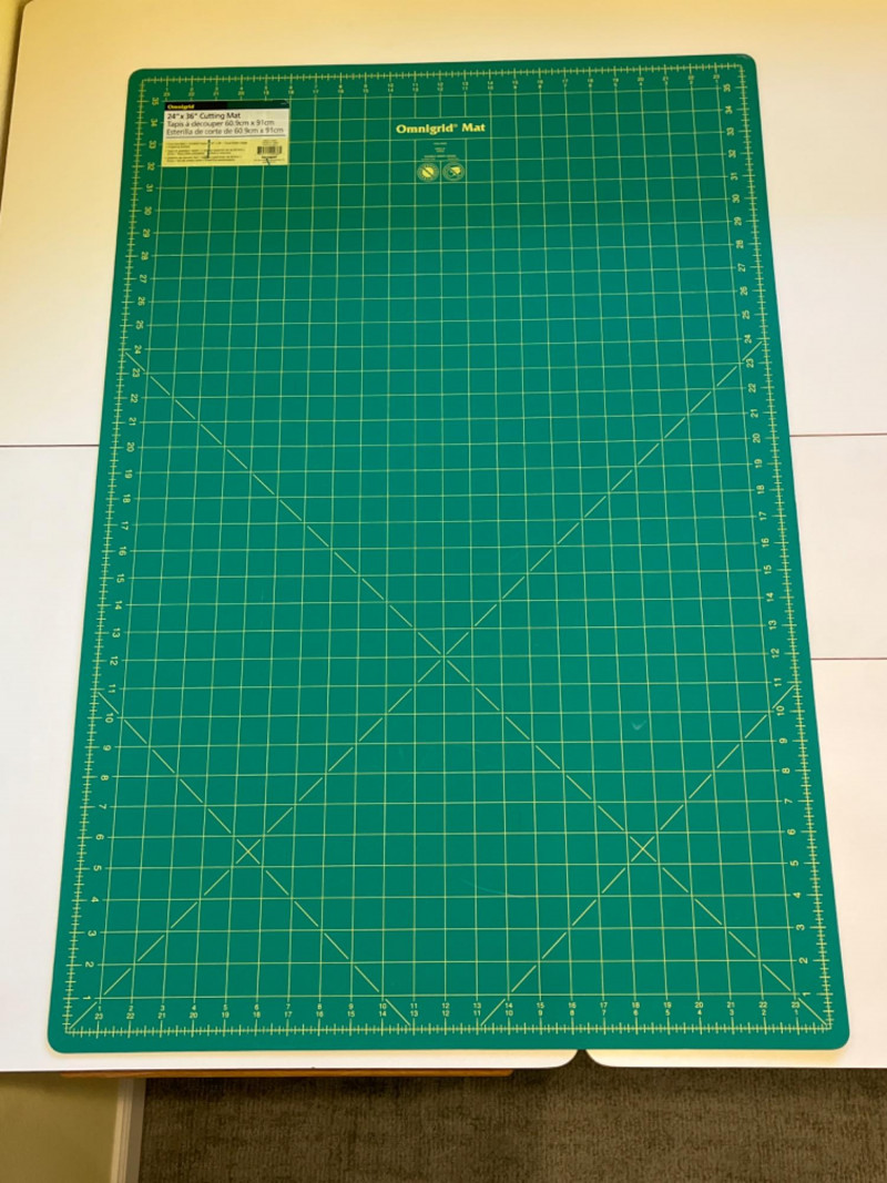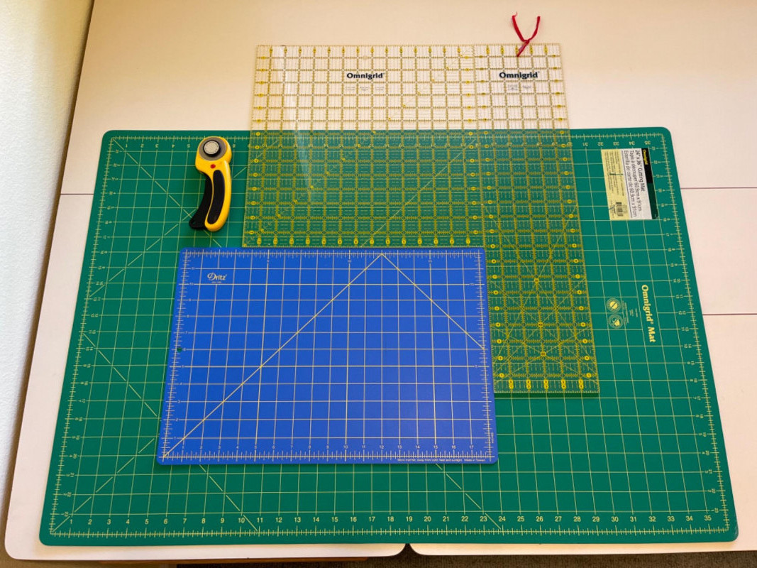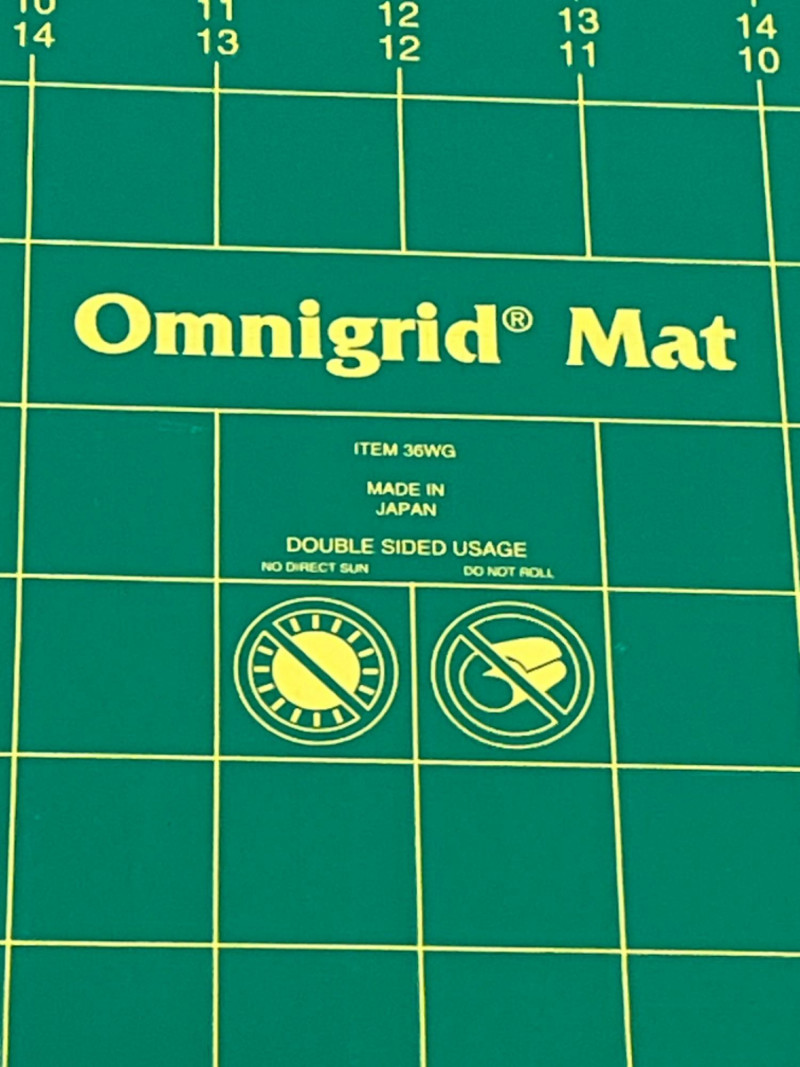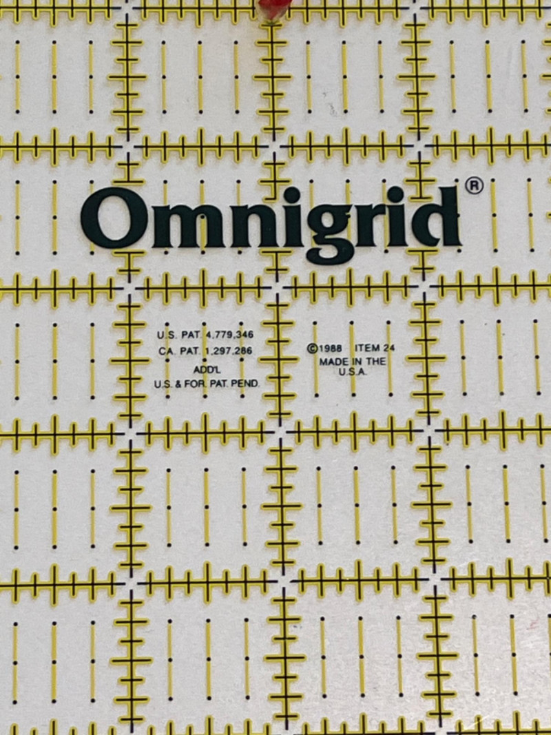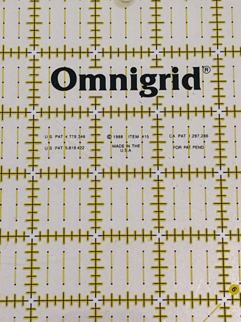 Omnigrid Mat - OLFA Rotary Cutter - (2) Omnigrid Rulers - Driftz Mat Item number: 36WG These mats are specialized surfaces designed for use with rotary cutters in quilting, sewing, and various crafts. The mat is double-sided for versatile use. It features high-contrast yellow grid lines, typically with 1-inch increments and 1/8-inch edge markings for accurate measuring. 36”x24” Versatile tool used primarily for precise fabric cutting in sewing, quilting, and crafting. It has a dual-action safety lock to keep the blade either locked open for use or locked closed for safety. The curved handle is specifically designed to reduce hand and wrist fatigue during extended use. Two Omnigrid Square Quilting and Sewing Ruler Easy-to-read yellow grid markings, 1/8-inch grid sections for precision and diagonal lines for making triangle cuts. Item number: 24 Item number: 15 24”x6” Dritz Gridded Cutting Mat Item number: 1046 Blue surface with highly visible yellow gridlines for accurate measurements and precise cuts. It includes markings for inches, quarter-inches, and eighth-inches, along with diagonal bias lines. Self-healing surface that resists damage from rotary blades. 18”x12”