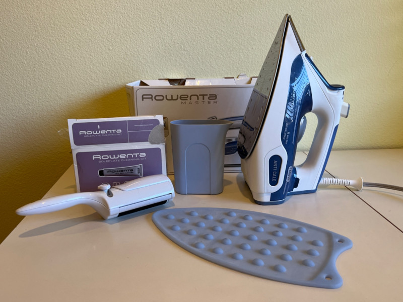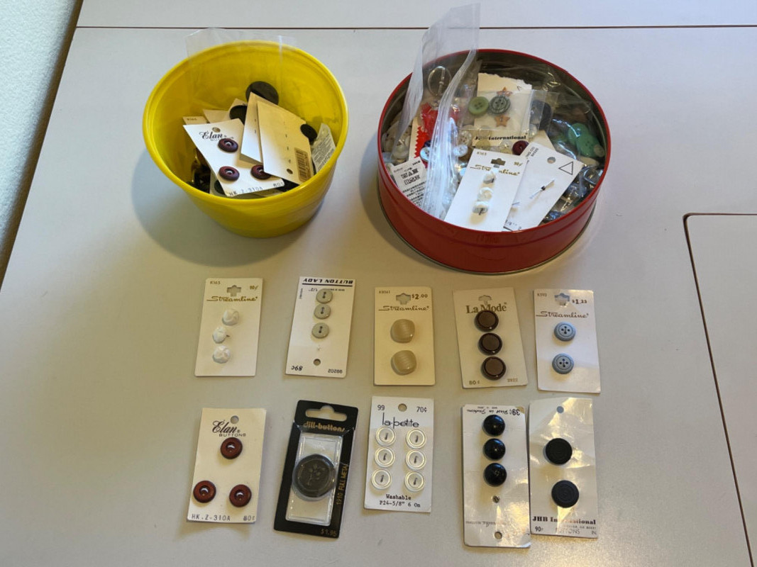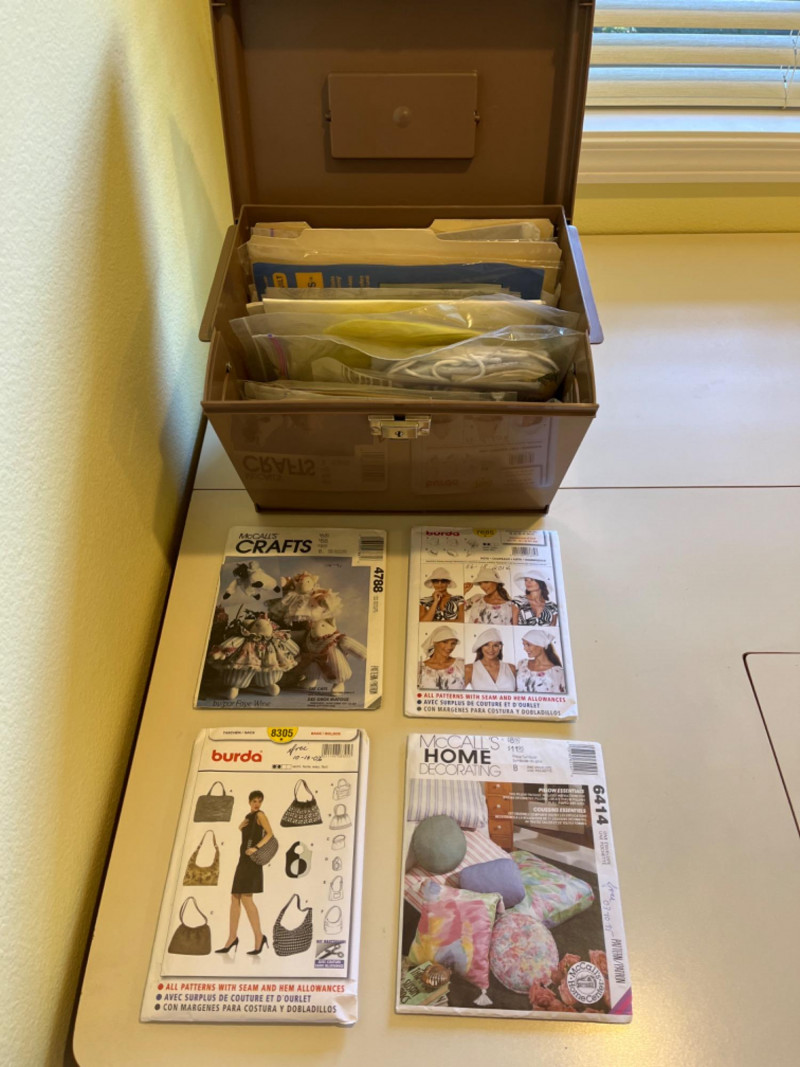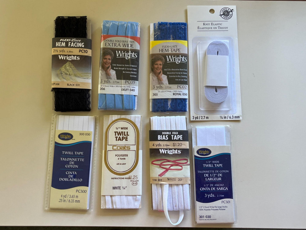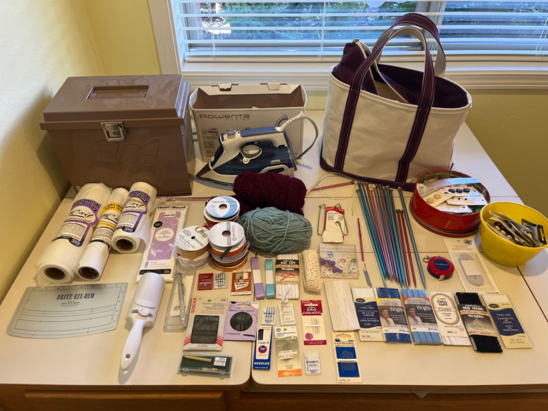 Sewing Machine Needles - Knitting Needles - Rowenta Iron - & More! Assorted hand needles. Wrights double fold bias extra wide tape. 1/4” twill tape. Dritz EZY-HEM ruler. Various color and size ribbon. 120” fabric tape measure. Different colored and sizes of buttons. Rowenta Master 1600W Tested: Works. Two small skeins of yarn (Dark red and light turquoise). Eight pairs of knitting needles. Size G crochet hook. Knitting stick markers and knitting needle point protectors. Five yarn needles. Two bulky knit cable stitch holders. Pair of circular knitting needles. Box of sewing patterns. Package of Heat n Bond. Two rolls of poly mesh cut-away. Roll of light weight tear-away.