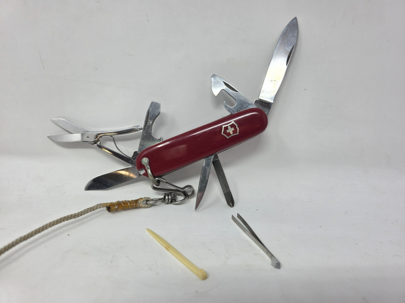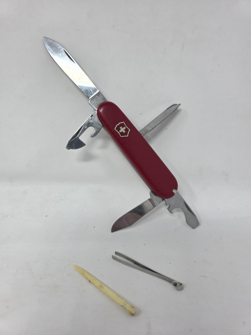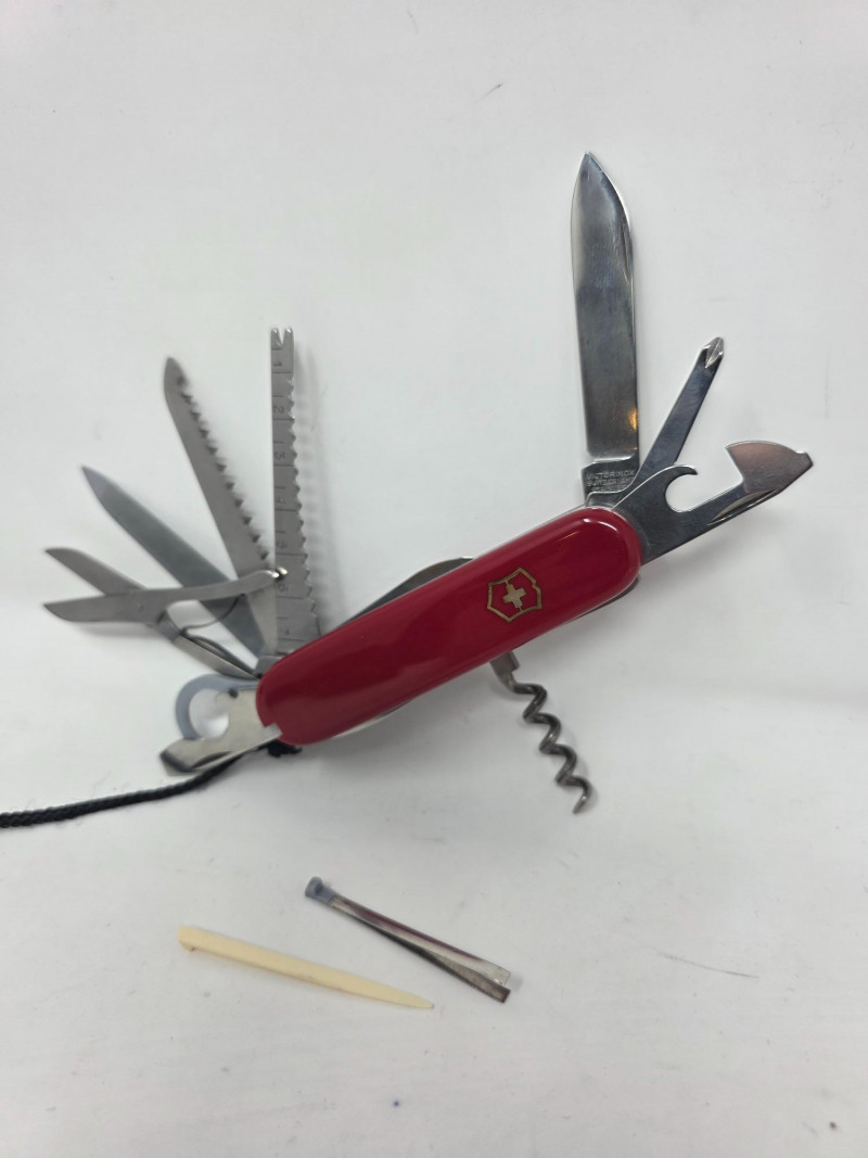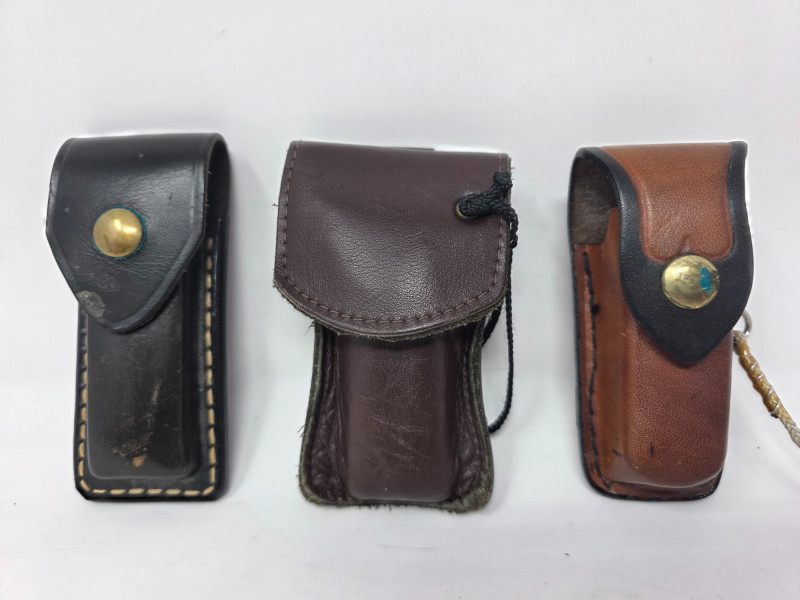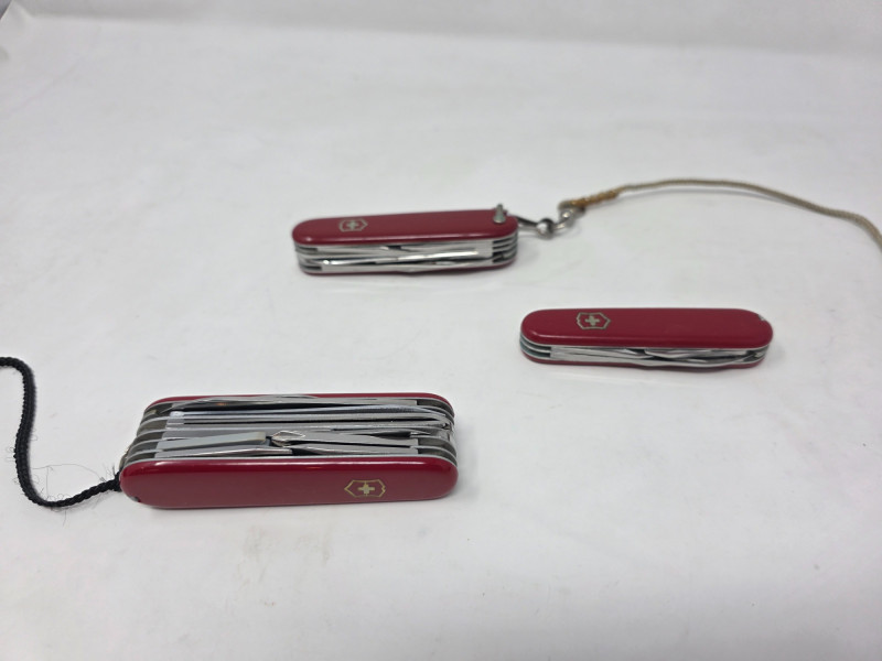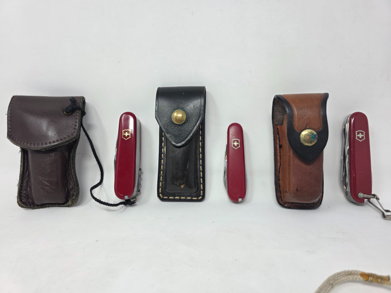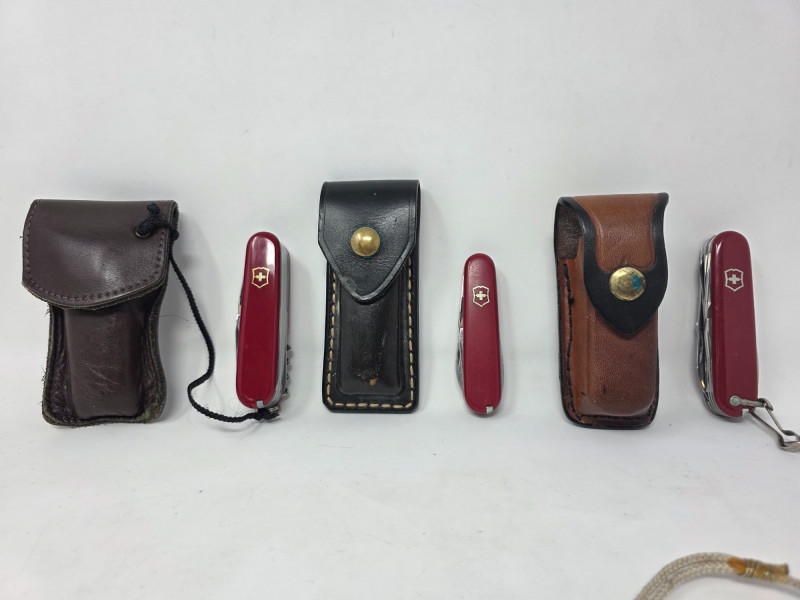 (3) Original Victorinox Swiss Army Knives With Leather Cases Each knife contains many tools including: Knife blades, saws, screwdrivers, leather punch, magnifying glass, scissors, cork screw, toothpick, tweezers and much more! All 3 appear to be in good working order See pics for condition and features of each knife Includes 3 leather cases, though they may not be original