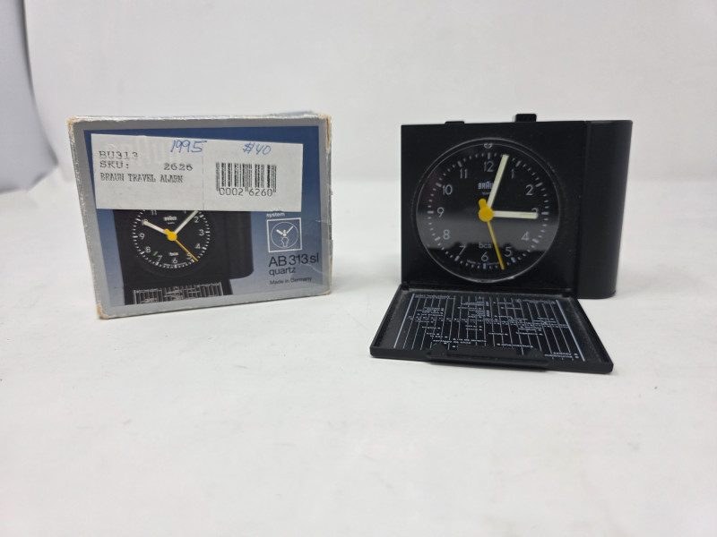 Vintage Braun Type 4784 AB 313 SL Quartz Travel Clock Minimalist analog alarm clock known for its classic German design and functionality. Designed by Dietrich Lubs under the guidance of Dieter Rams in the late 1980s/early 1990s Purchased in 1995 from The Sharper Image in Seattle Apparently this is a sought-after collector's piece! Includes new AA battery, original box & documentation Tested - Works!