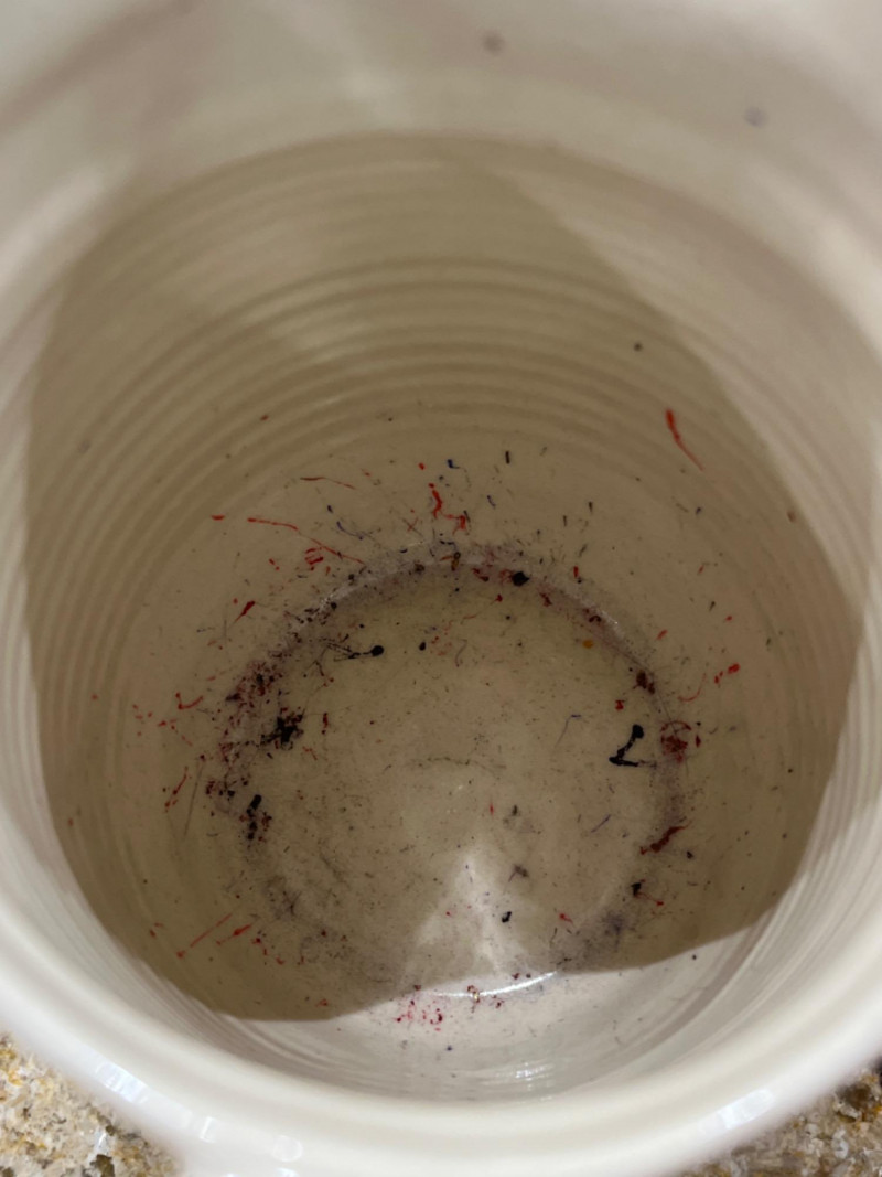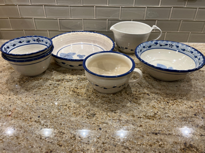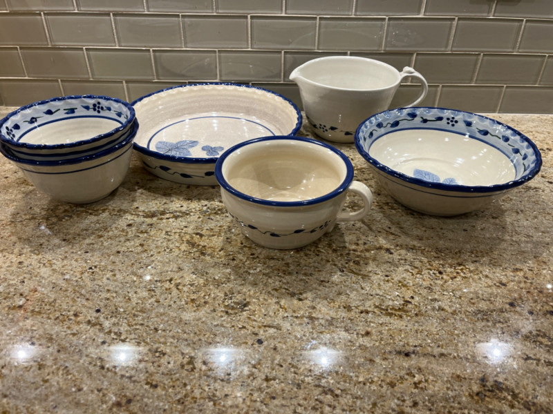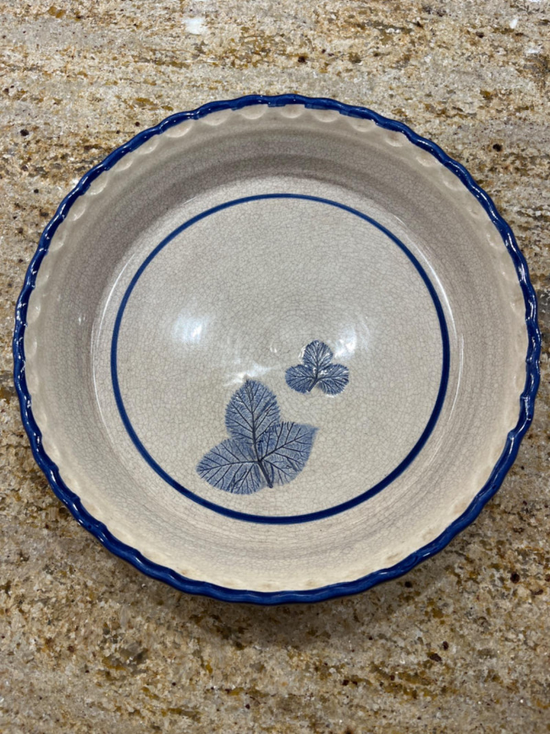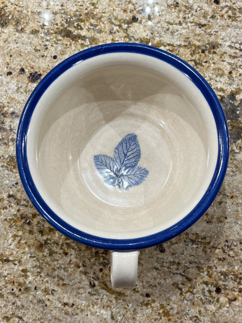 Pottery kitchen dishes with blue leafy and floral motifs and leaf imprints on the bottom of dishes.