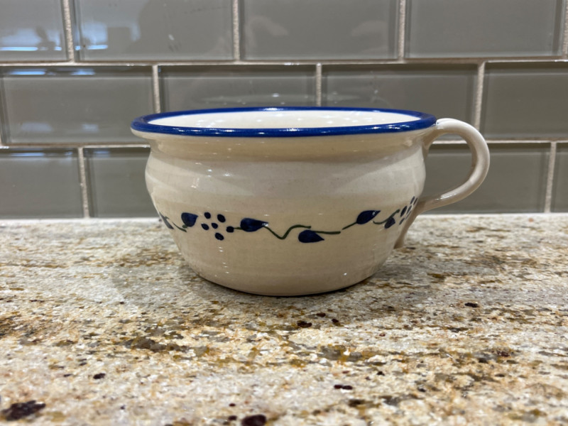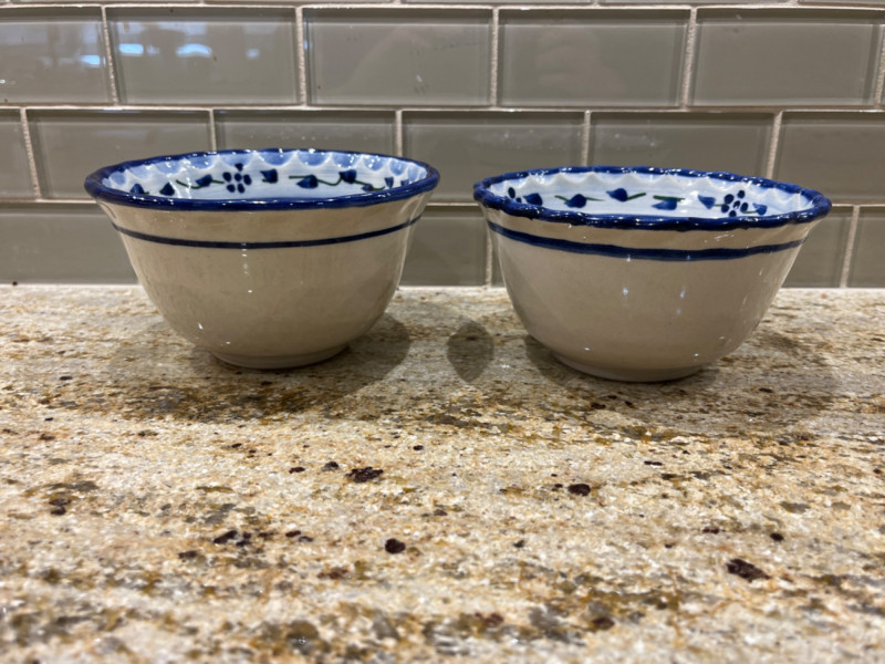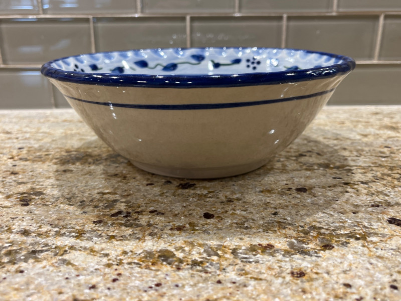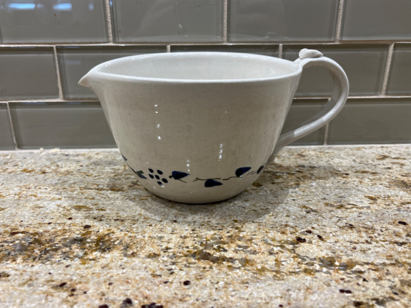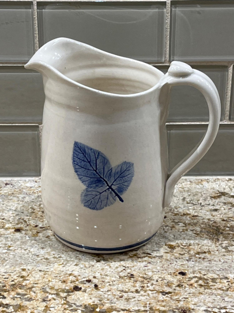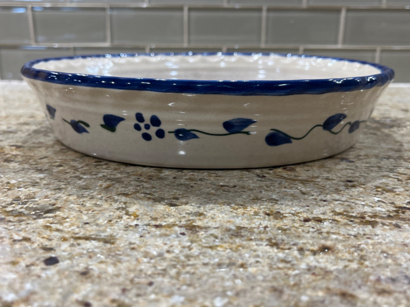 Blue Leaf Pottery Collection Two bowls. 5.5”x3” Bowl with handle. Serving bowl. 8”x3” Cream pitcher. 5.5”x3.5” Pie pan. 9 3/4” Creamer pitcher. Pen markings inside. See pictures for details. 3 1/4”x5.5”