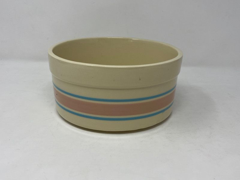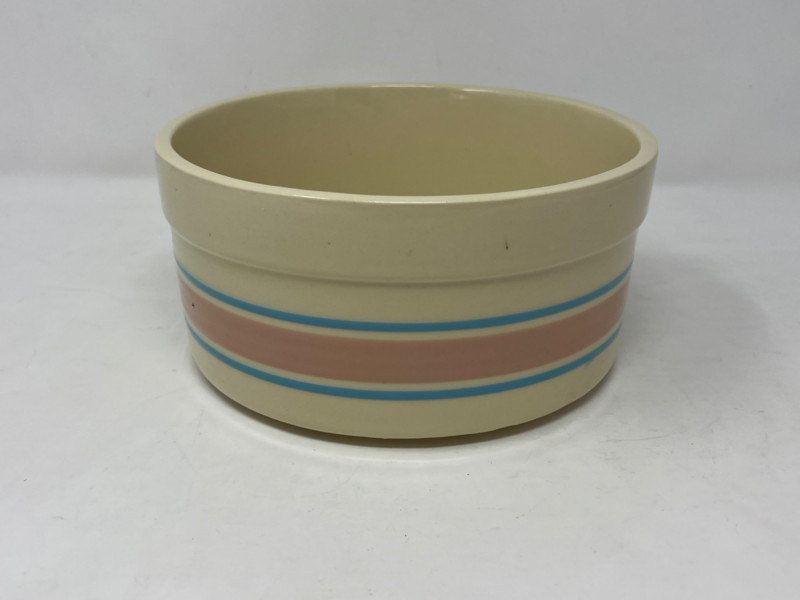 Vintage McCoy pottery soufflé bowl, part of the "Stonecraft" or "Lancaster Colony" line produced in the early 1970s. This specific design is characterized by its cream-colored stoneware and distinctive pink and blue stripes around the body. See pictures for condition. 7.5”x3 3/4”