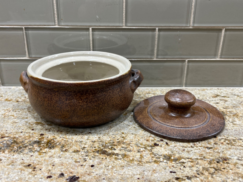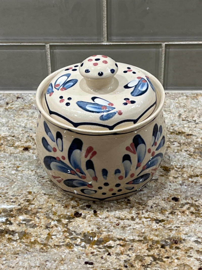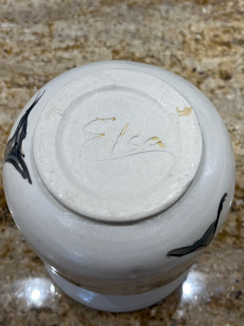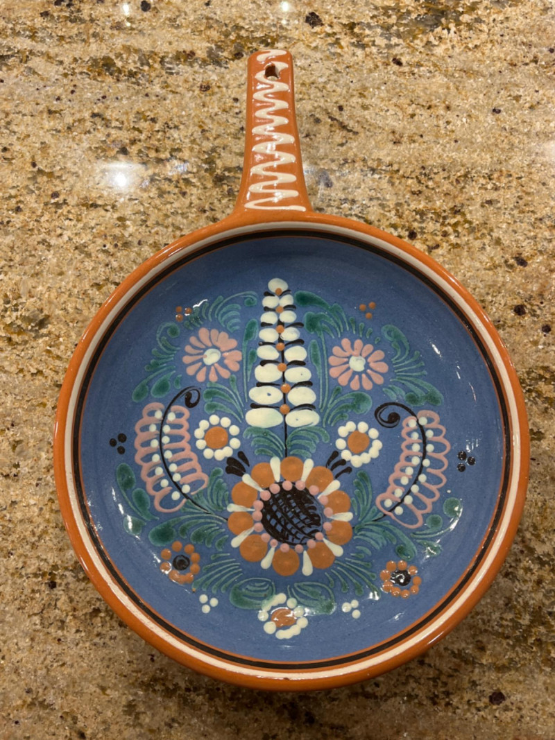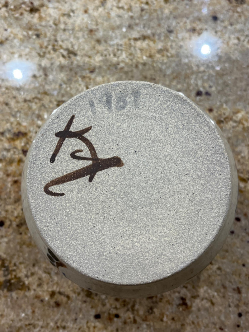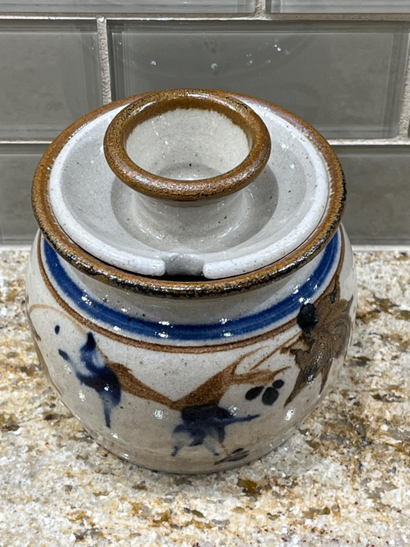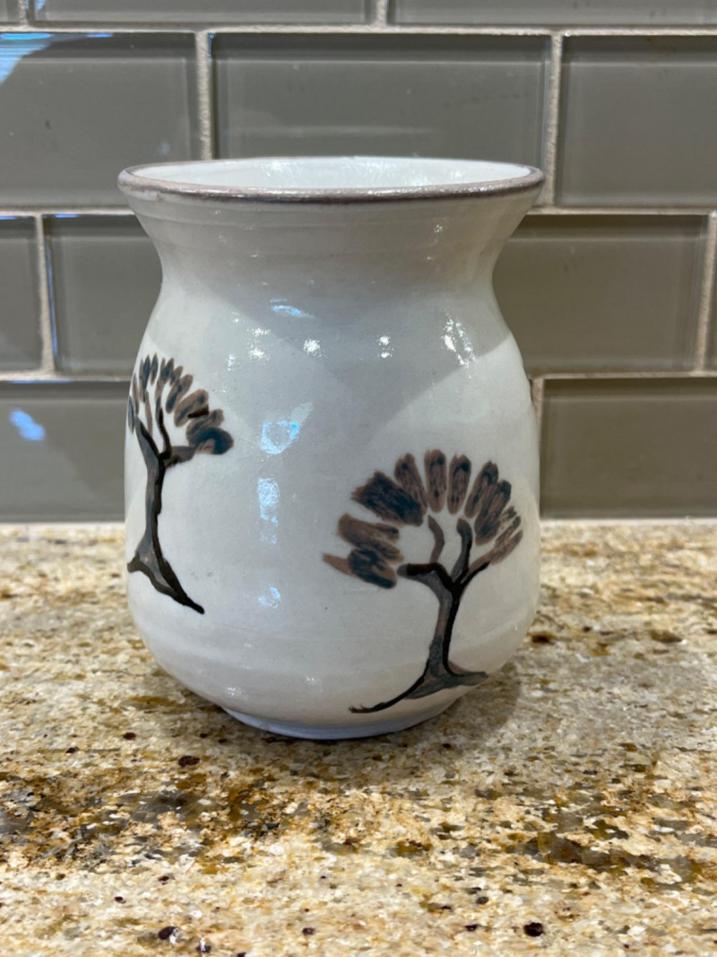 Pretty Pottery Pieces Hand signed by artist. 4”x4.5” Hand painted ceramic skillet with floral designs. 8” across. Pottery vase with tree designs. Artist’s name is engraved on the bottom. 4”x5” Sugar bowl with leaf and floral motifs. Hand signed by artist. 4”x4” Floral designed pot with lid. 3.5”x4” Brown crock with lid. 6.5”x4”