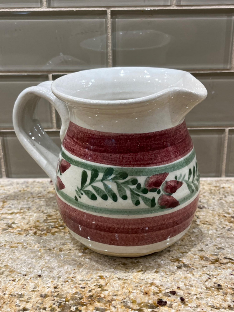 Pitcher with white base and floral designs.