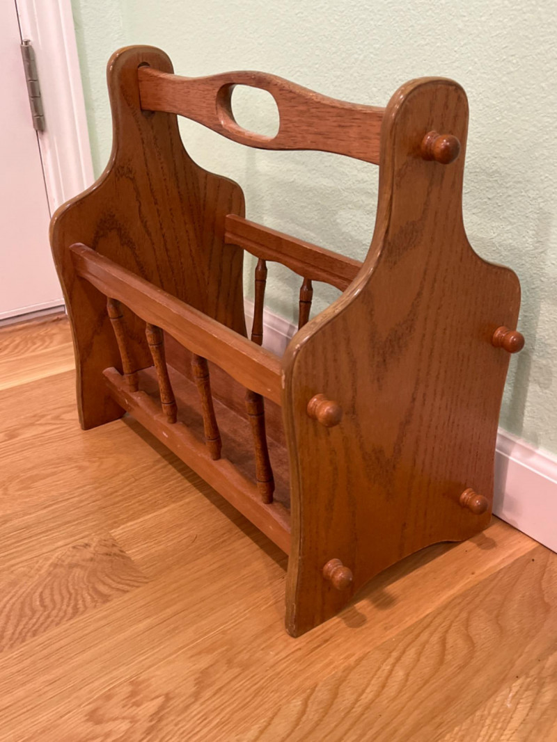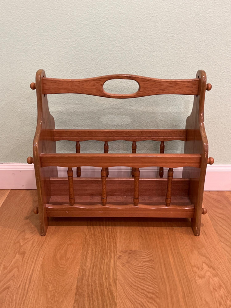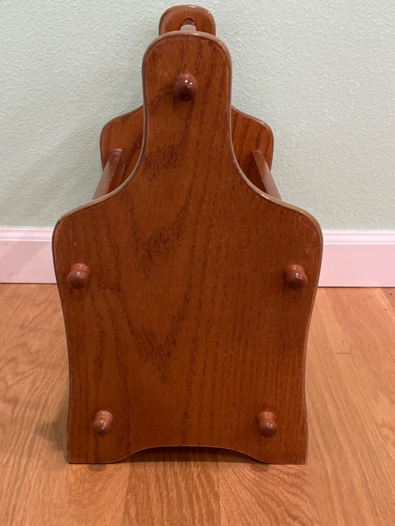 Farmhouse Style Oak Magazine Rack Warm reddish-brown finish. Divider in the middle of rack. 17”x9”x15.5”