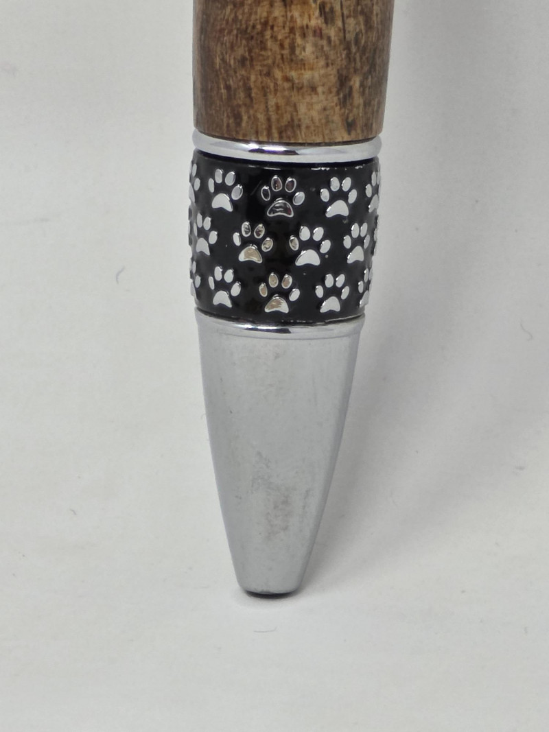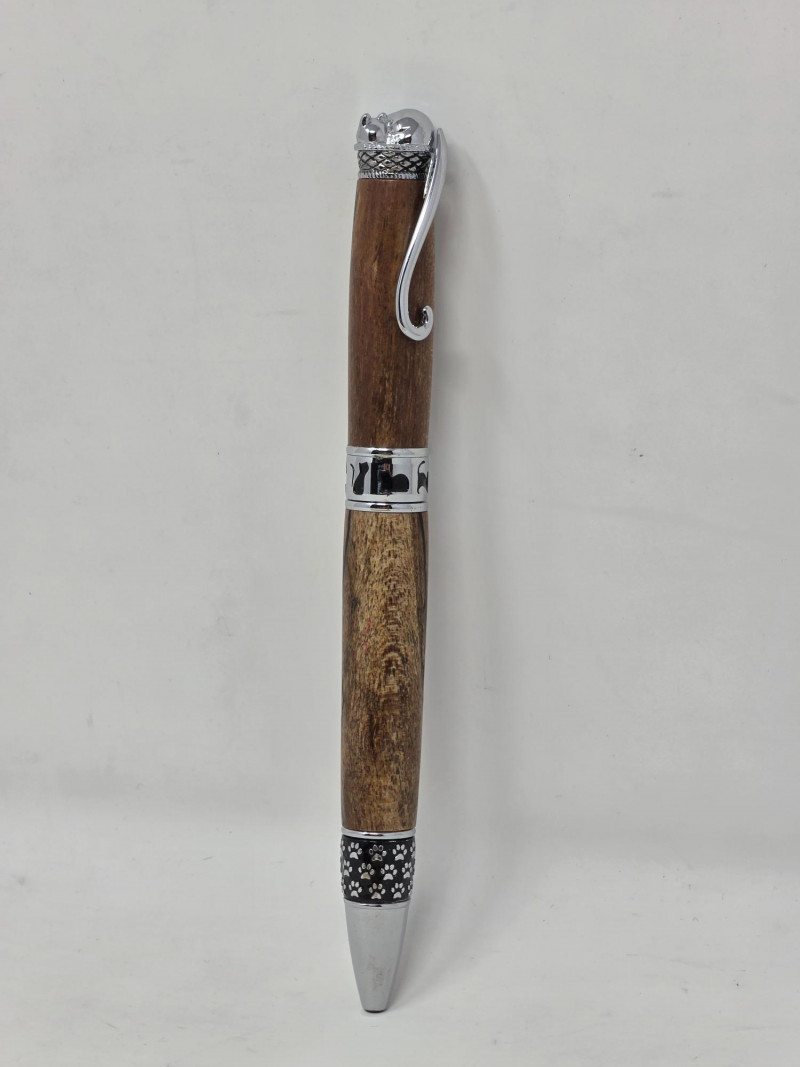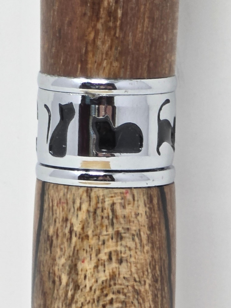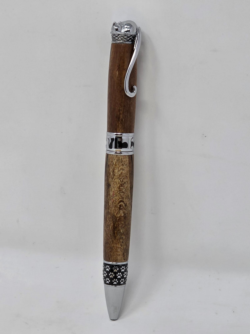 Custom Handcrafted Ballpoint Twist Pen Featuring a Cat-Themed Design The body is made from turned wood Features a sculpted metal cat with the tail as a clip and a band with paw prints Operates with a half-twist mechanism Compatible with standard Parker-style ballpoint refills Tested - Works! 5.5"L