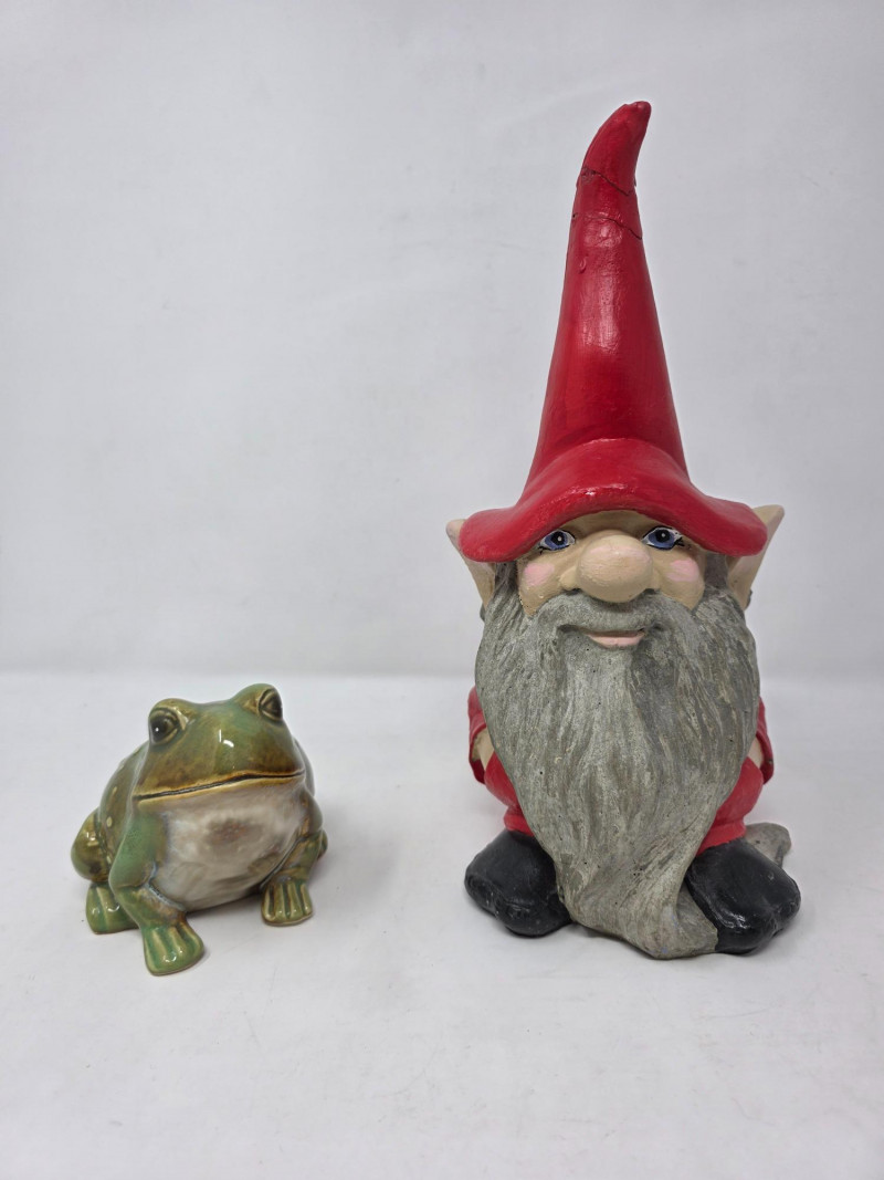 Ceramic Frog & Cement Garden Gnome The tip of the garden gnome's hat has been glued (see pics for condition) Perfect addition to your indoor/outdoor space! Ceramic Frog - 4"T x 4"W Cement Garden Gnome - 11.5"T x 5.5"W