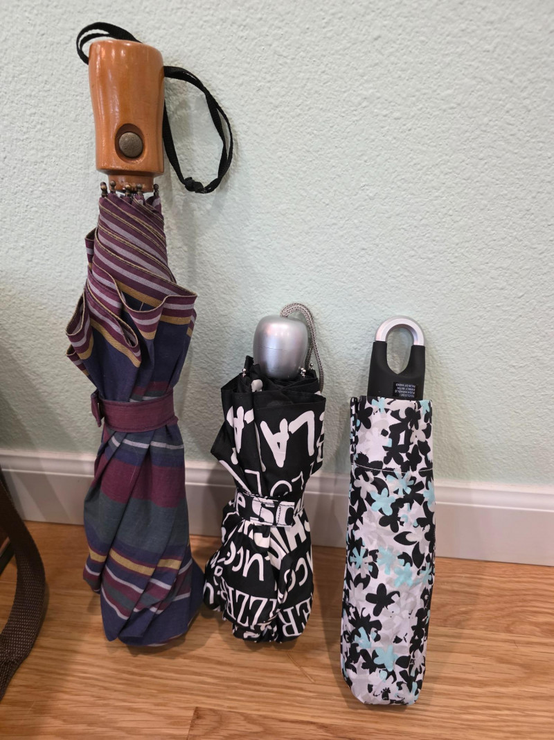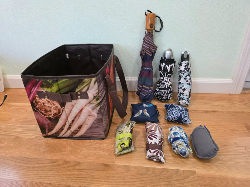 Umbrellas, Packable Shopping Bags & Foldable Tote (3) Compact Telescoping Umbrellas (6) Packable Shopping Bags (1) Foldable Shopping Tote Tote is 11"T x 15"W x 11"D 10 items in all!