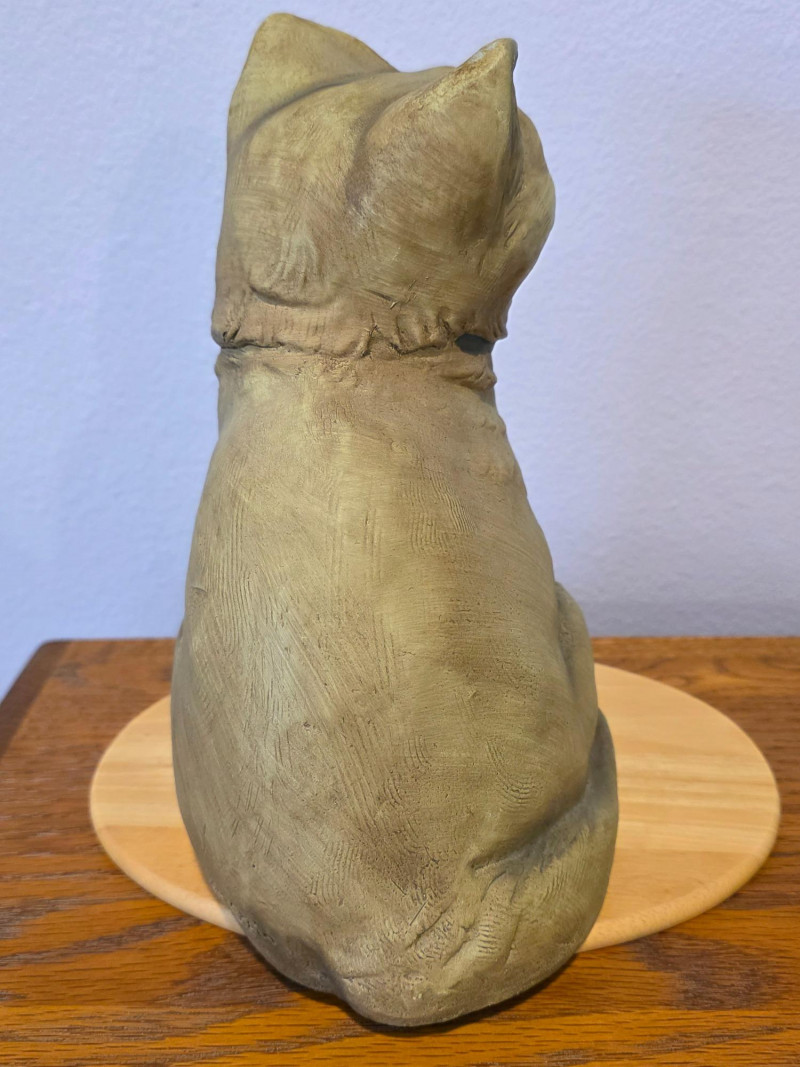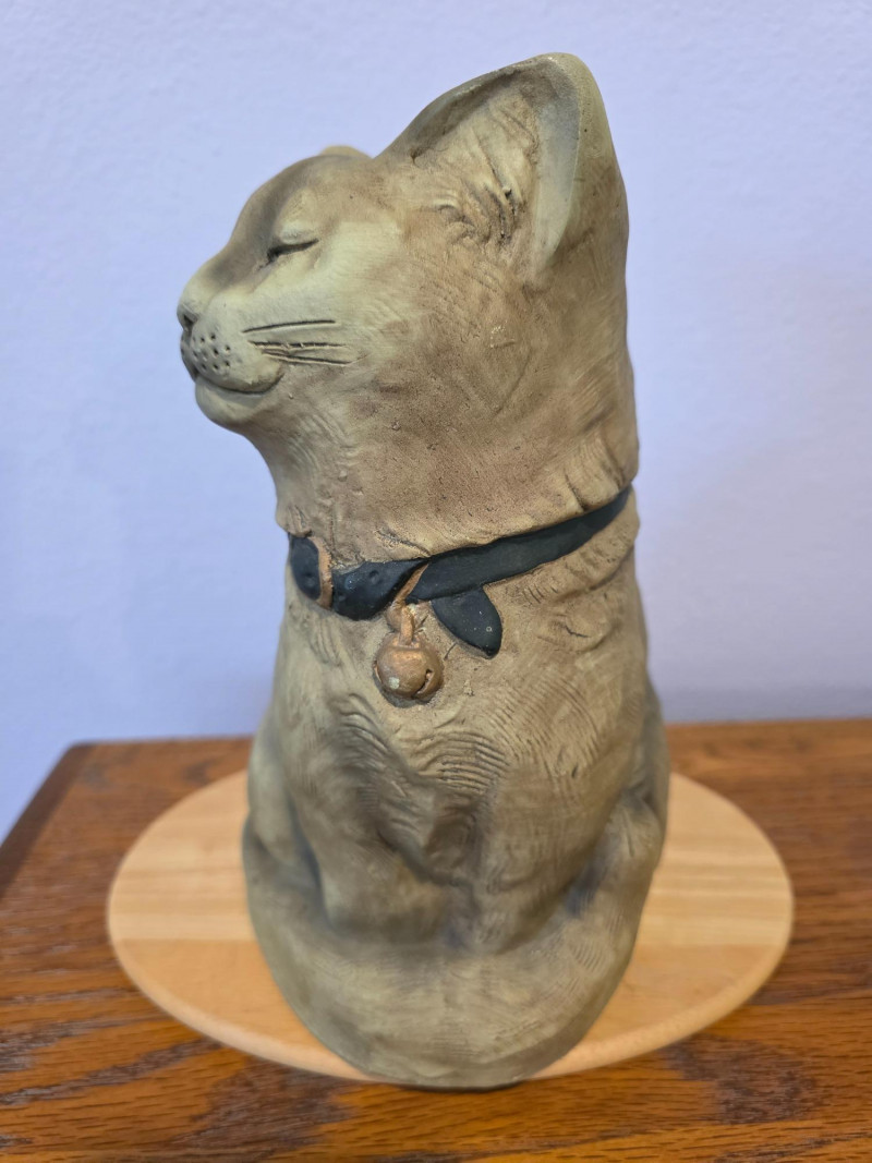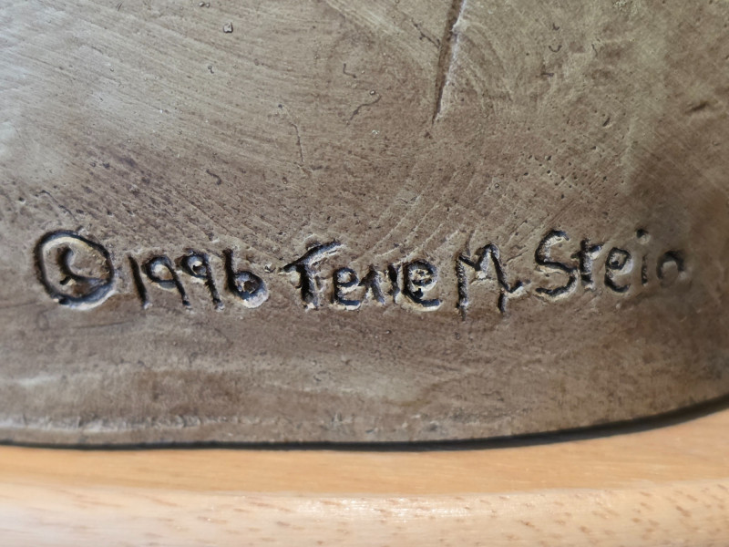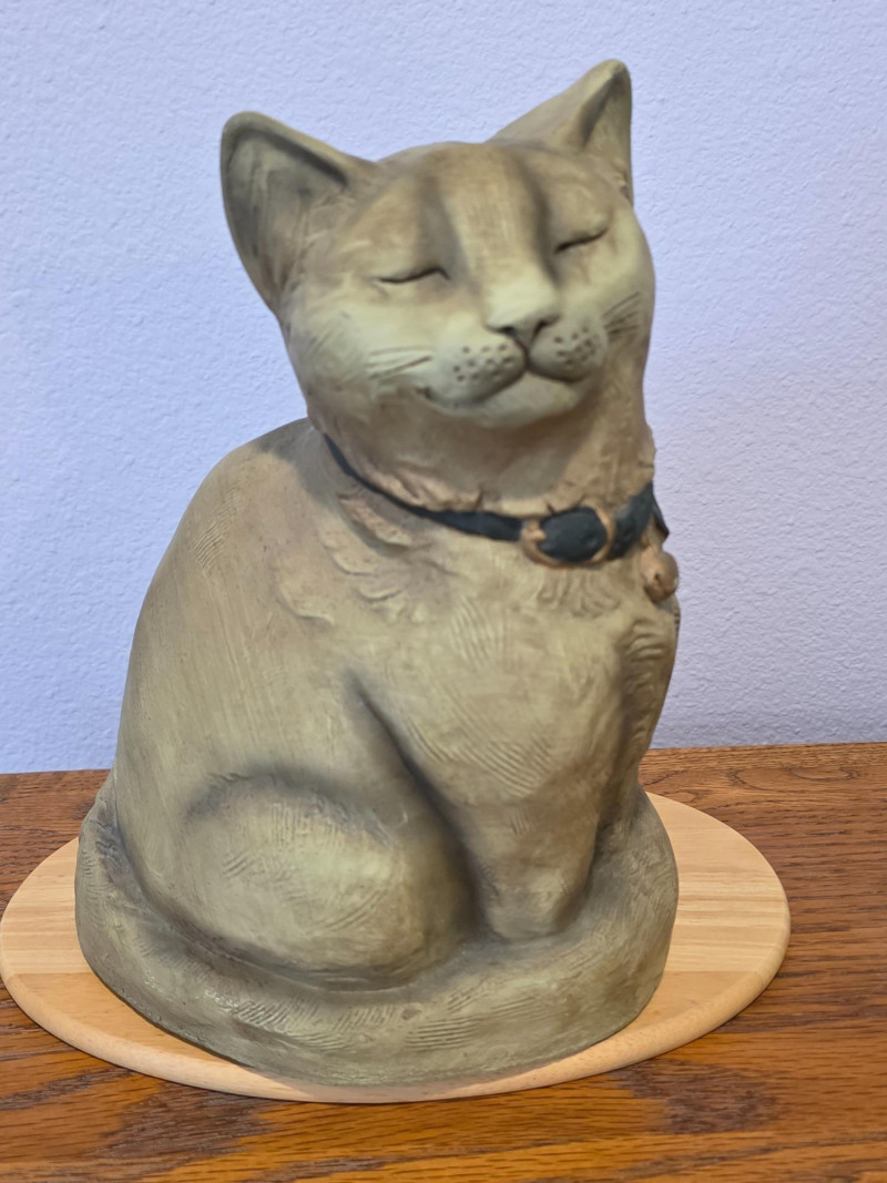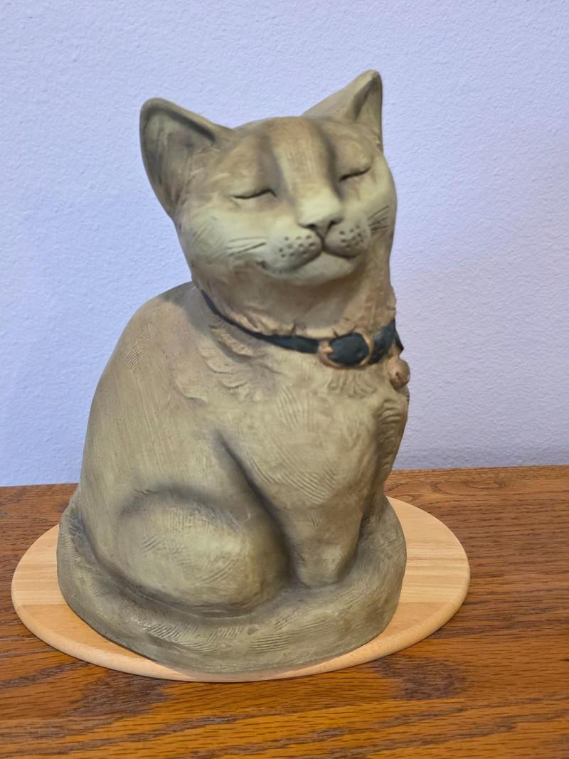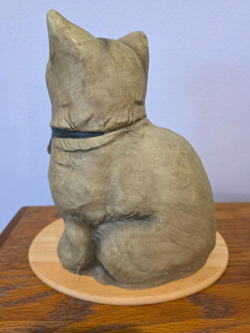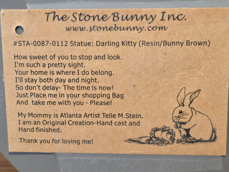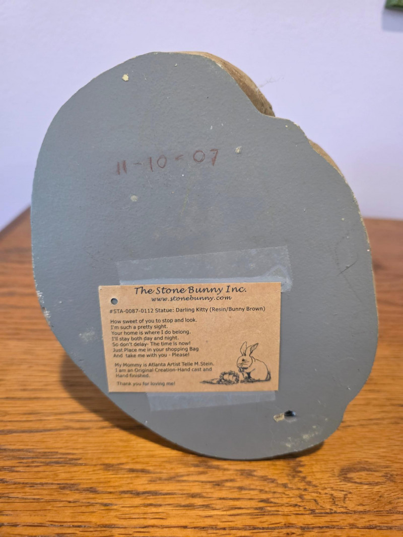 1996 Telle M. Stein "Darling Kitty" Resin Figurine Telle M. Stein cat figurine, a collectible statue known for its stone-like appearance. Marketed under the brand "The Stone Bunny" #STA-0086-0112 "Darling Kitty" These statues are hand-painted and made from resin, finished in the color Bunny Brown The design features a serene, seated cat with closed eyes and a collar with a bell 9.5"T x 7"W x 6"D