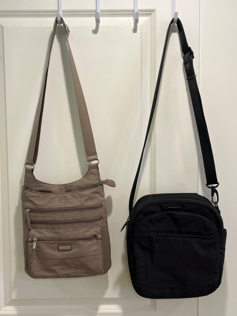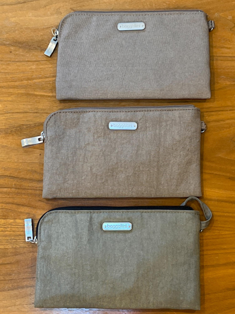 Baggallini Around Town Bagg & Travelon Anti-Theft Urban Tour Bag Features a long, adjustable shoulder strap for customized wear. Three RFID phone wallet wristlets. 10.5”x11” Travelon Anti-Theft Urban Tour Bag Designed with slash-resistant body panels and straps, along with locking compartments to deter theft. Dedicated slots for cards and passports that block RFID signals to prevent electronic identity theft. Roomy main compartment with a padded sleeve for a tablet or iPad, a front organizer panel, and additional zippered pockets. Equipped with a mesh expansion pocket for a water bottle and an adjustable, padded shoulder strap for comfortable carrying. 10.5”x11.5”
