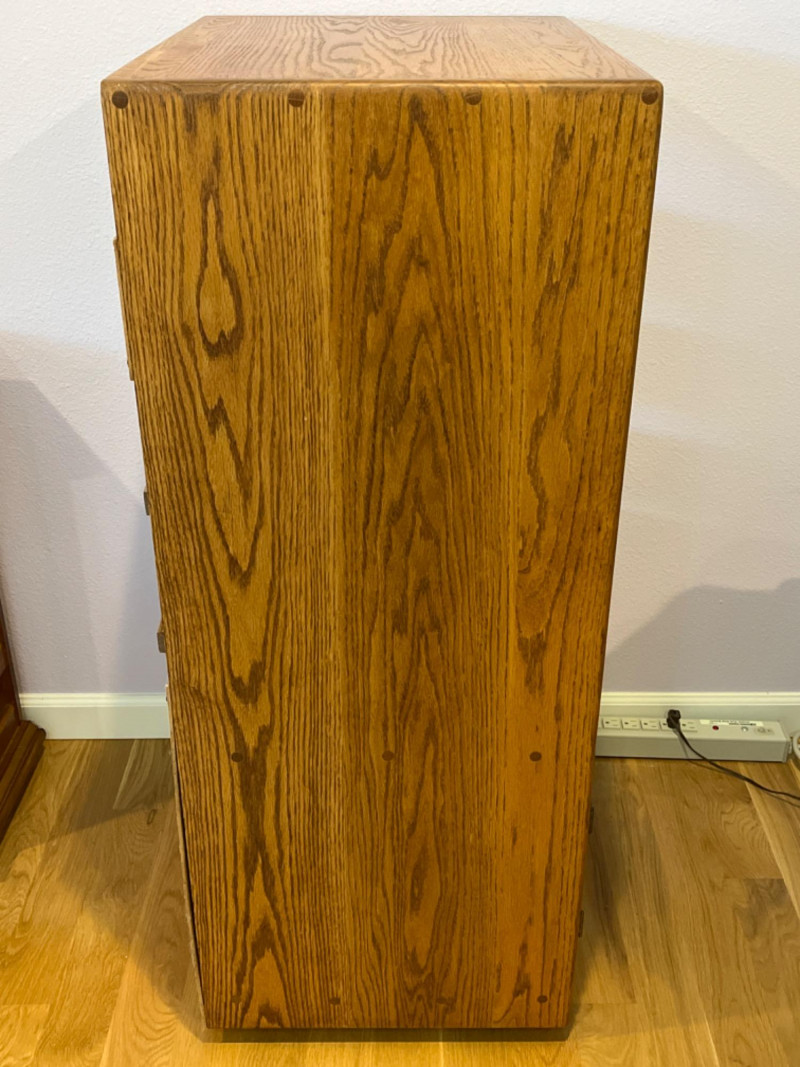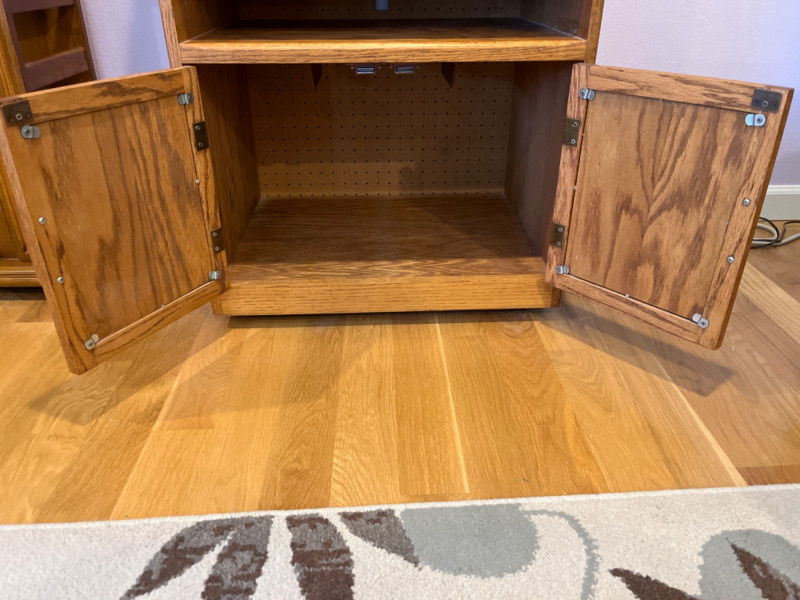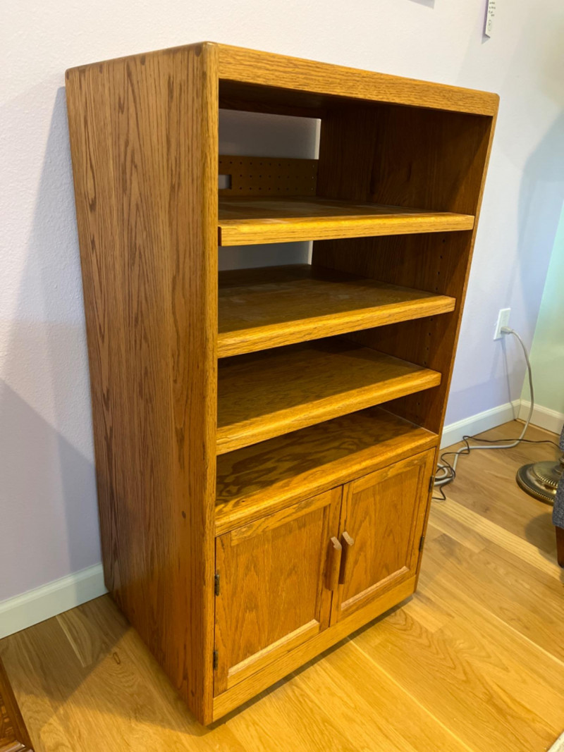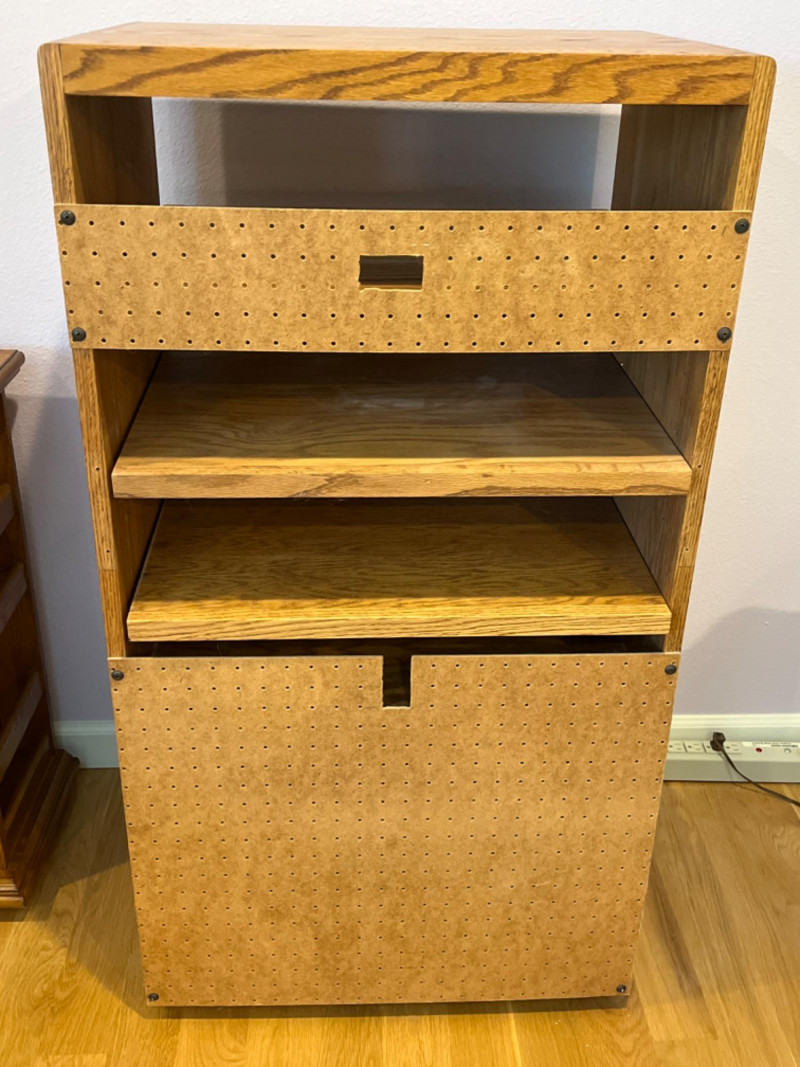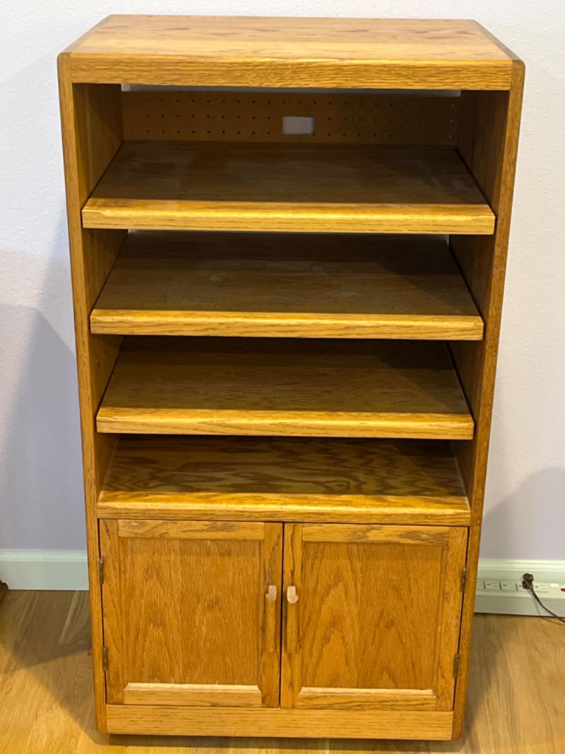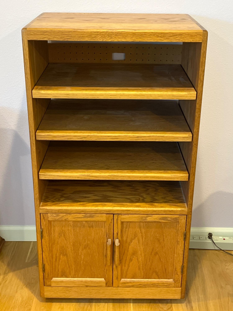3-Shelf Oak Media Cabinet 3 Adjustable shelves and double door cabinet with rounded corners. Pegboard backing and a pre-cut hole for cable management. 23.5”x17.5”x43.5”