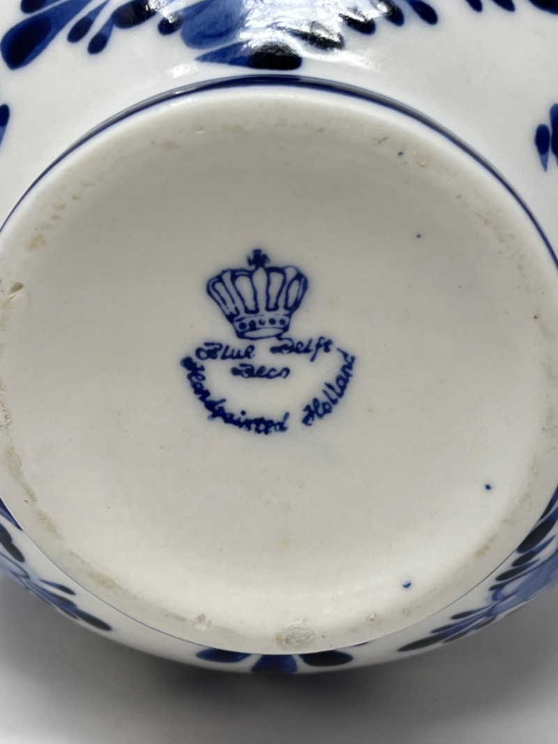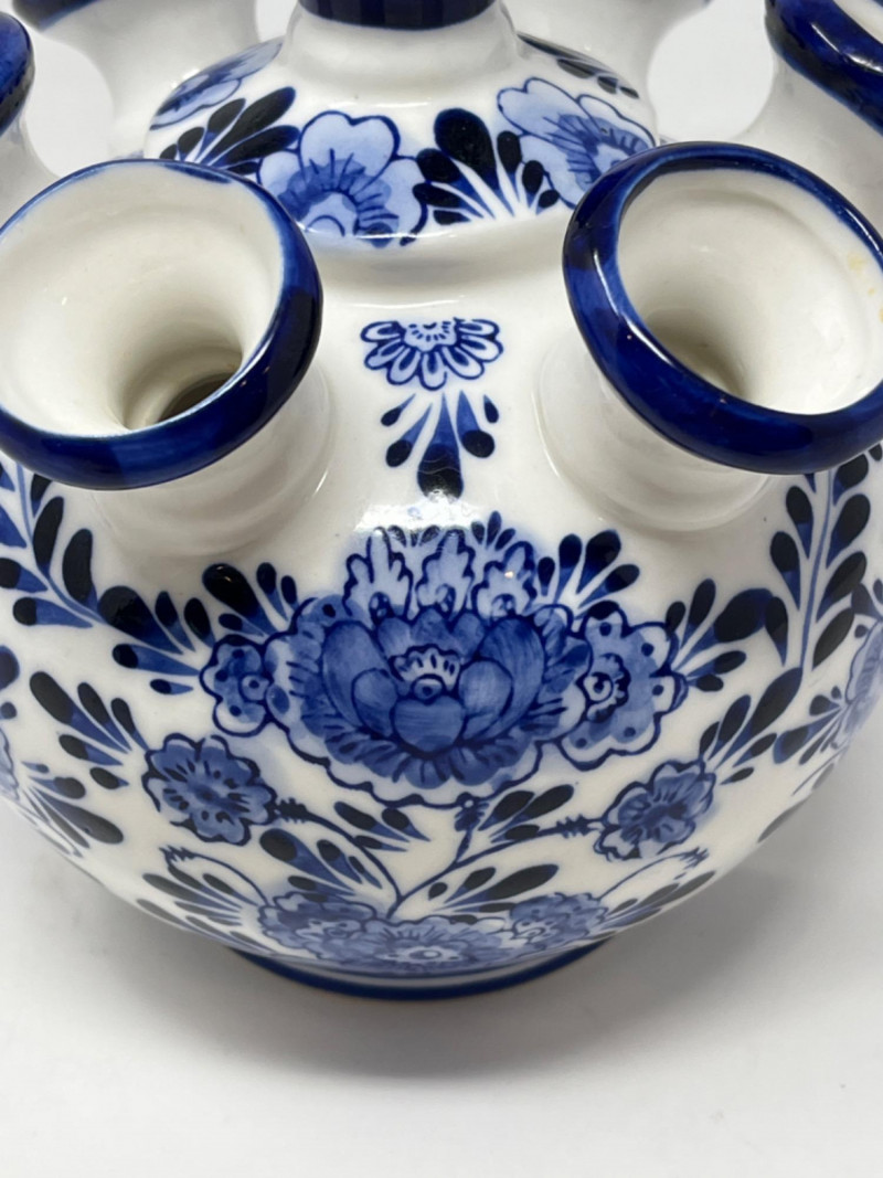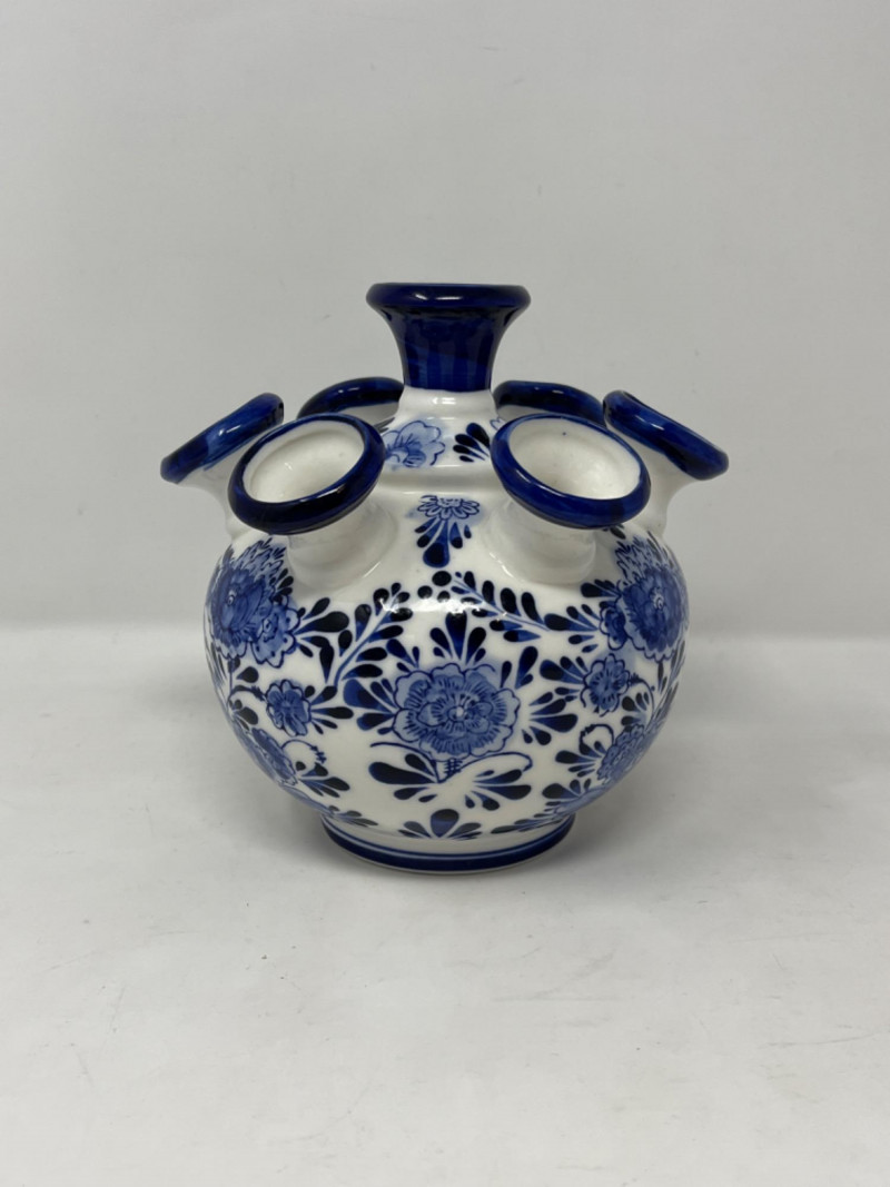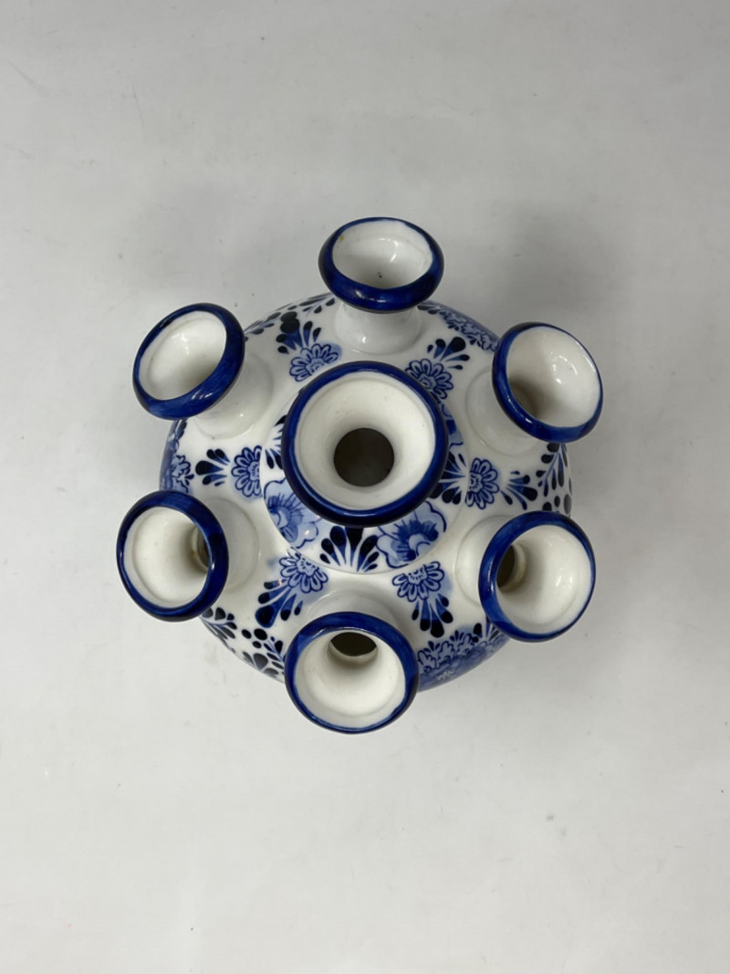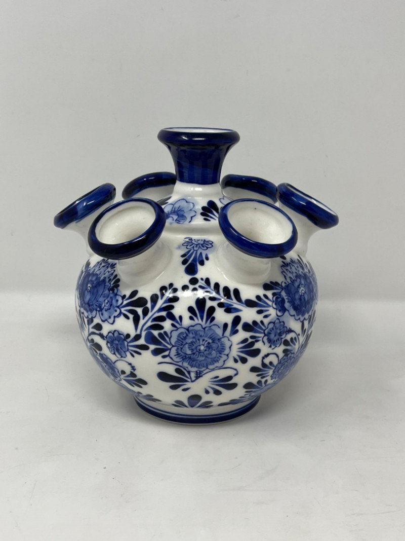 Delft Blue Tulip Vase Seven spout design, allowing for individual flower arrangements. Hand-painted in Holland with intricate blue floral patterns. Comes in original box. 7”x6”
