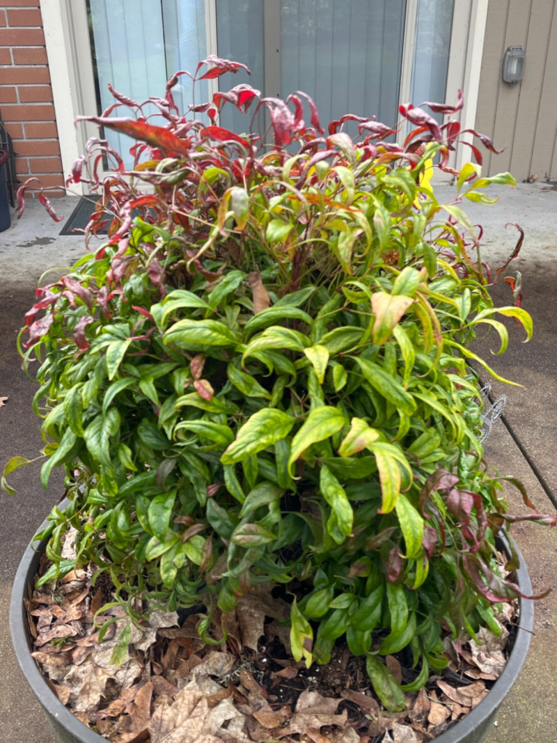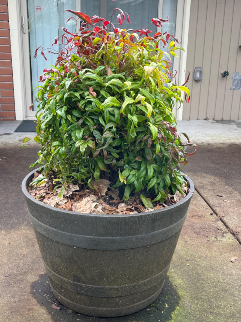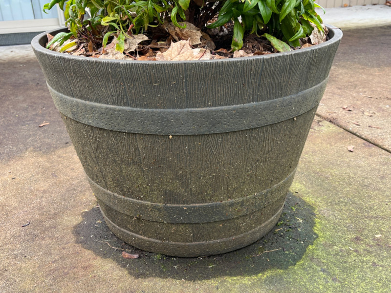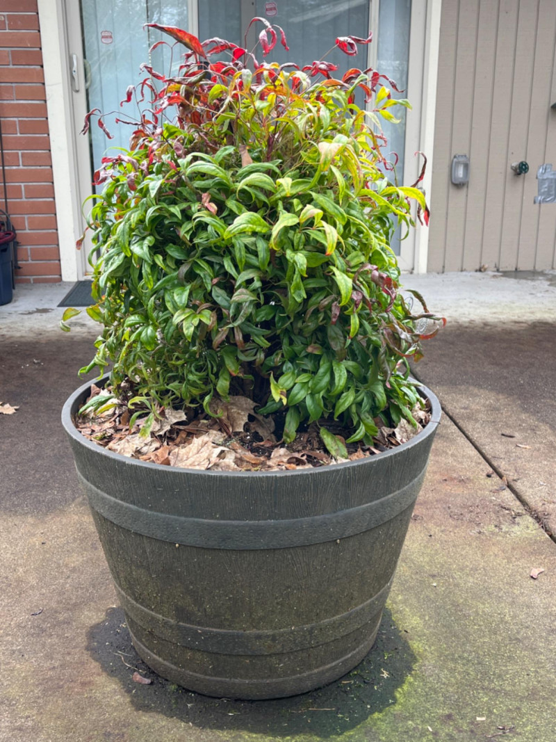 Resin Whiskey Barrel Planter with “Firepower” Bush #2 Textured wood-grain finish and dark, metal-look bands for a rustic aesthetic. Pre-drilled or "knock-out" drainage holes for healthy plant growth. Suitable for both indoor and outdoor gardening. Planter itself is 22”x15”. Plant itself is 32”.