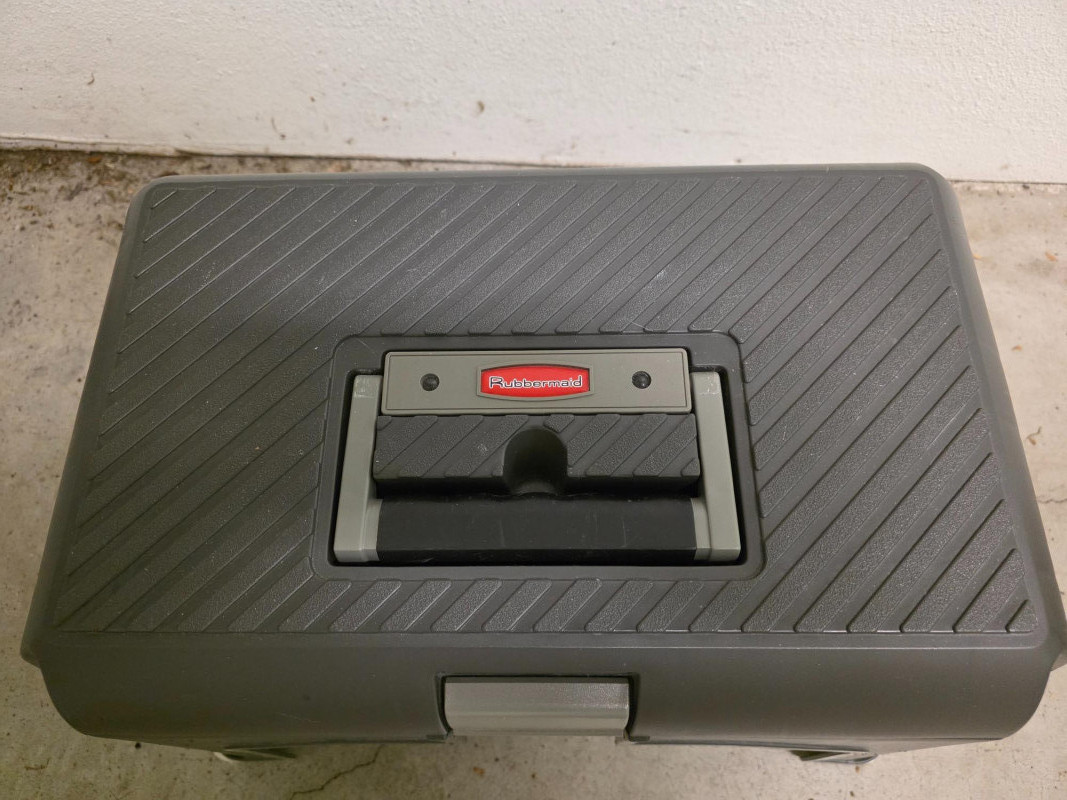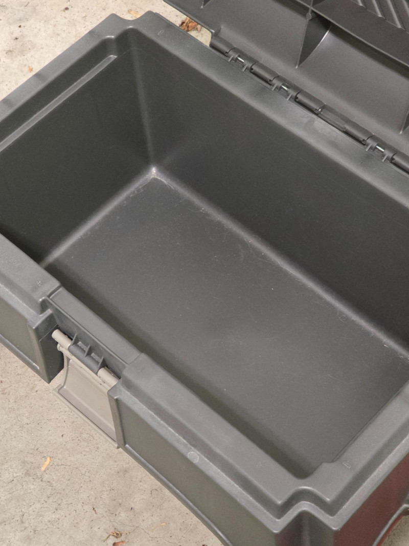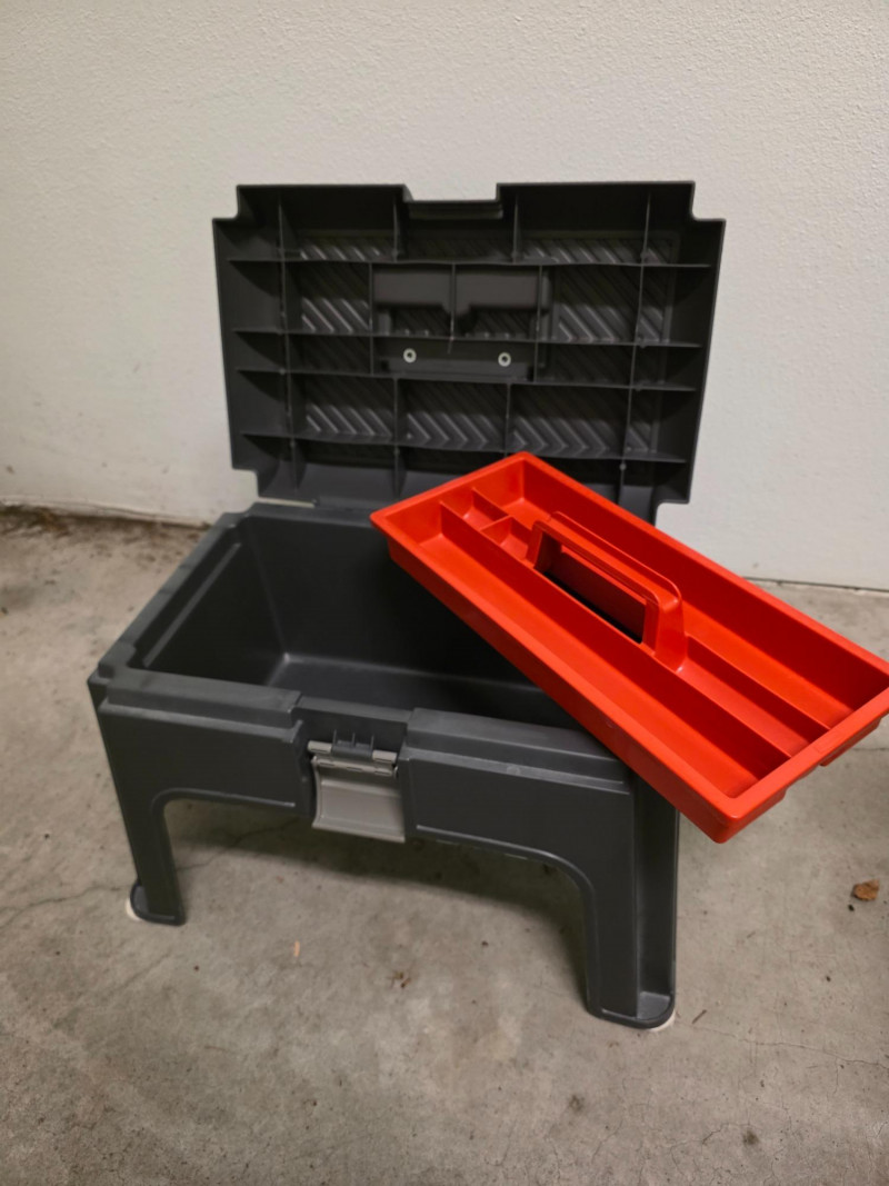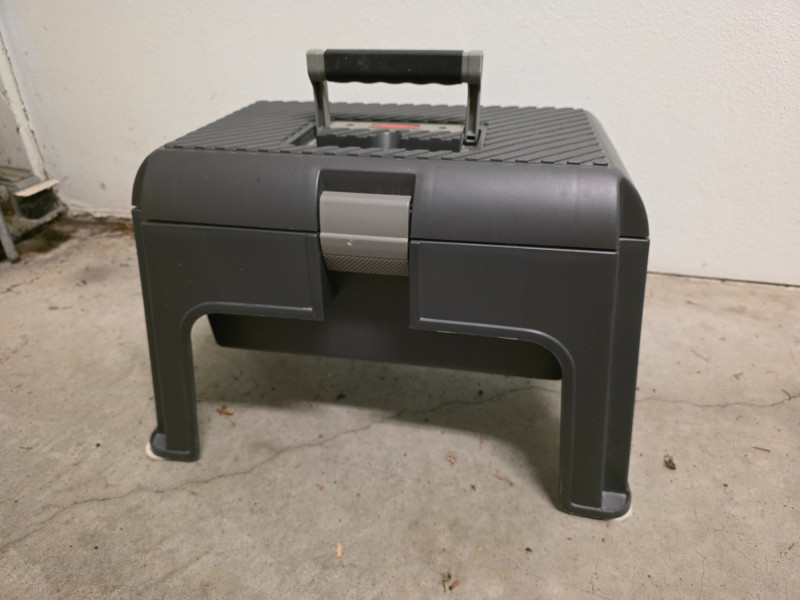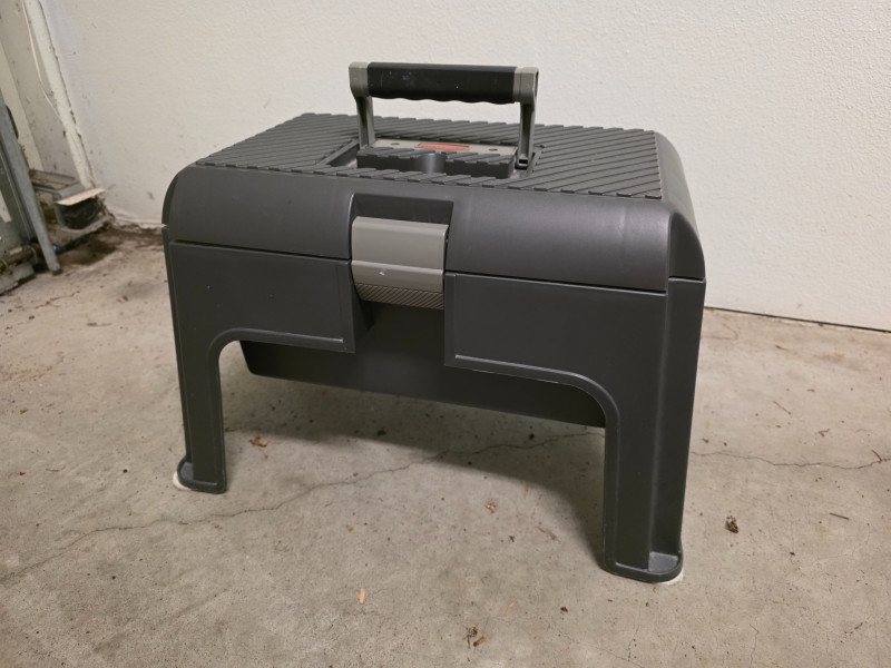 Rubbermaid Roughneck Step Stool Toolbox 2-in-1 utility item that functions as both a heavy-duty step stool and a lockable storage container Supports a weight capacity of up to 325 pounds Includes carry handle, a removable tray for small items, and tool storage In nice condition! 13.5"T x 20.5"W x 13.5"D