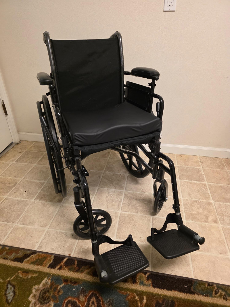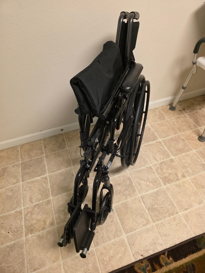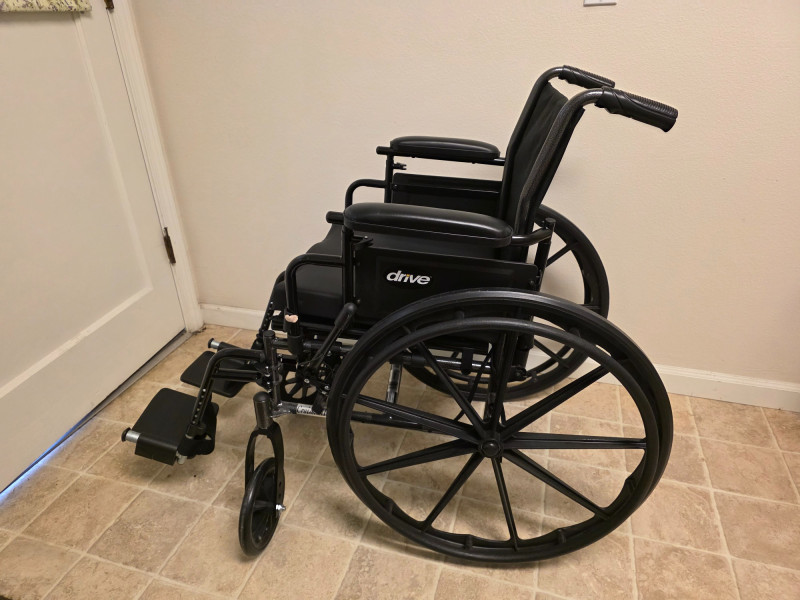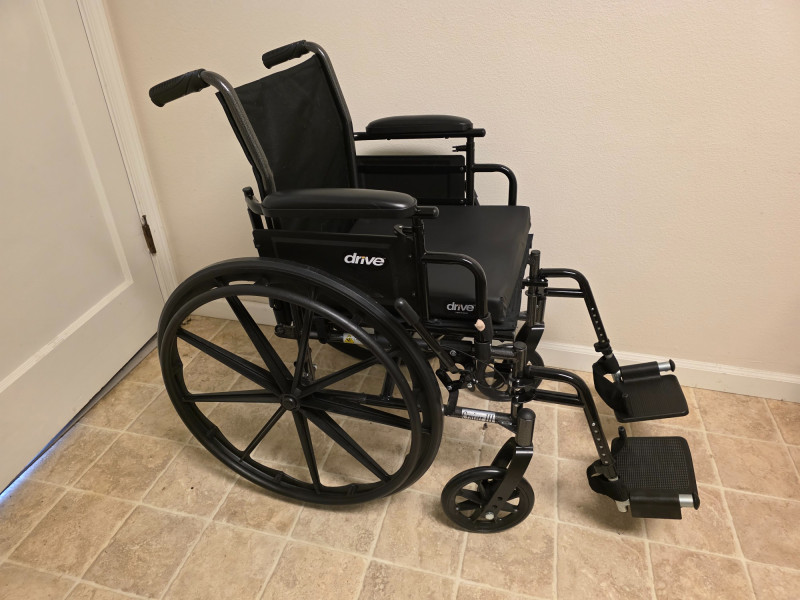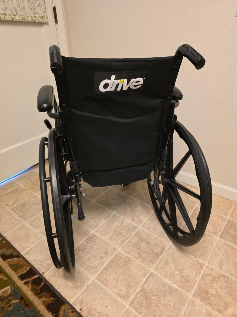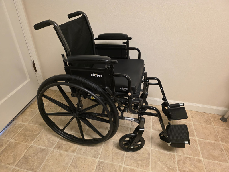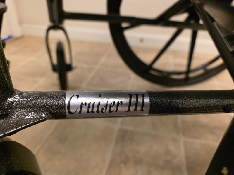 Drive Medical Cruiser III Lightweight Manual Wheelchair Drive Medical Cruiser III is a versatile, lightweight manual wheelchair featuring a durable carbon steel frame, adjustable seat depth (16"–18"), and flip-back, detachable arms Weighing approximately 36 lbs (excluding front riggings) Designed for daily use with a 300 lb weight capacity Tested - Works!