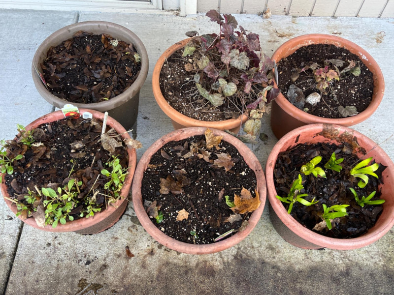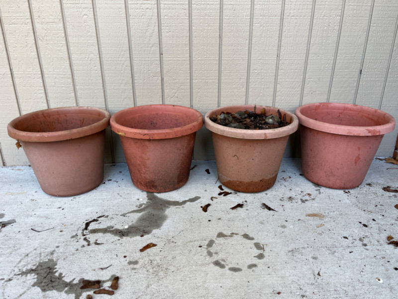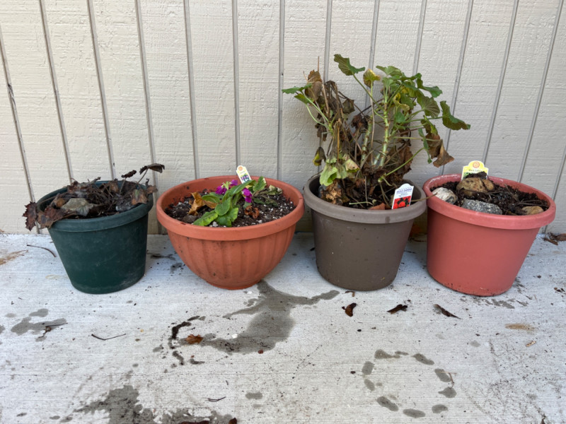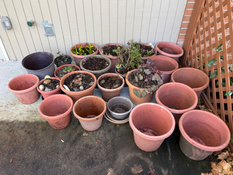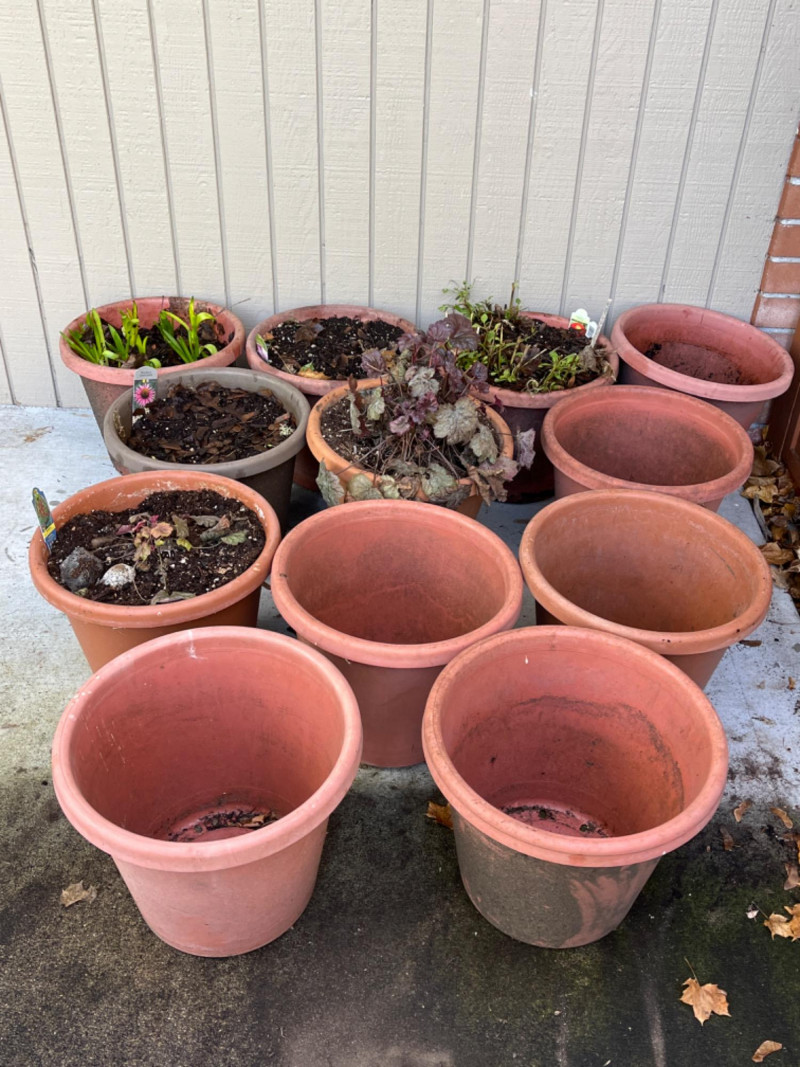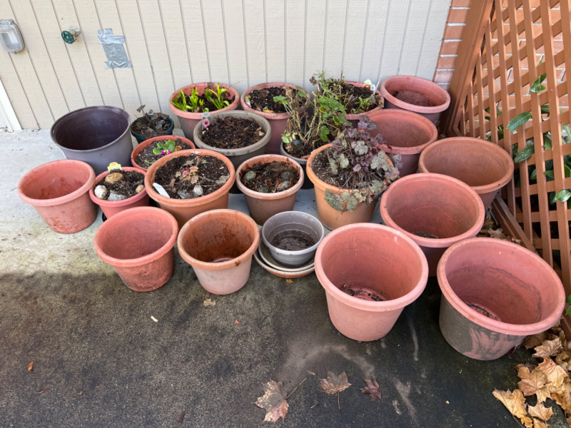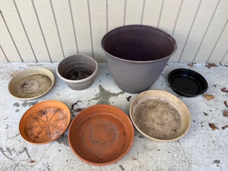 (22) Plastic Planters & (4) Planter Trays Six large planters come with plants. Two huechera’s, a Magellan scarlet, coneflower, and an unknown. Three smaller planters have a primrose, a huechera, and a geranium. Smallest pot is 10”x5”.