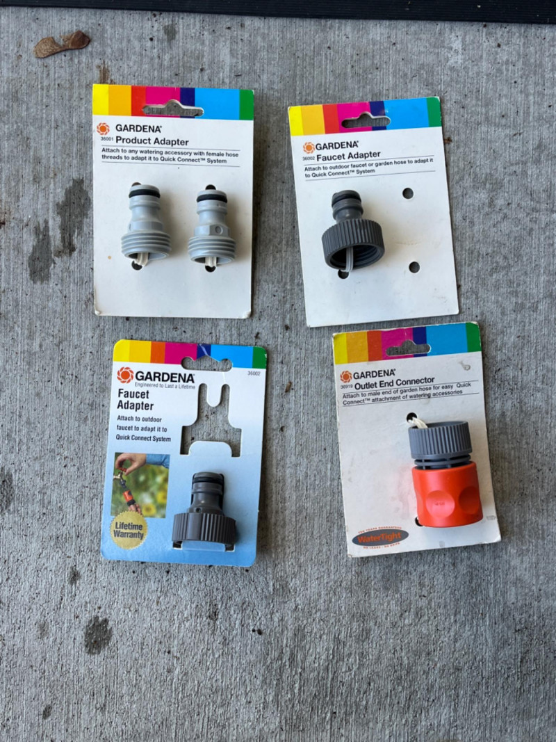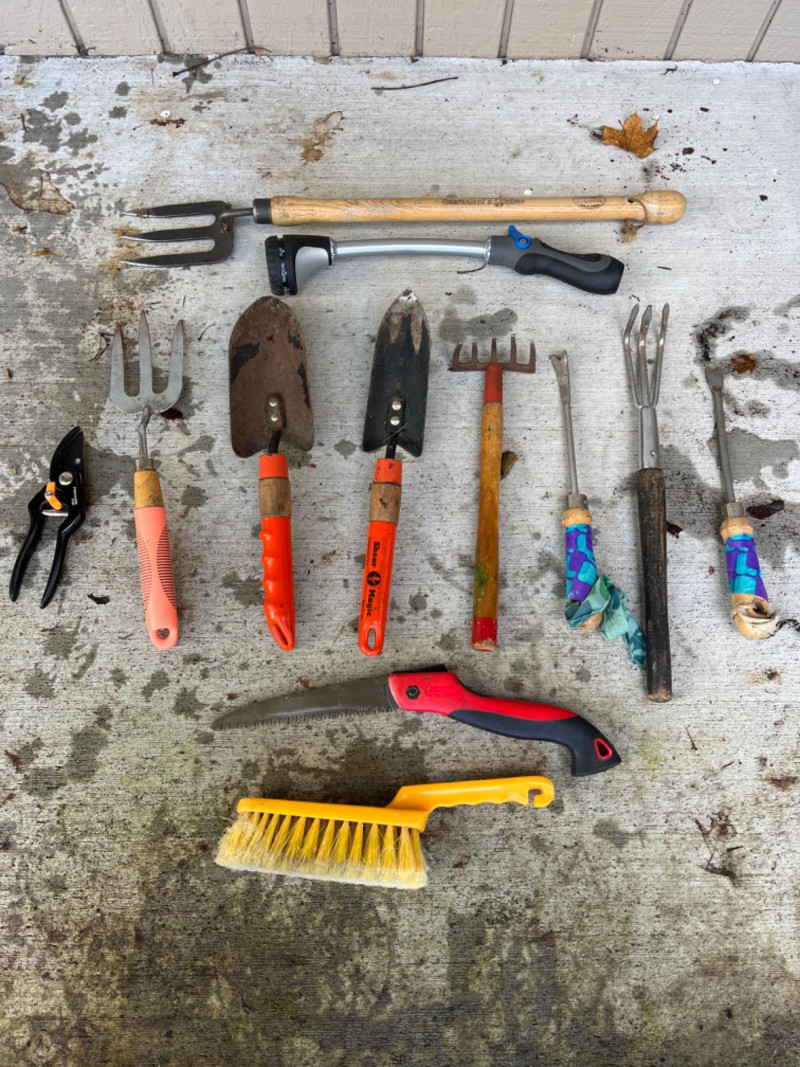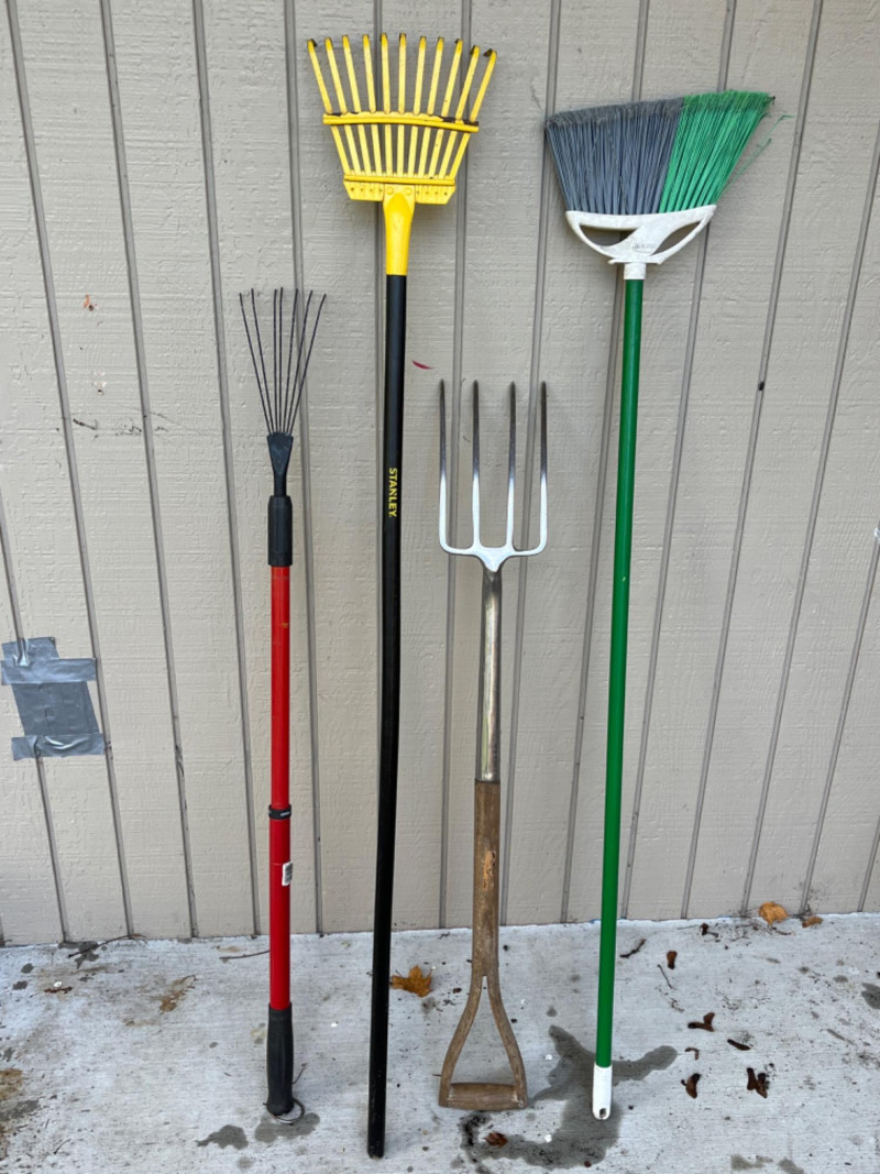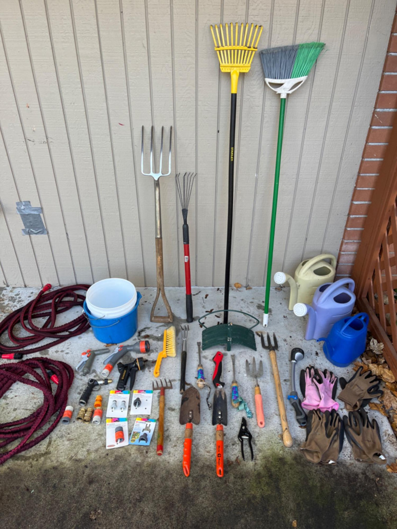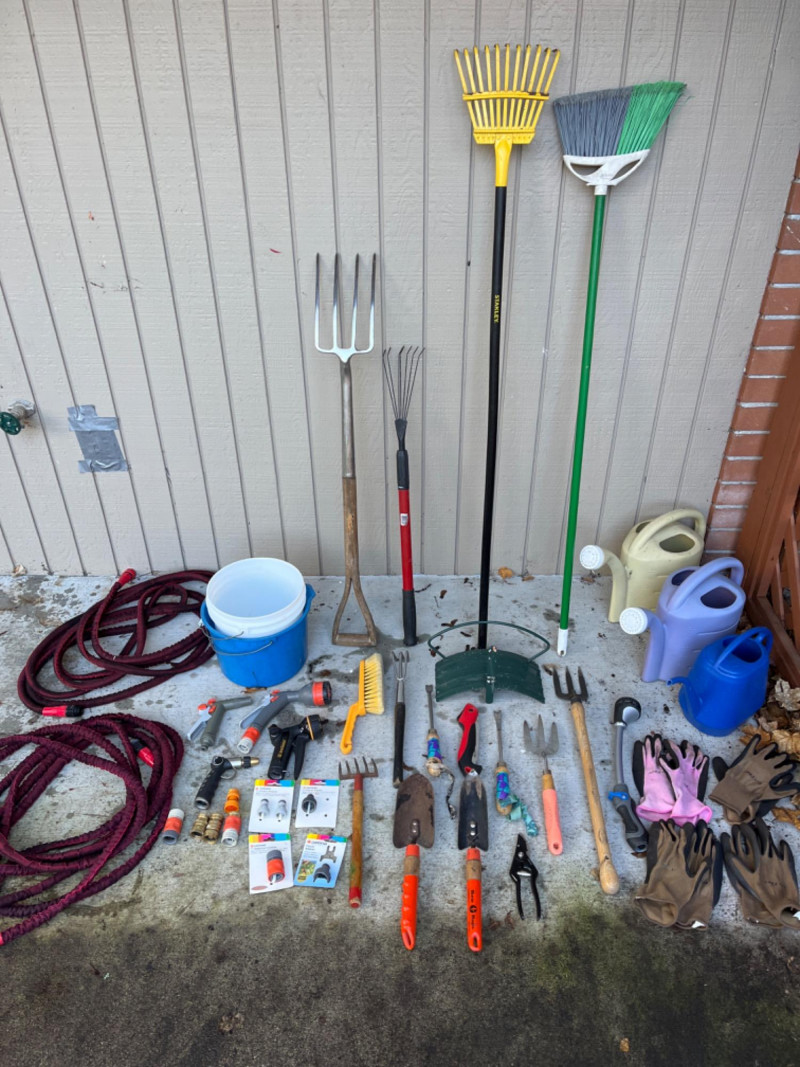 Garden Tool Essentials Stanley rake. Pitchfork Broom Two garden hoses Five hose attachments Corona Razor Tooth saw Other various hand tools Three watering cans Four pairs of gloves Hose reel Two buckets Four faucet adapters Six hose adapters