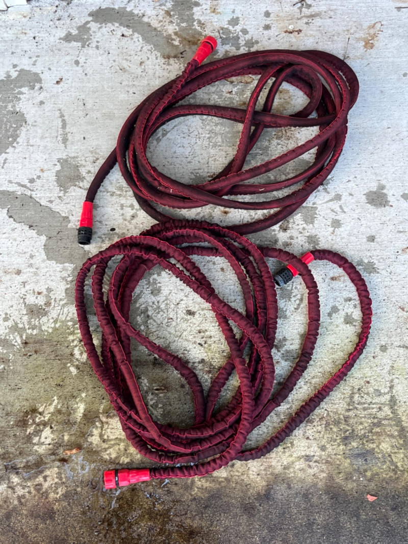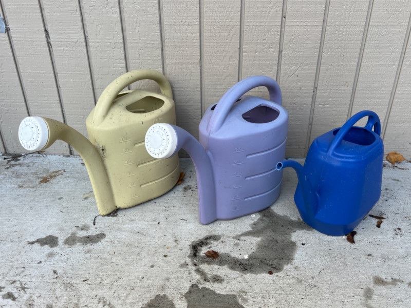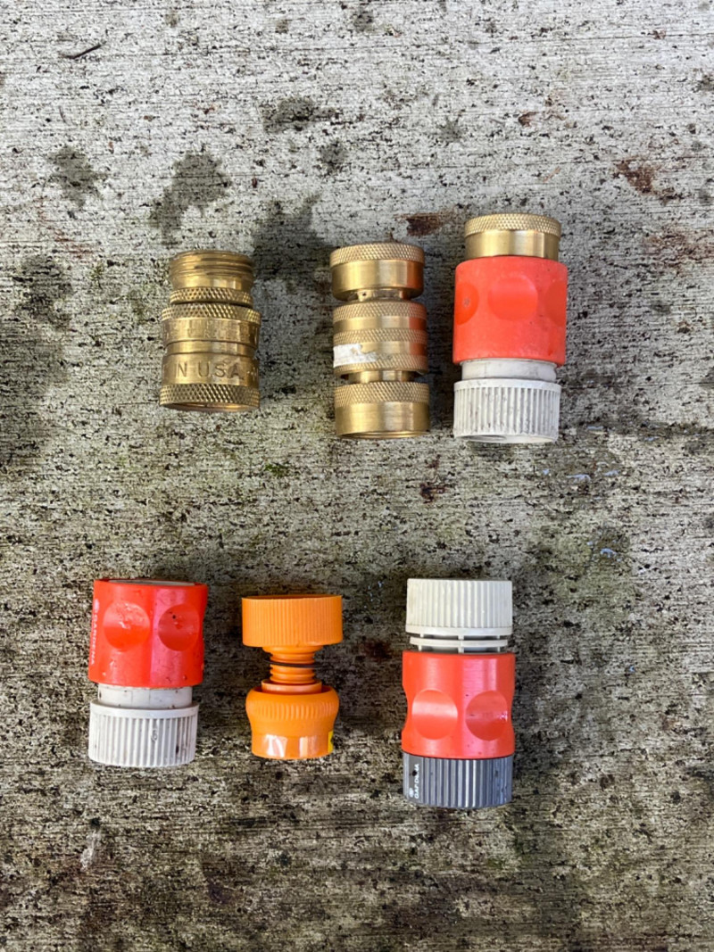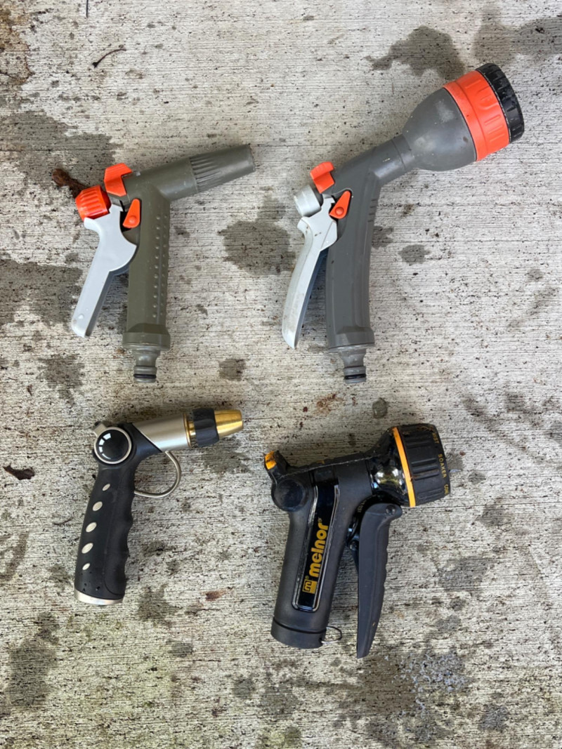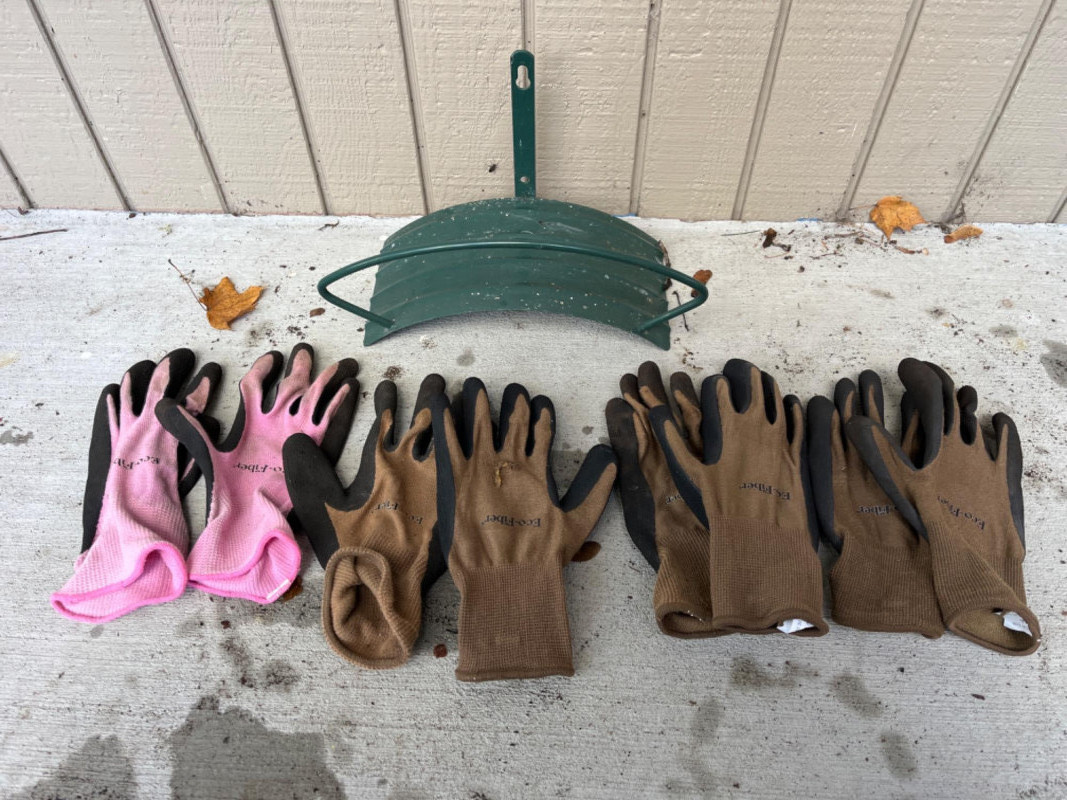 Garden Tool Essentials Stanley rake. Pitchfork Broom Two garden hoses Five hose attachments Corona Razor Tooth saw Other various hand tools Three watering cans Four pairs of gloves Hose reel Two buckets Four faucet adapters Six hose adapters