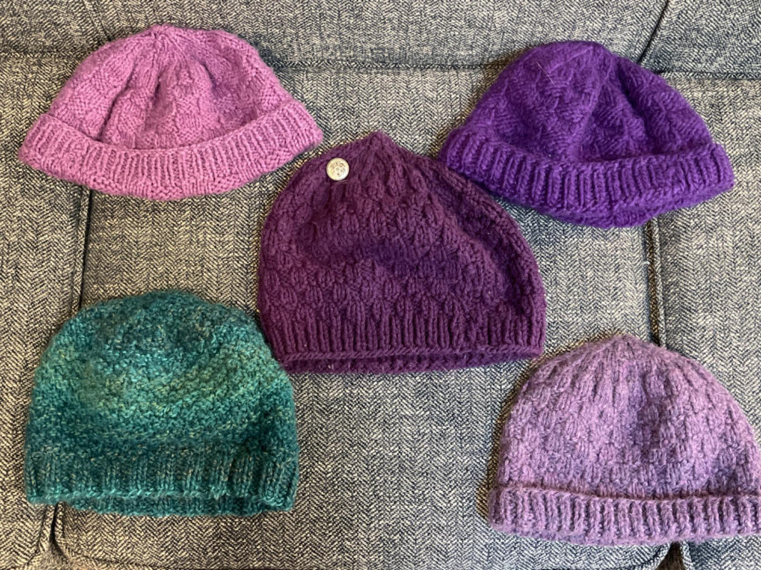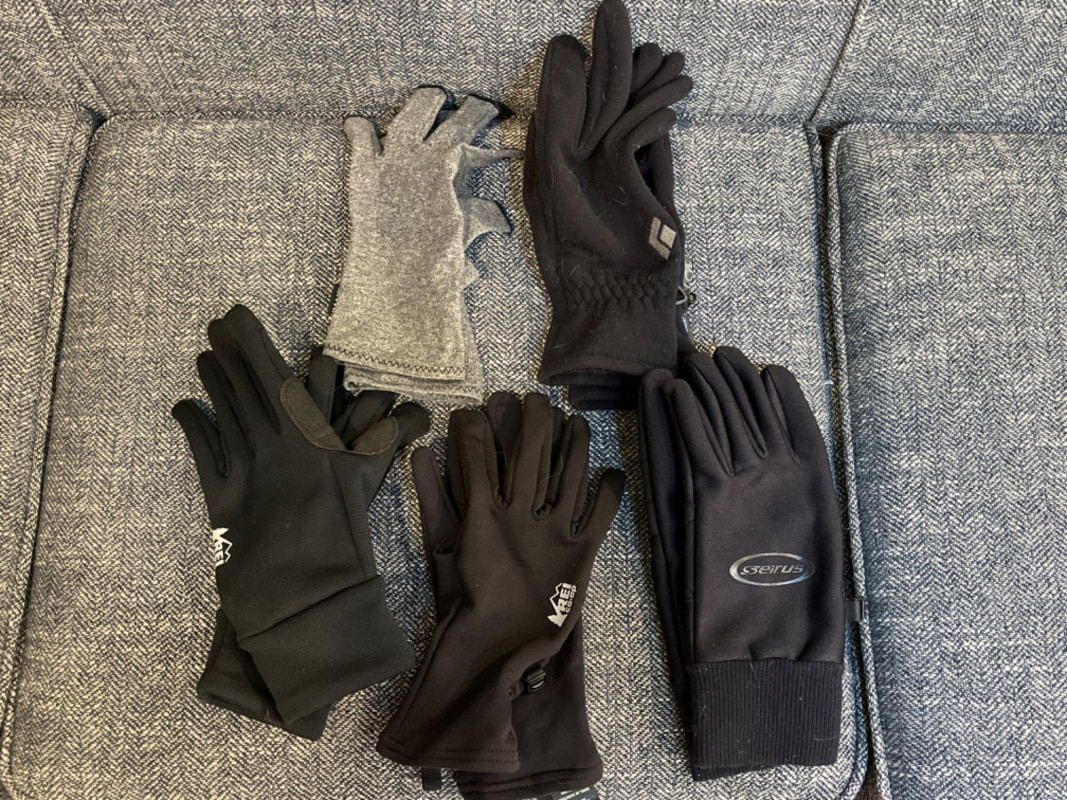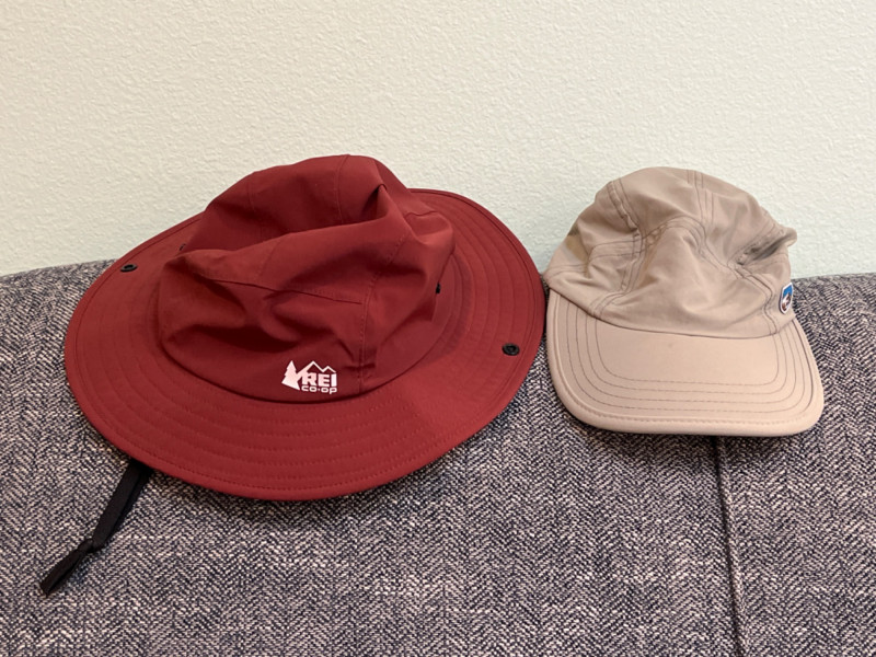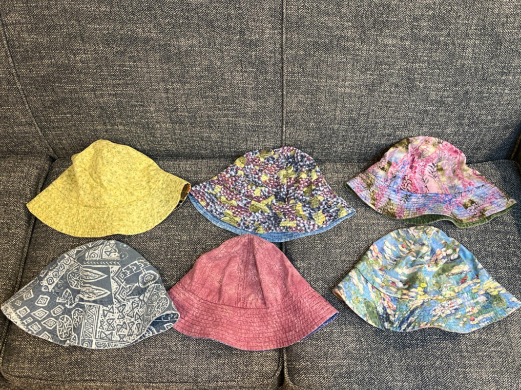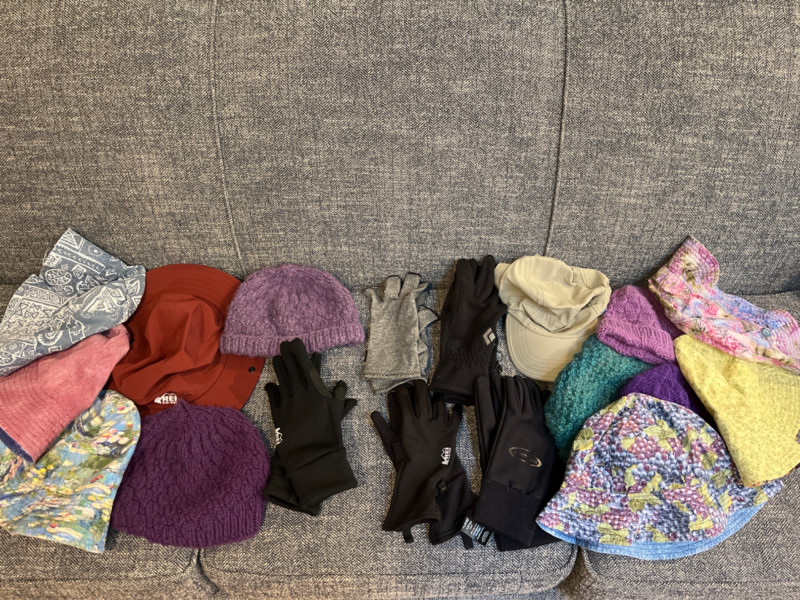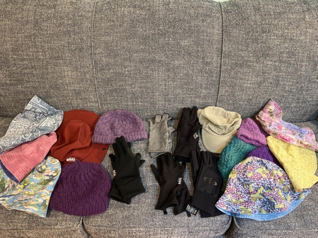 (13) Hats & (5) Pairs of Gloves One pair fingerless compression gloves Five knit hats. Six bucket hats. S/M REI red bucket hat. Grey fabric baseball cap.