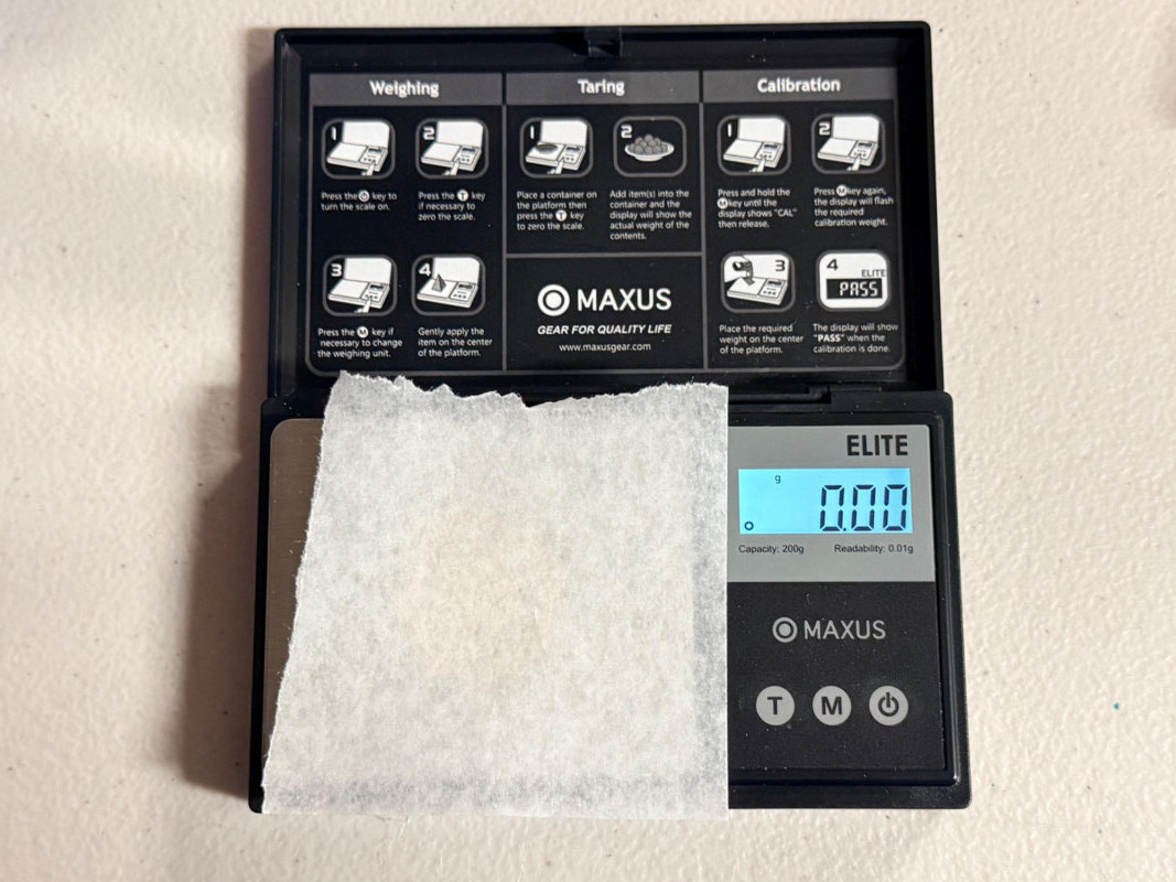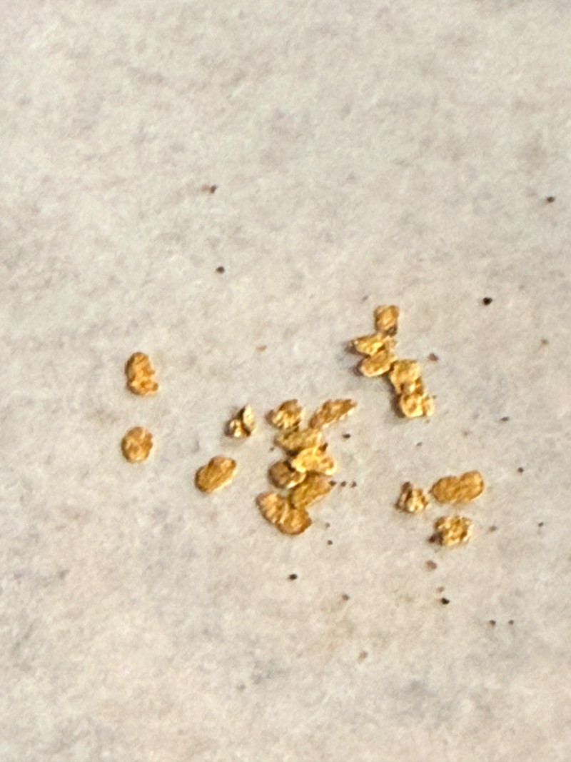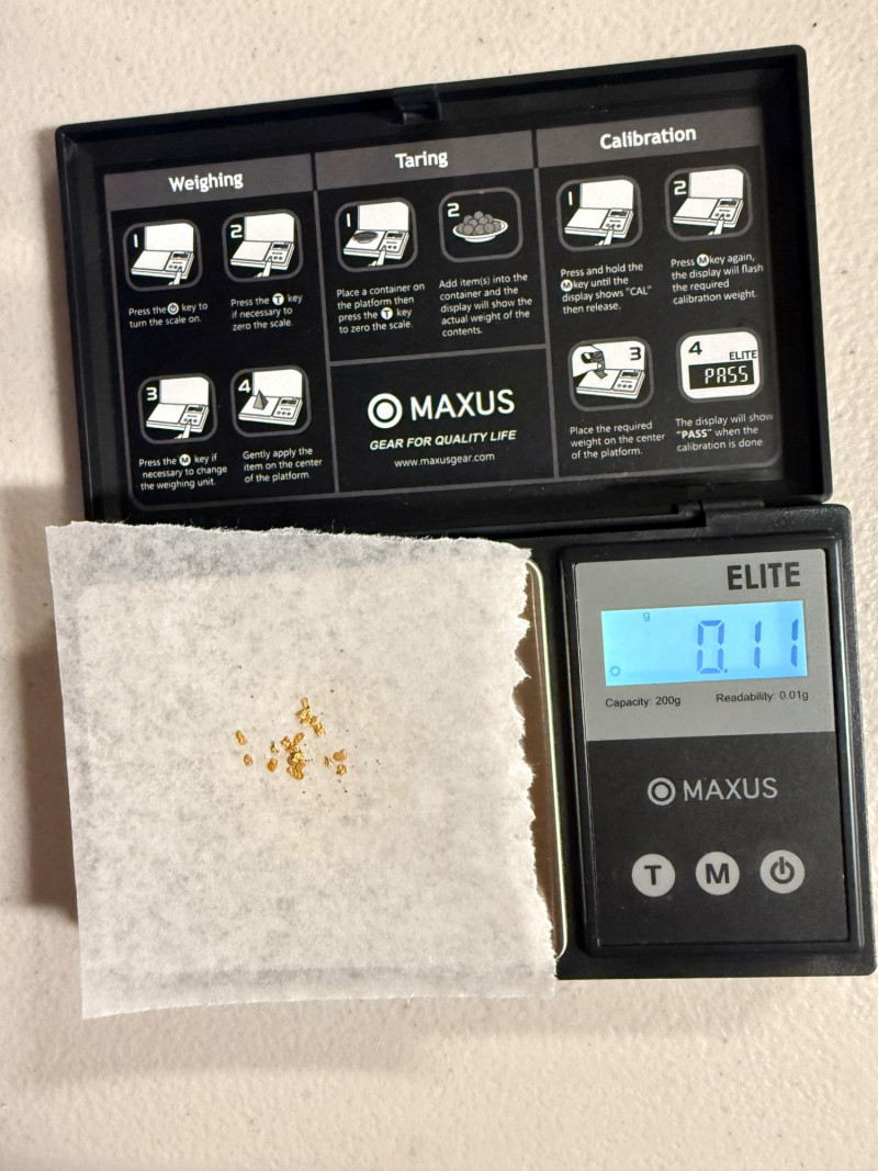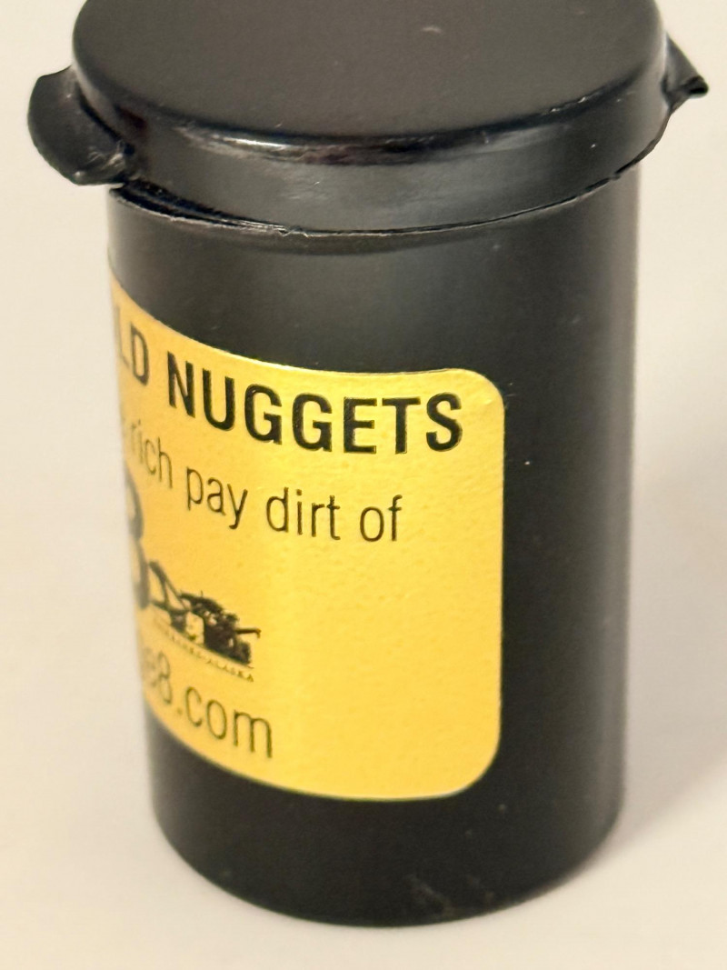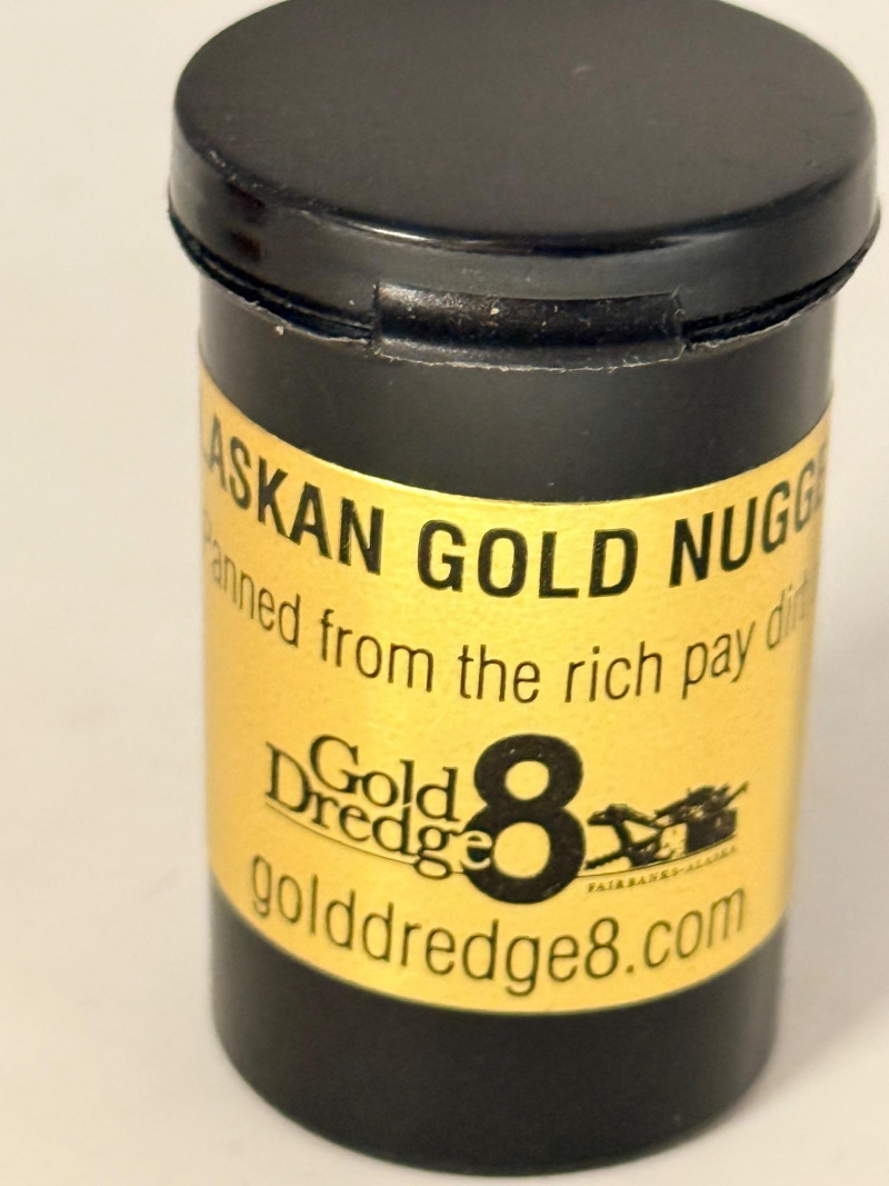 1.1 grams of Alaskan Panned Gold Nuggets in a flip top container. Alaskan Gold Nuggets, panned from the pay dirt of Gold Dredge 8. These nuggets were weighed on a jewelry scale with the paper tared weighed and then with the nuggets added.