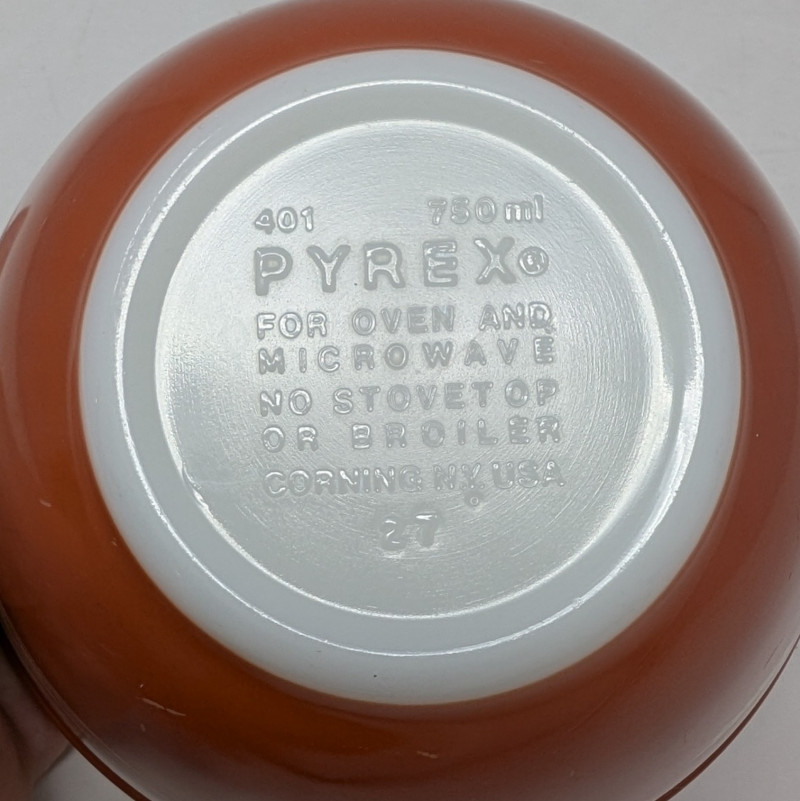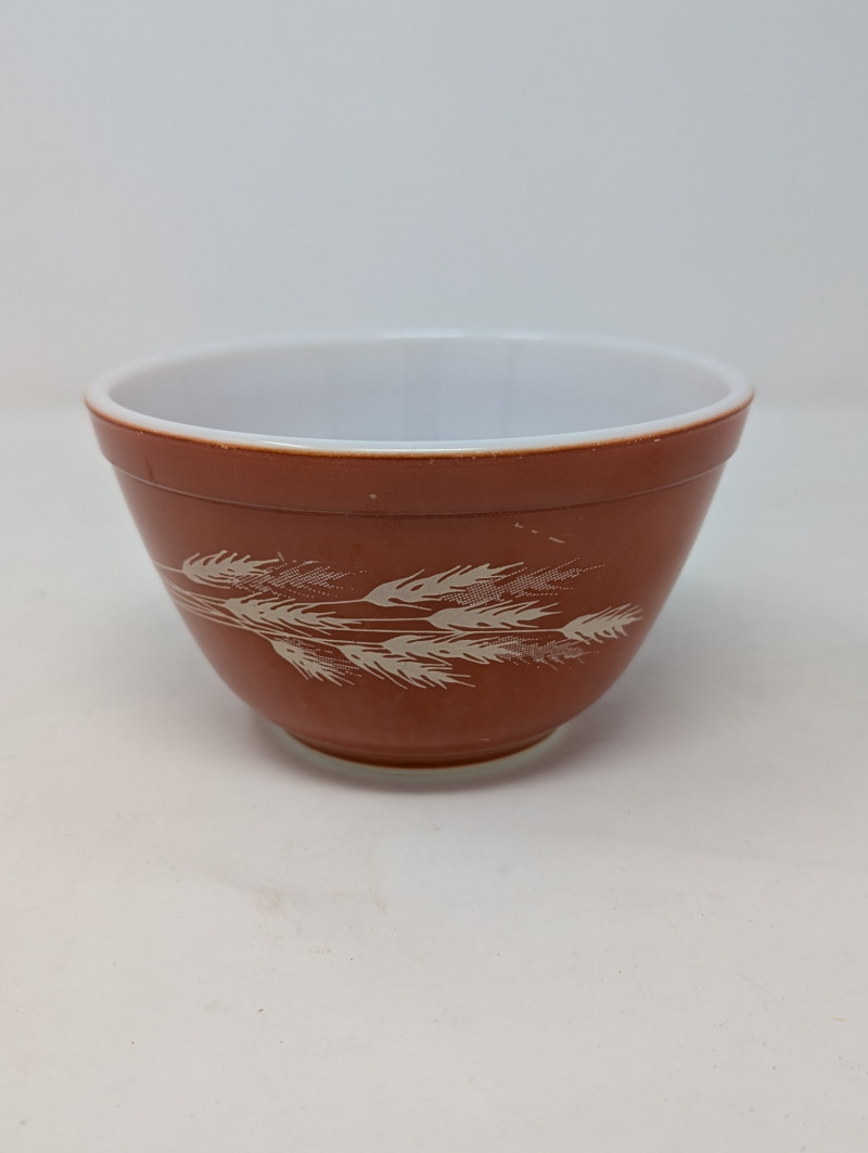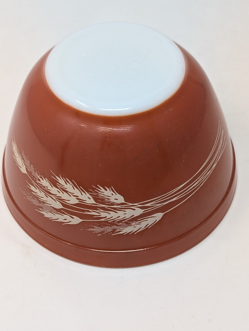 Vintage Autumn Harvest Pattern Pyrex Oven Ware 750ml Mixing Bowl Pyrex Oven Ware 750ml Mixing Bowl #401 Manufactured between 1979-1986, featuring a rust-orange exterior with white wheat stalk pattern 3.25"T x 5.5"W See pics for condition, no cracks or chips