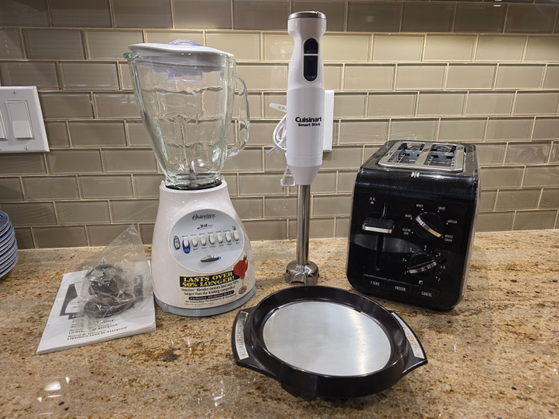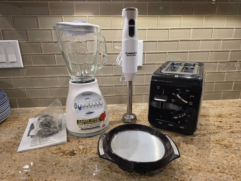 (4) Small Kitchen Appliances - Blender, Toaster, Coffee Warner (1) Oesterizer 14-Speed Blender (1) Hamilton Beach Toaster With Sure-Toast (1) Melitta Coffee Warmer (1) Cuisinart Smart Stick 2-Speed Hand Blender All Tested - All Work!