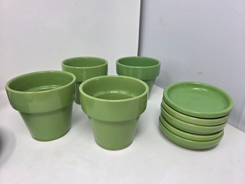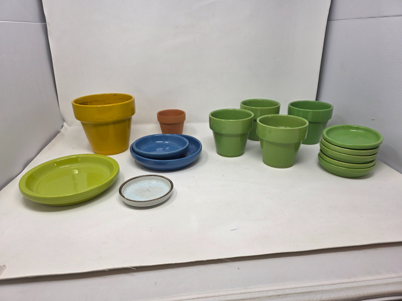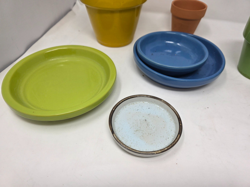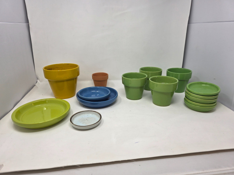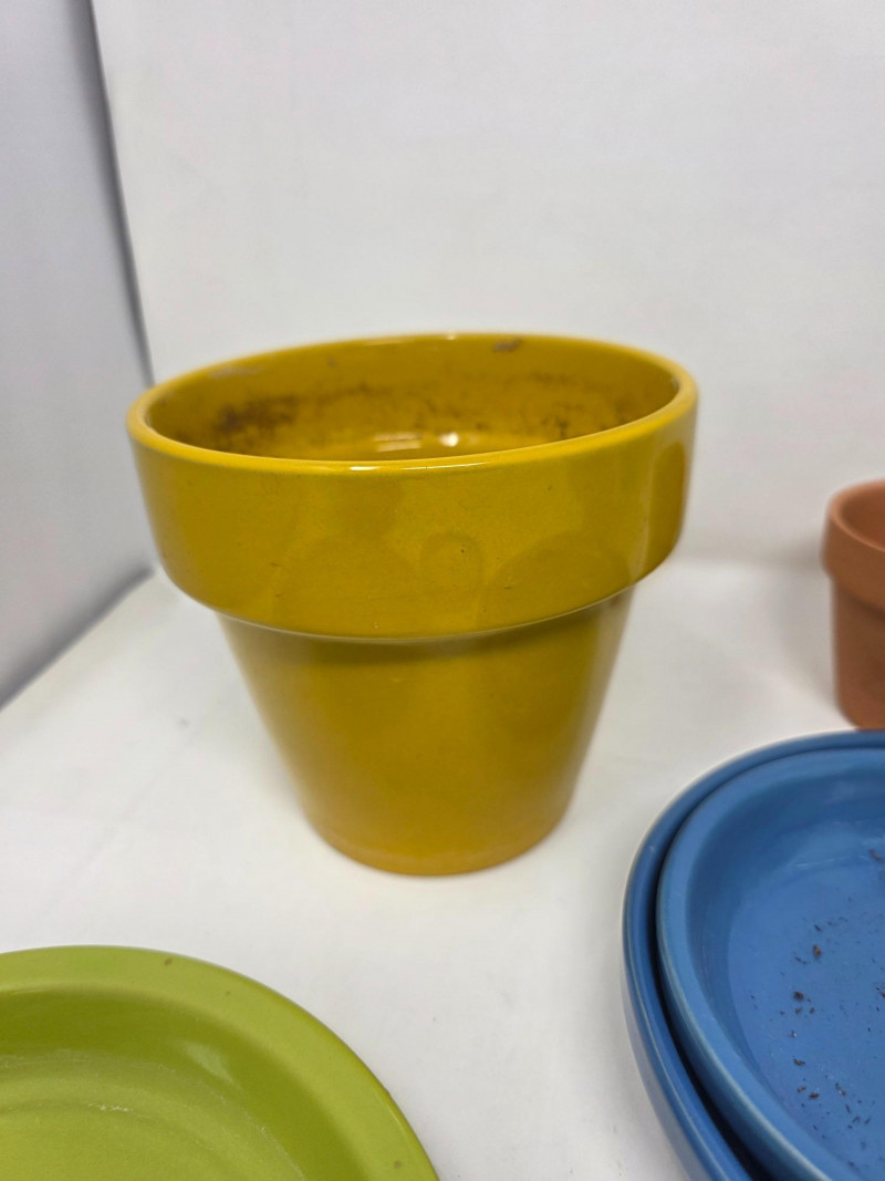(6) Small Colorful Ceramic Flower Pots & (9) Saucers (4) Green, (1) yellow and (1) clay ceramic flower pots (5) Green saucer (2) Blue saucers (1) Pale green saucer Start your indoor garden this Spring!