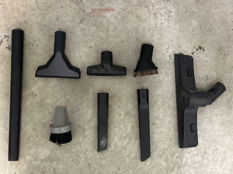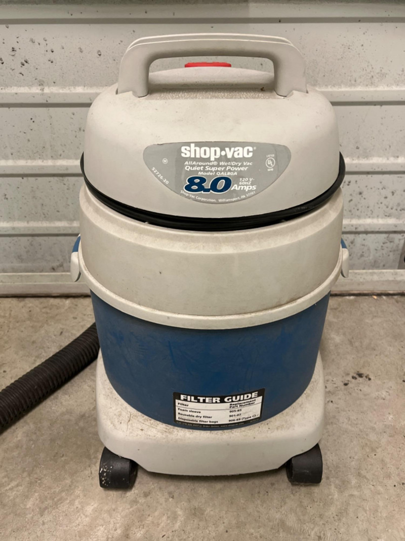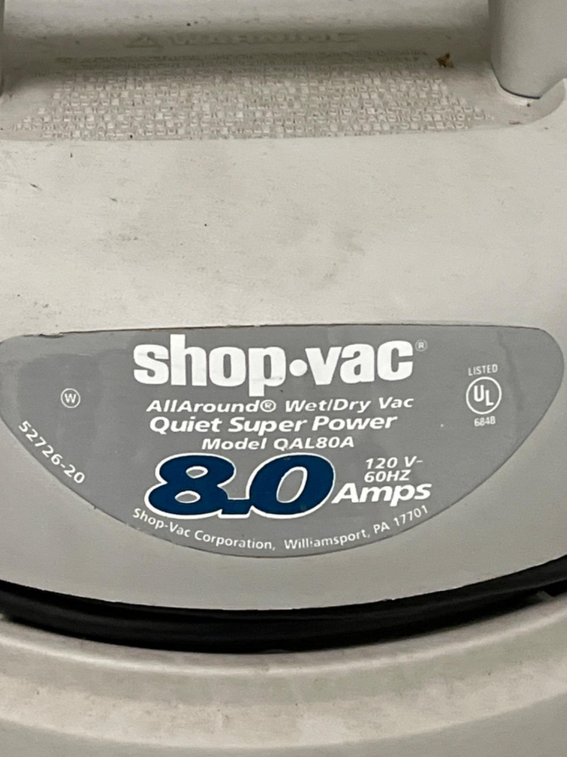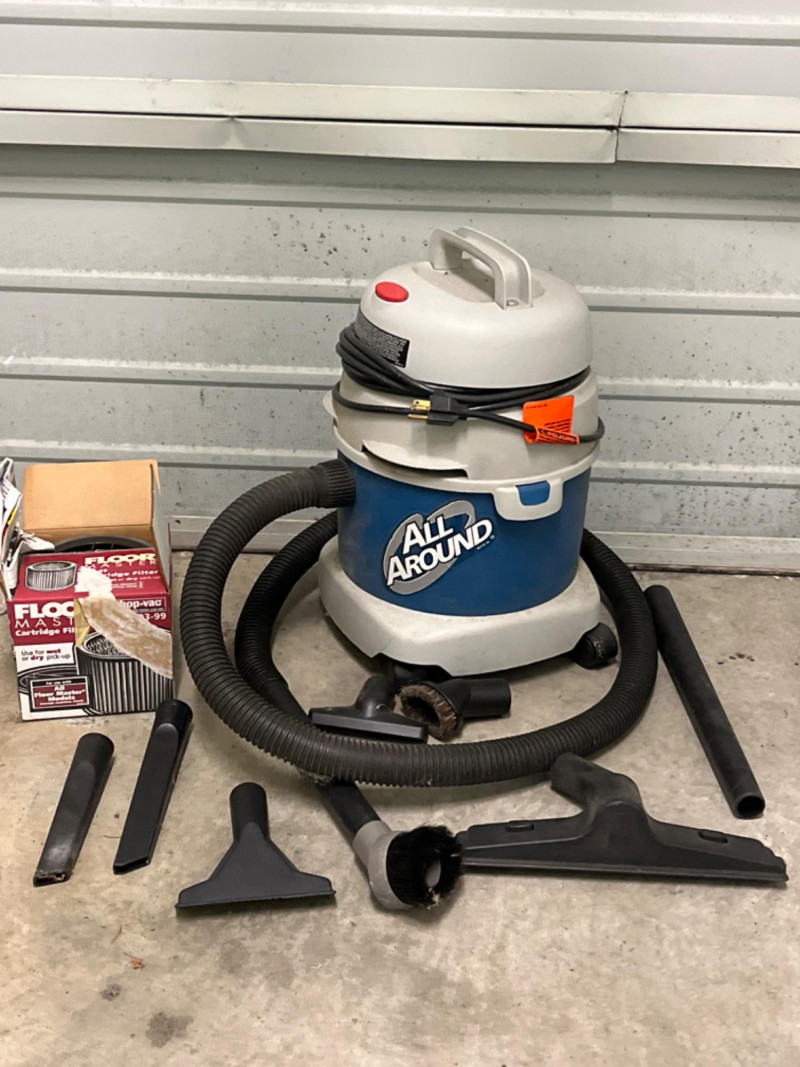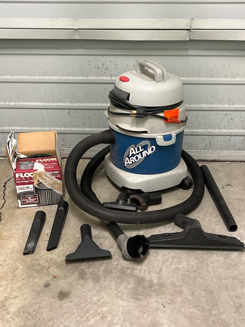 All Around 3 Gal. Wet/Dry Shop Vac 3 gallons capacity. 8.0 amps. Portable design with a top carry handle and 360-degree swivel casters for mobility. Eight attachments and additional filter.