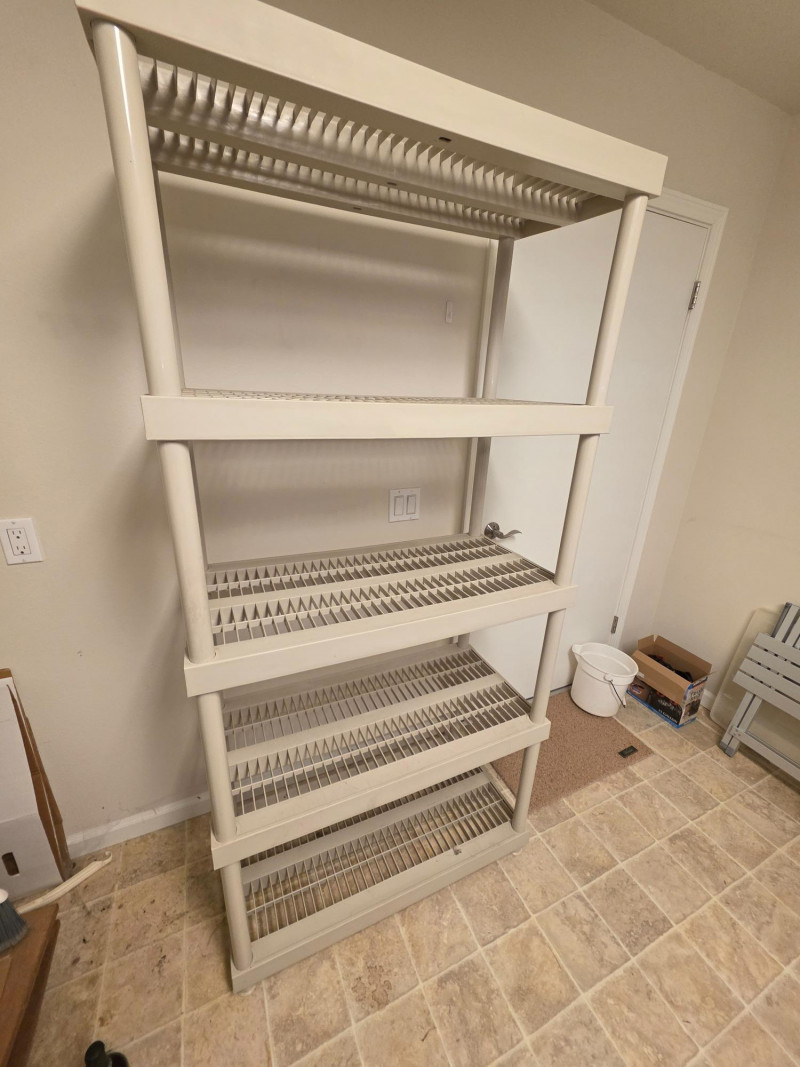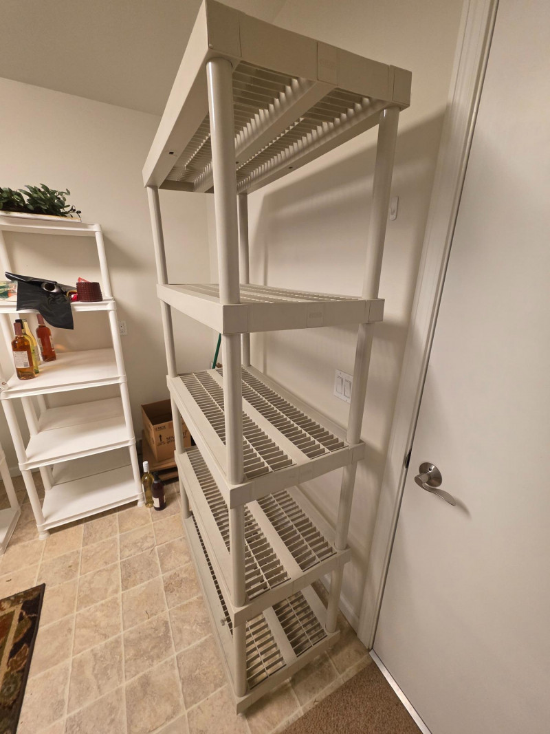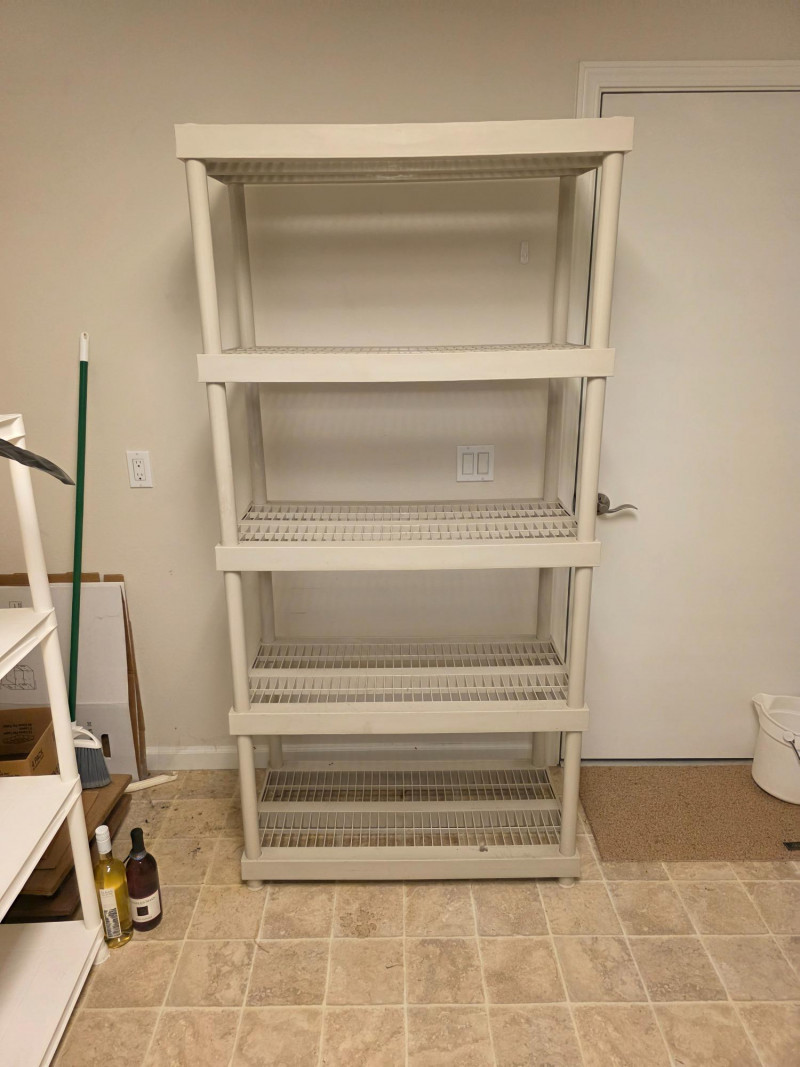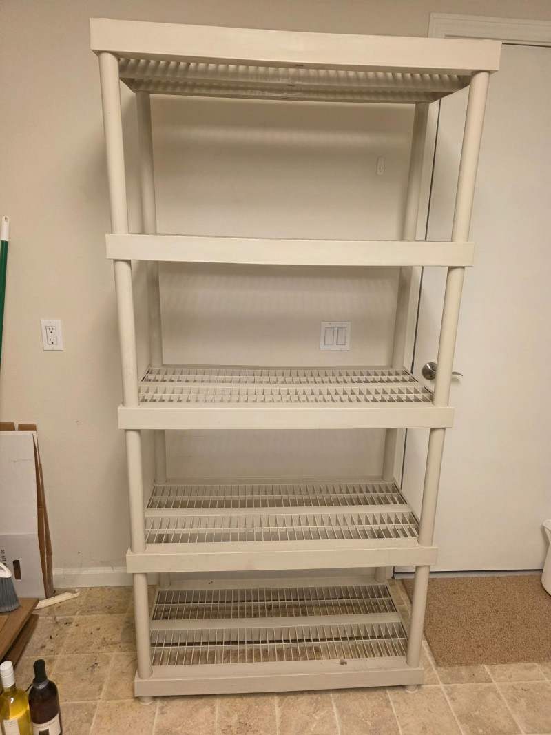 Tan Plastic 5-Tier Ventilated Storage Unit Heavy-duty resin shelves are designed for utility spaces like garages, basements, or pantries 73"T x 35.5"W x 17.75"D