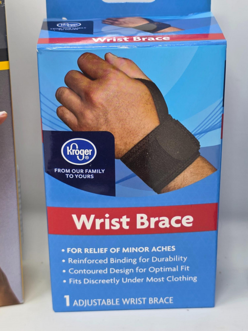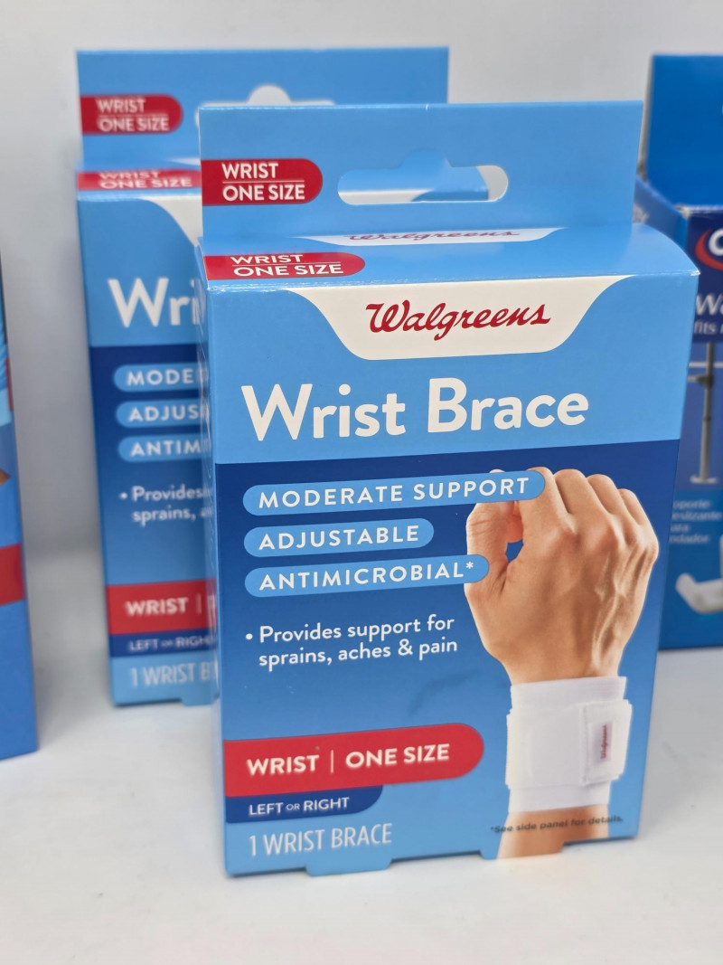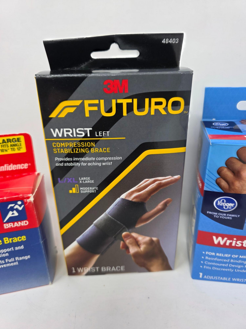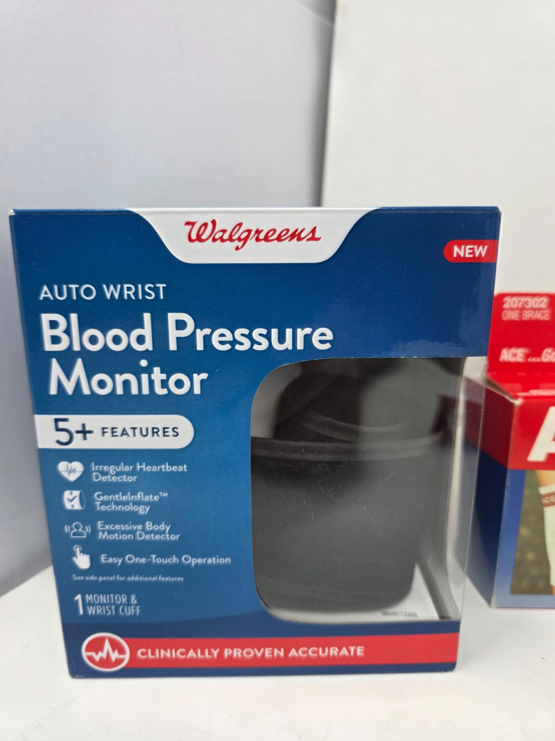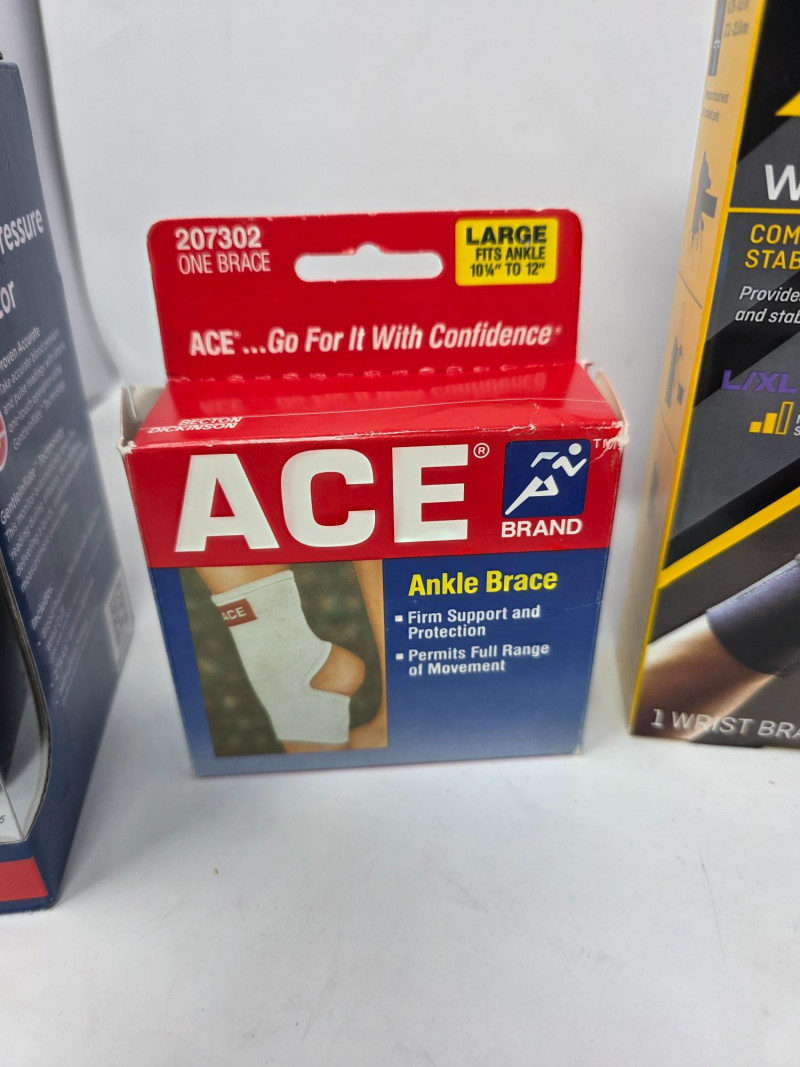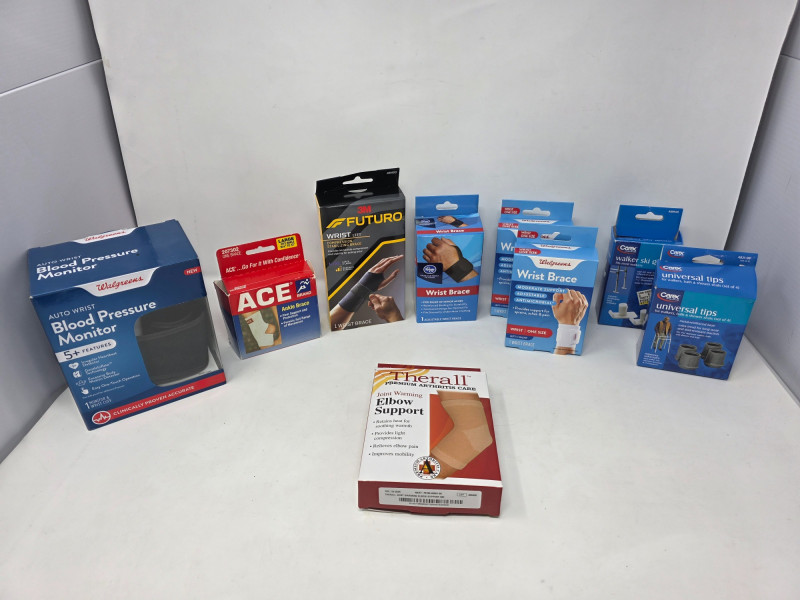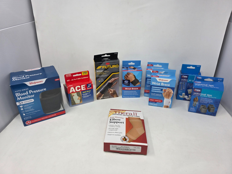 Digital Blood Pressure Monitor, Braces & Walker Tips (1) Walgreens Auto Wrist Blood Pressure Monitor (1) Therall Joint Warming Elbow Support (1) ACE Ankle Brace (L) (1) Futuro Left Wrist Compression Stabilizing Brace (L/XL) (1) Kroger Adjustable Wrist Brace (2) Walgreens Adjustable Wrist Brace (2) Carex Universal Tips (Walkers, Shower & Bath Chairs) (3) Reacher/Grabber Tools (1) Flexible Claw Pickup Tool