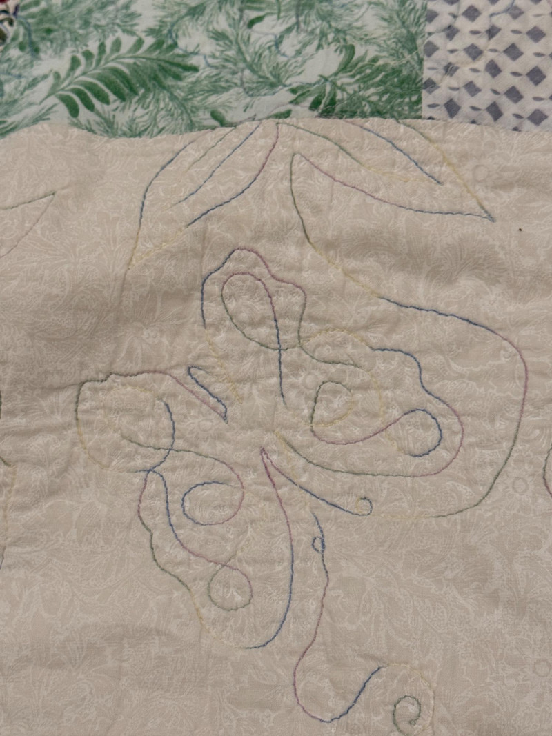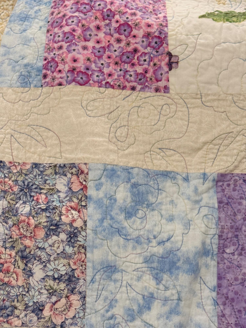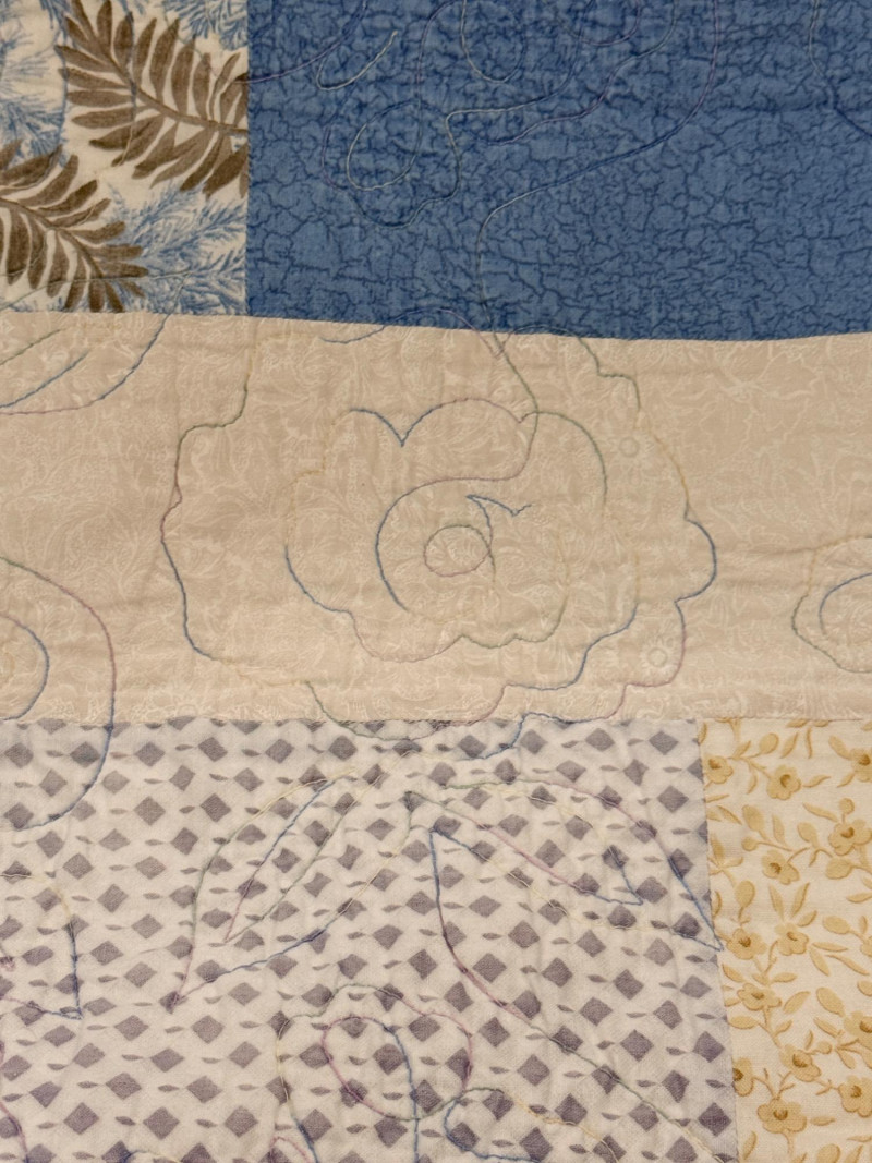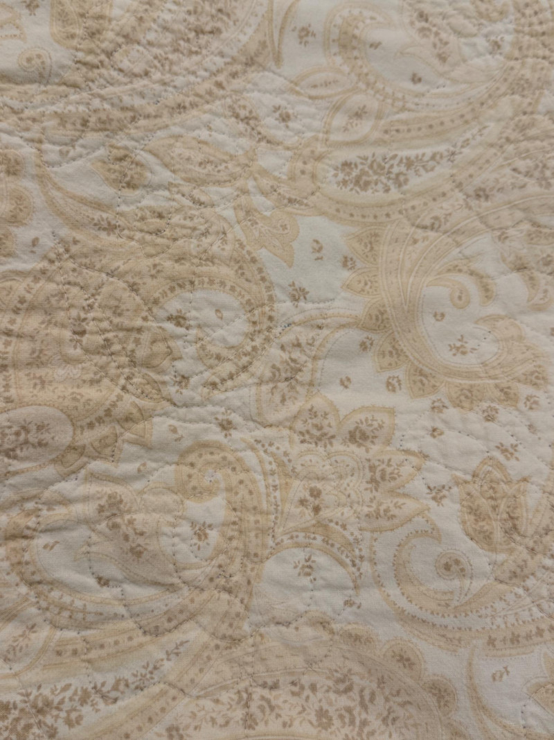 Handmade Quilt with Yellow Paisley Backing No damage or wear noted. Rounded corners of the lower edge. Beautiful multi-color thread quilting.