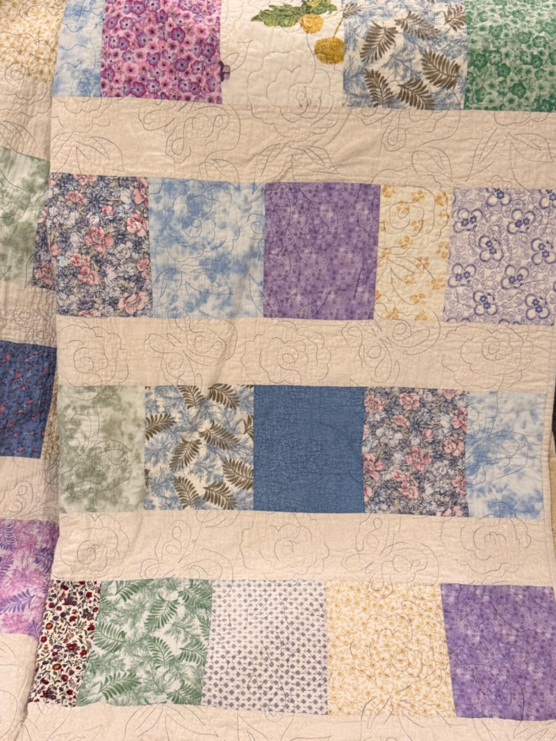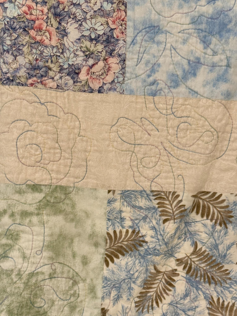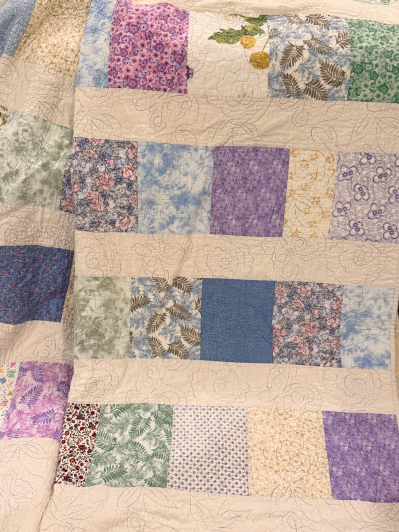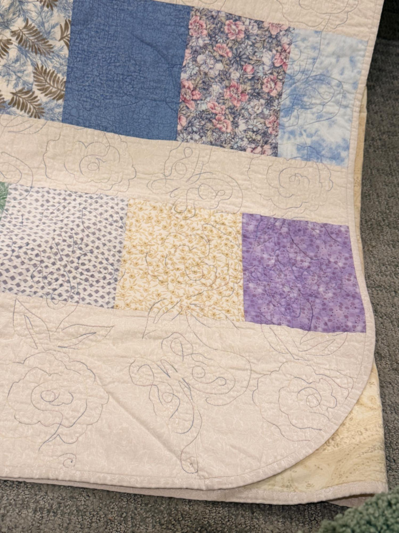 Handmade Quilt with Yellow Paisley Backing No damage or wear noted. Rounded corners of the lower edge. Beautiful multi-color thread quilting.