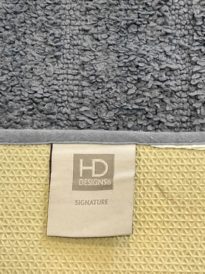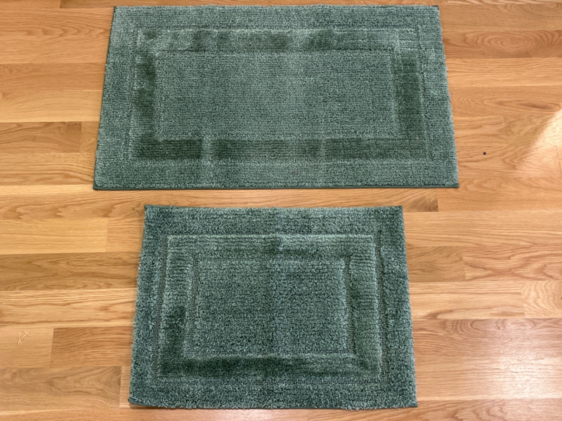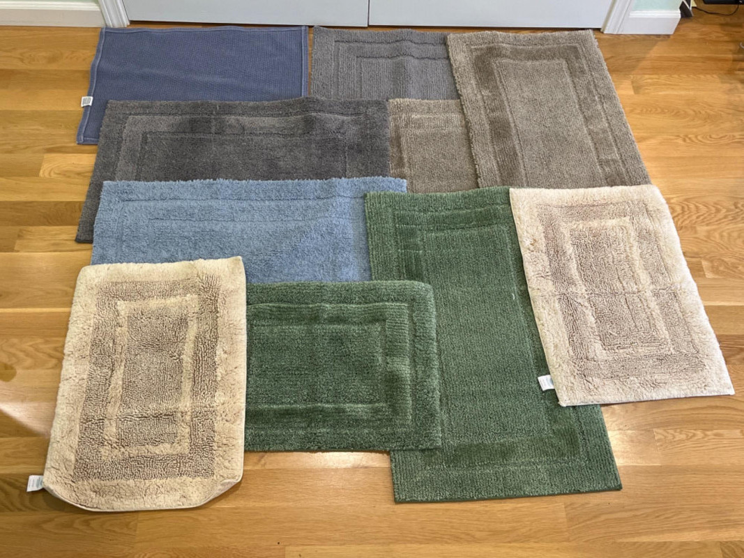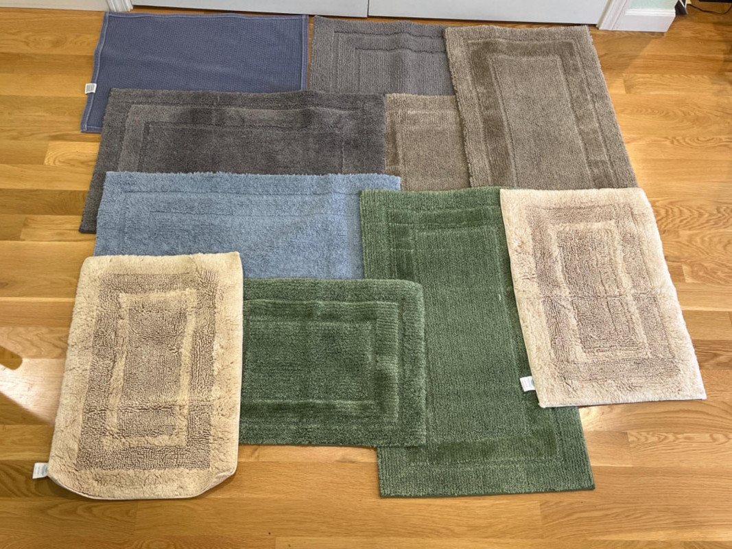Bath Rugs by HD Designs - Martha Stewart - Hotel Collection Two blue rugs. Two beige rugs. Two dark grey rugs. Two green rugs. One dark tan rug. Largest rug is 33”x20”. Smallest rug is 23”x17”.