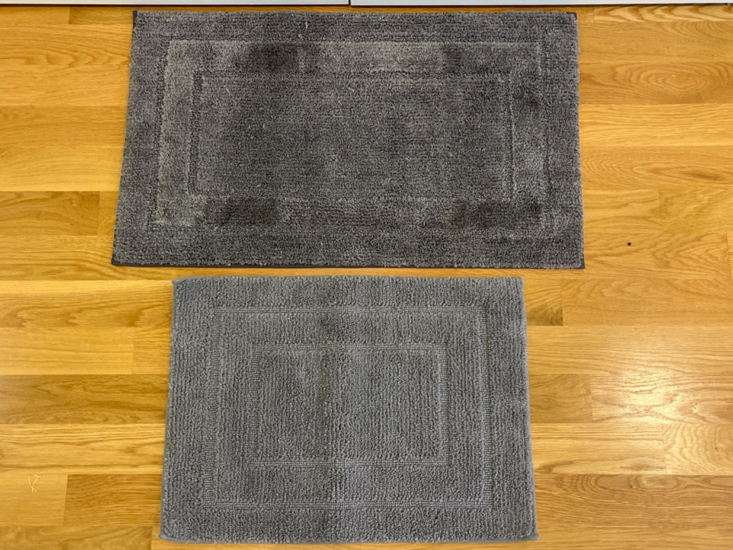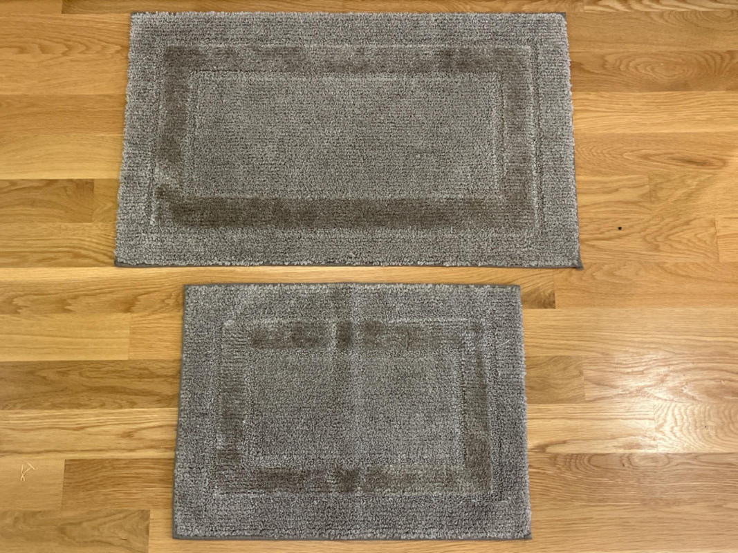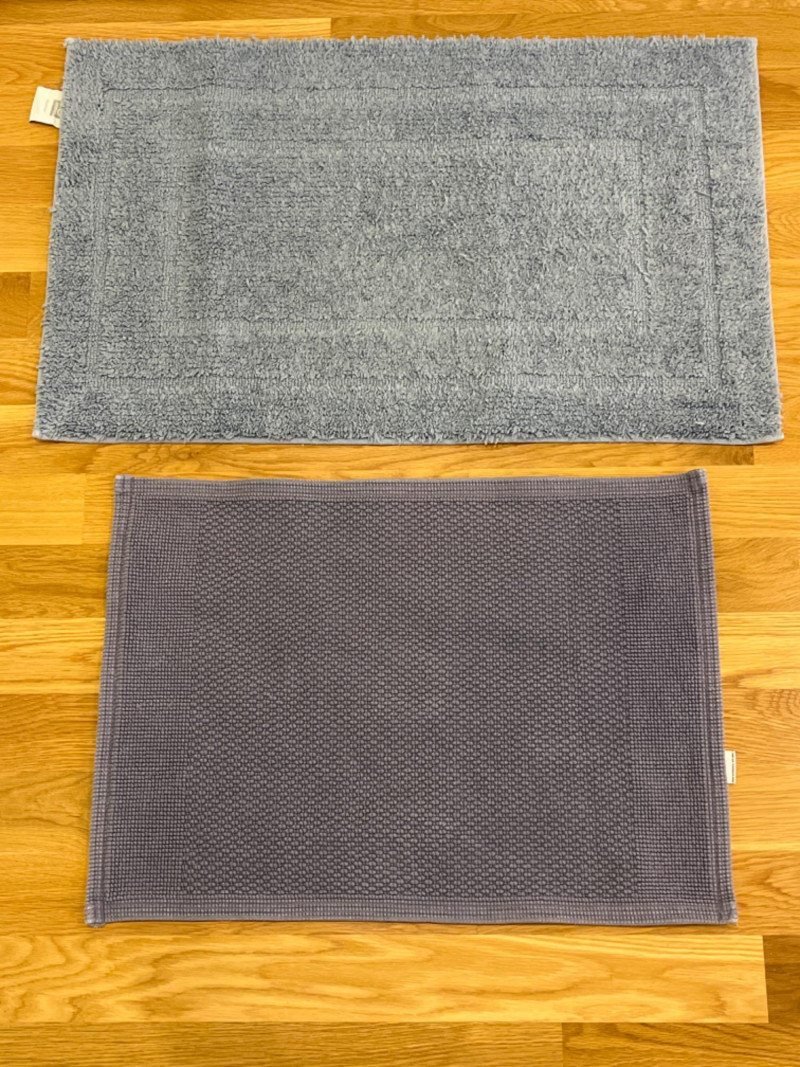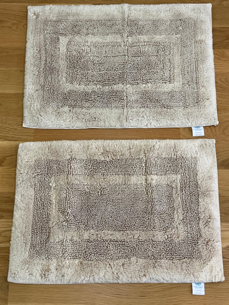 Bath Rugs by HD Designs - Martha Stewart - Hotel Collection Two blue rugs. Two beige rugs. Two dark grey rugs. Two green rugs. One dark tan rug. Largest rug is 33”x20”. Smallest rug is 23”x17”.