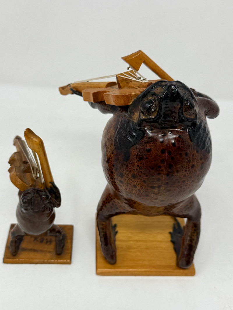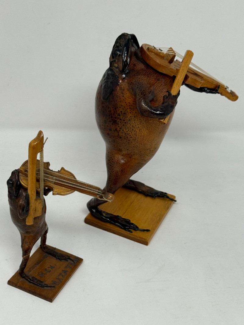 (2) Violin Playing Taxidermy Cane Toads - Mexican Folk ArtI’m Large toad is 4.5”x5”x7” tall. Both toads in excellent condition for a toad playing the violin. No damage noted. Unique folk art pieces.