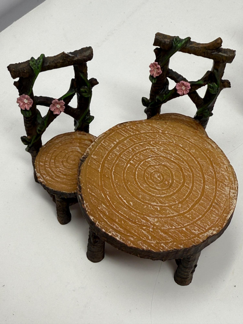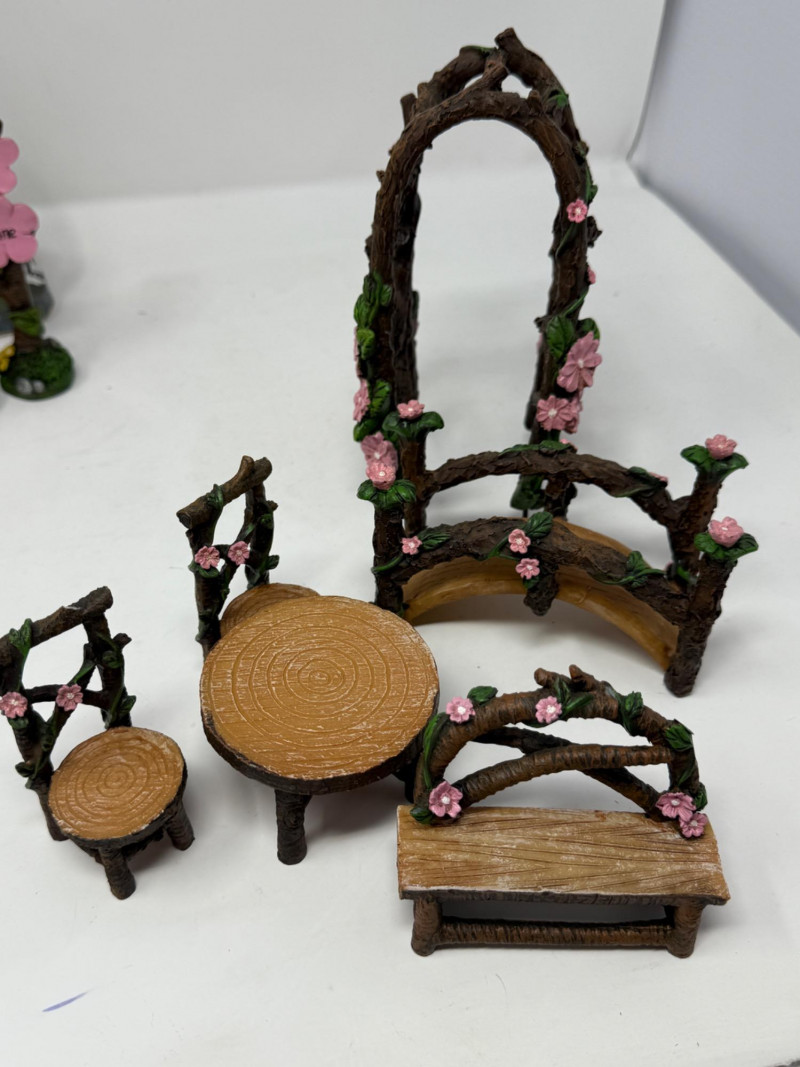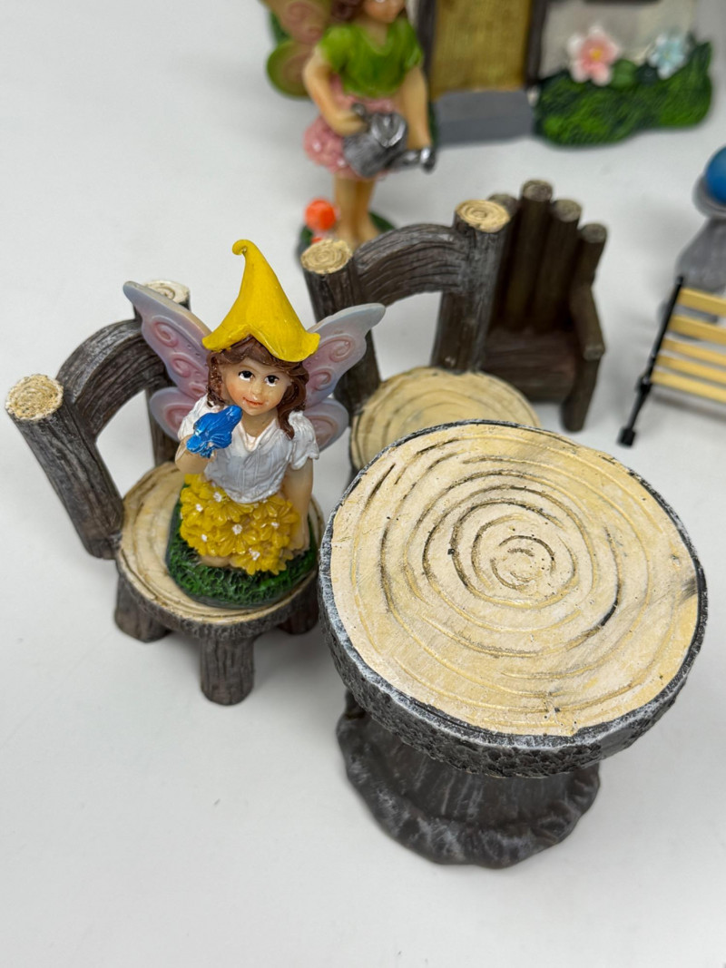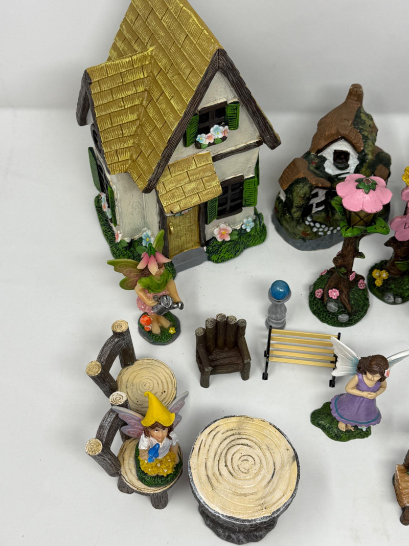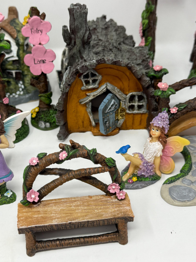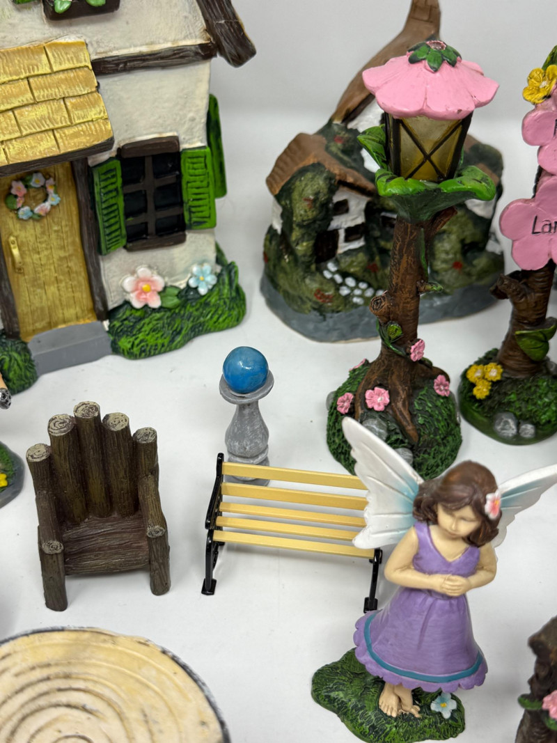 Miniature fairy garden furniture and accessories. Fairies and Fairy Village Play Set 23 pieces of cast resin, one wood and one ceramic. For indoor or outdoor display.