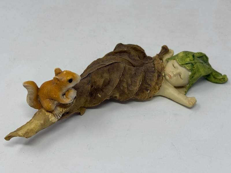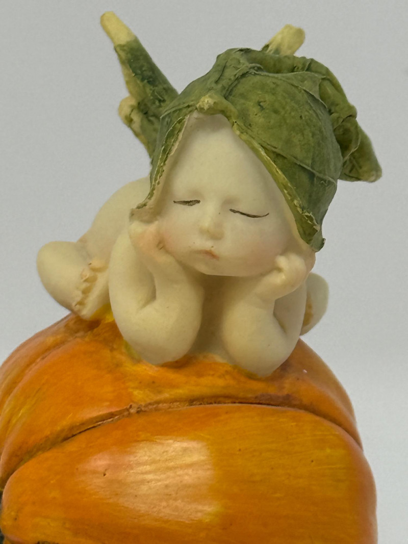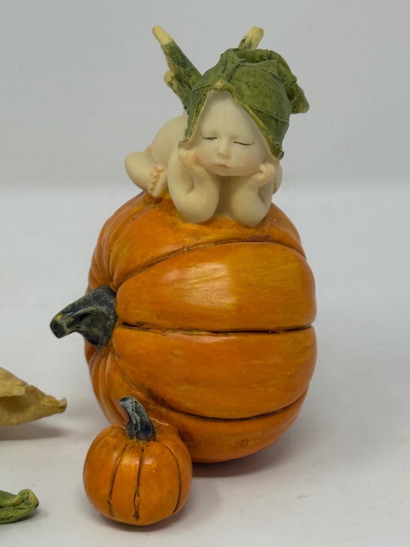 Top Collection Miniature Fairy Garden and Terrarium Fairy Babies. One on Orange Pumpkin Figurine. It is made of hand-painted quality designer resin. 3”x2.5”x4” One baby covered by a leaf and watched by a squirrel. 6”x2.5”x2”