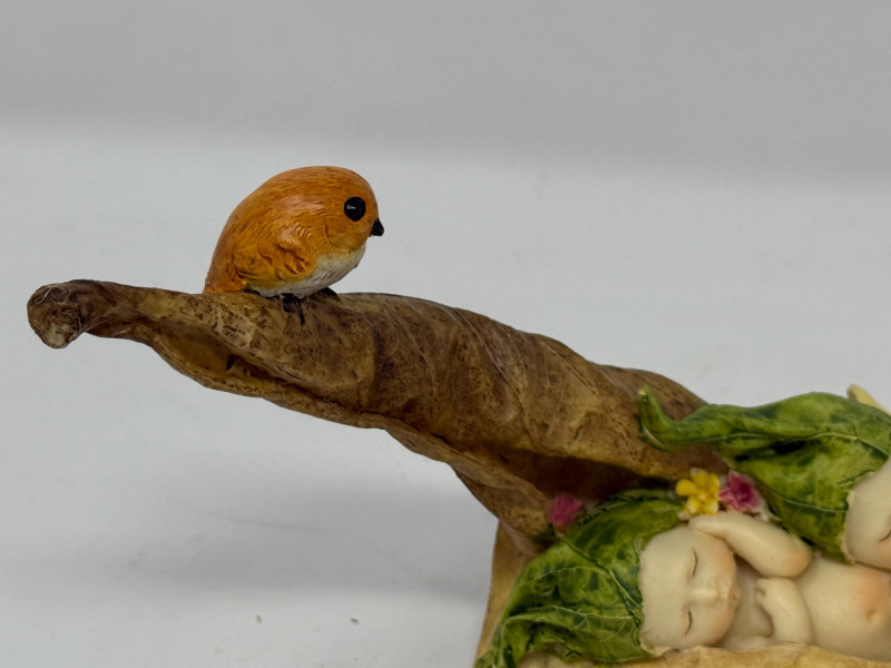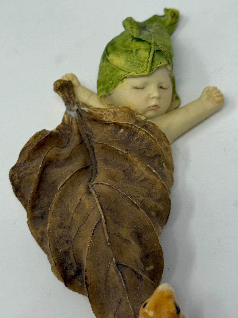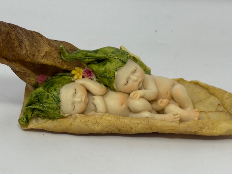 Two babies cuddled on a leaf. 8”x2.5”x3”