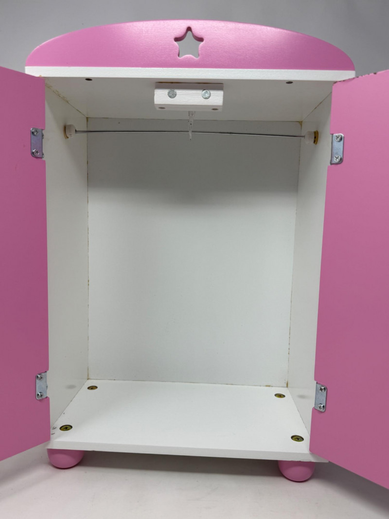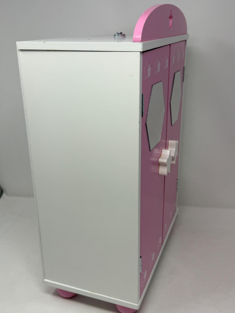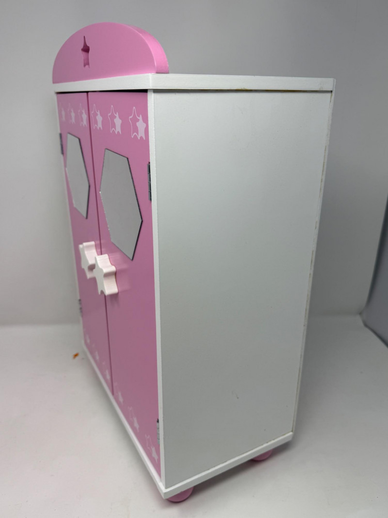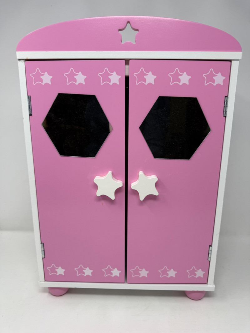Double Door Doll Clothes Wardrobe With Mirrors Pink and white magnetic close doors with interior hanging rod. Wood star door pulls. 11.5”x17”x6”