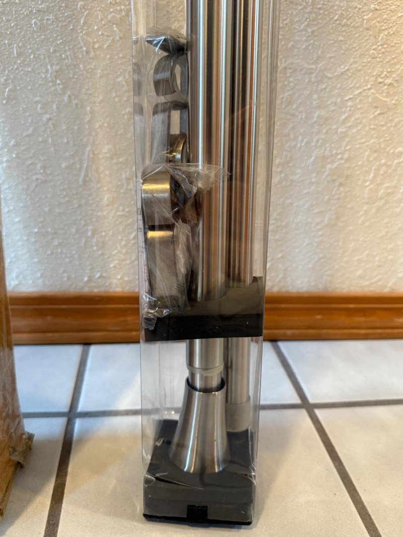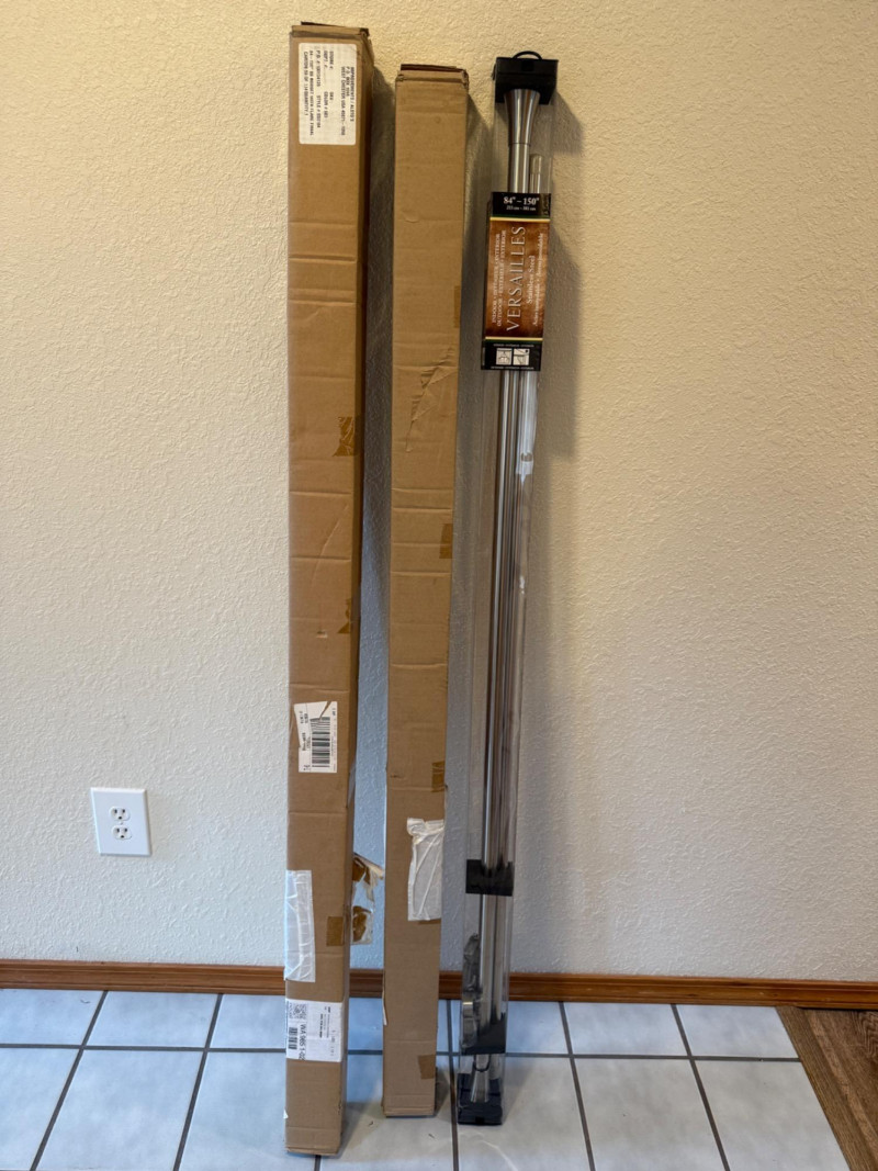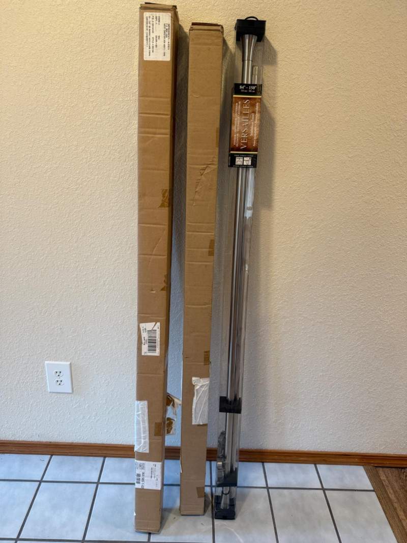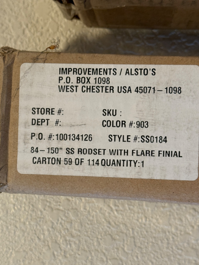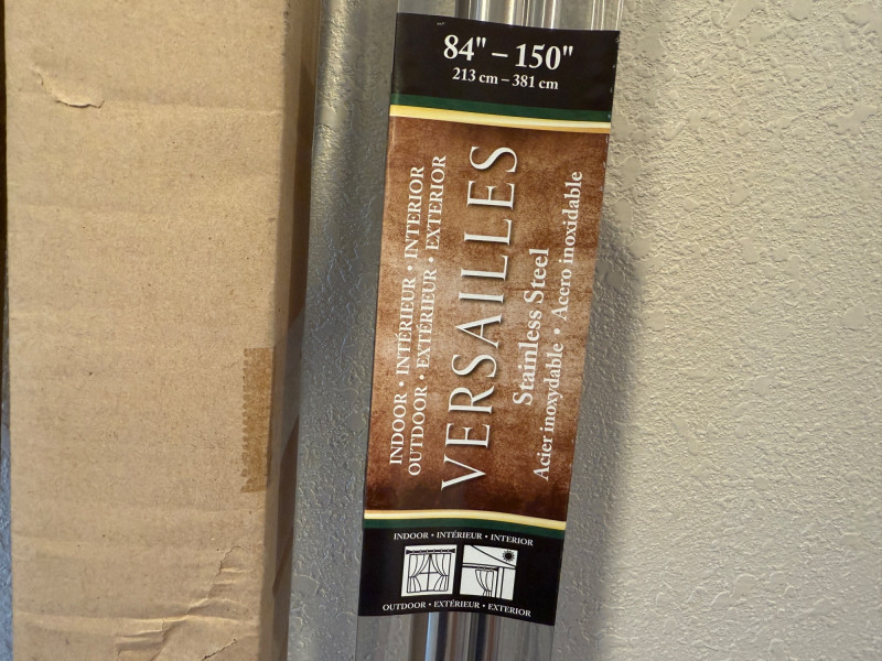 NIB (3) Stainless Steel indoor/outdoor Curtain Rods 2 are 84”-150” Stainless Steel In/Outdoor Rod Set With Flare Finials 1 - 54"-96" In original shipping boxes. Never opened.