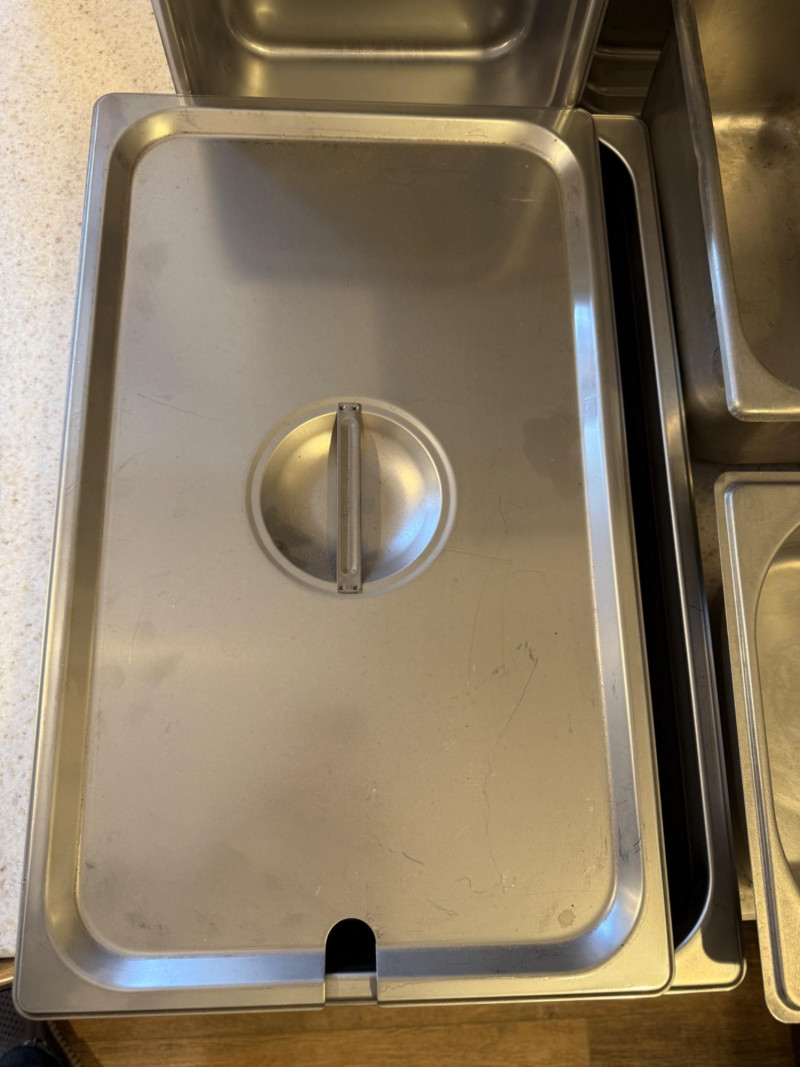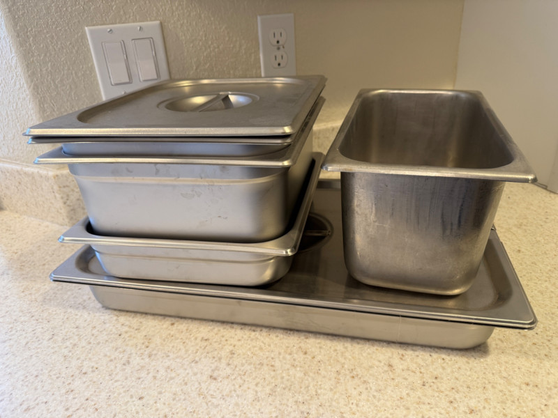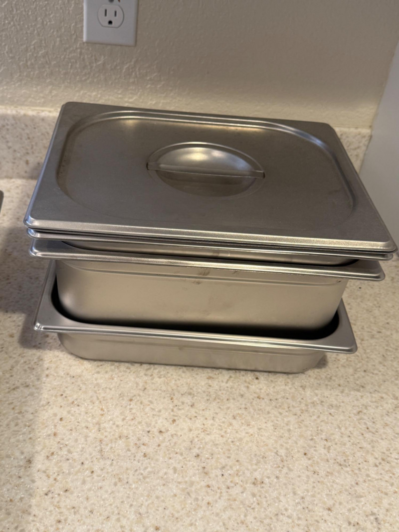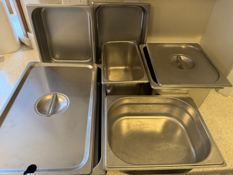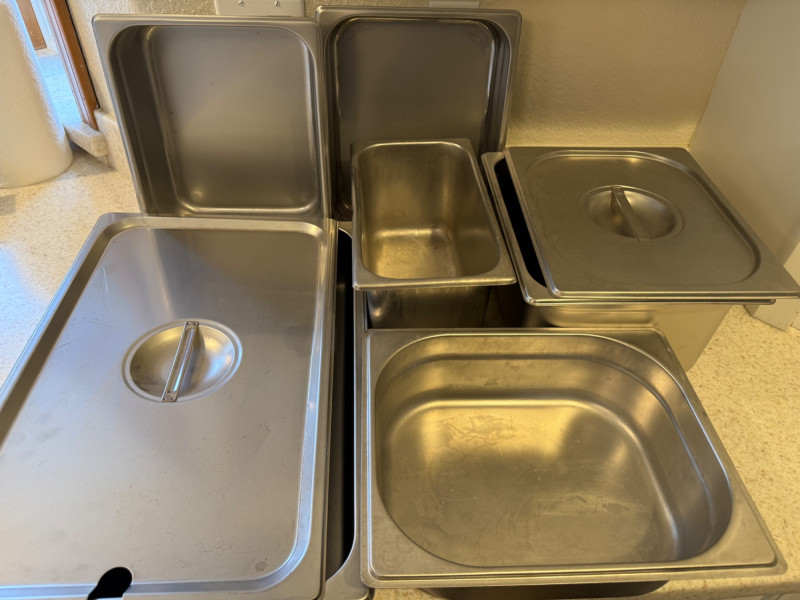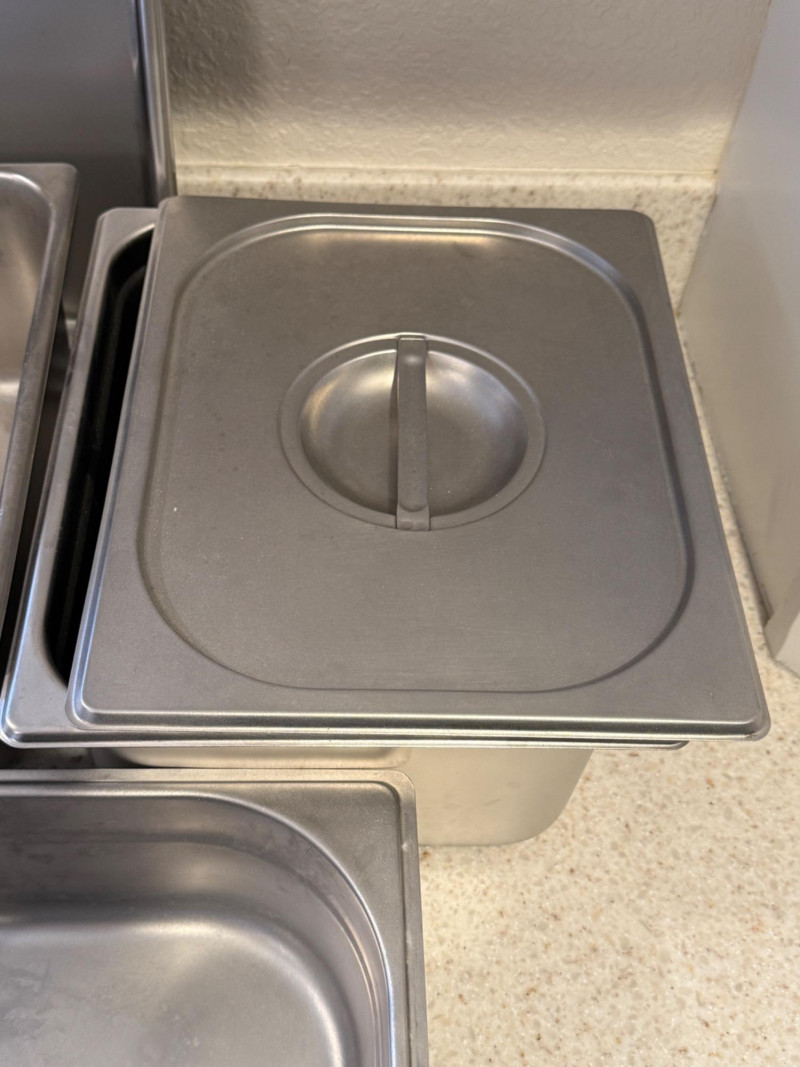 (6) Stainless Steel Steam Table Pans With 2 Lids 12.75”x21”x2.5” shallow pan with lid 10.5”x13” pans with 1 lid. 2.5”, 4”,4” & 6” deep. 6.75”x12.5”x6” deep